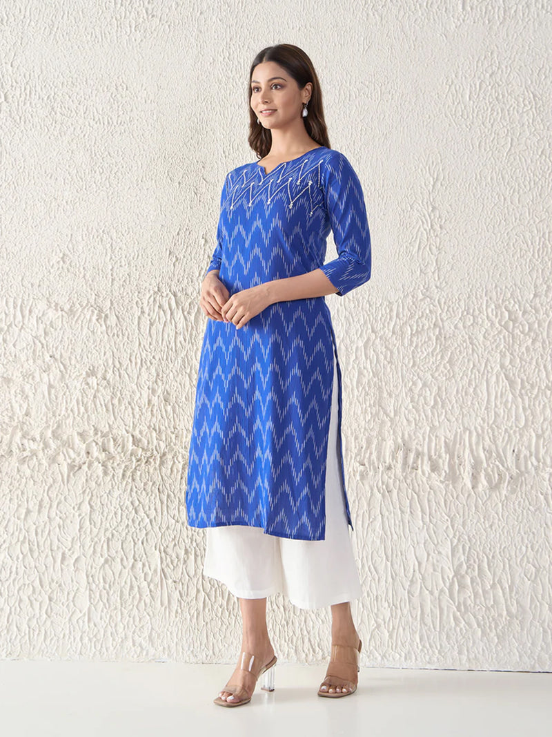 Ikkat Weave & Embroidered Cotton Blue Kurta