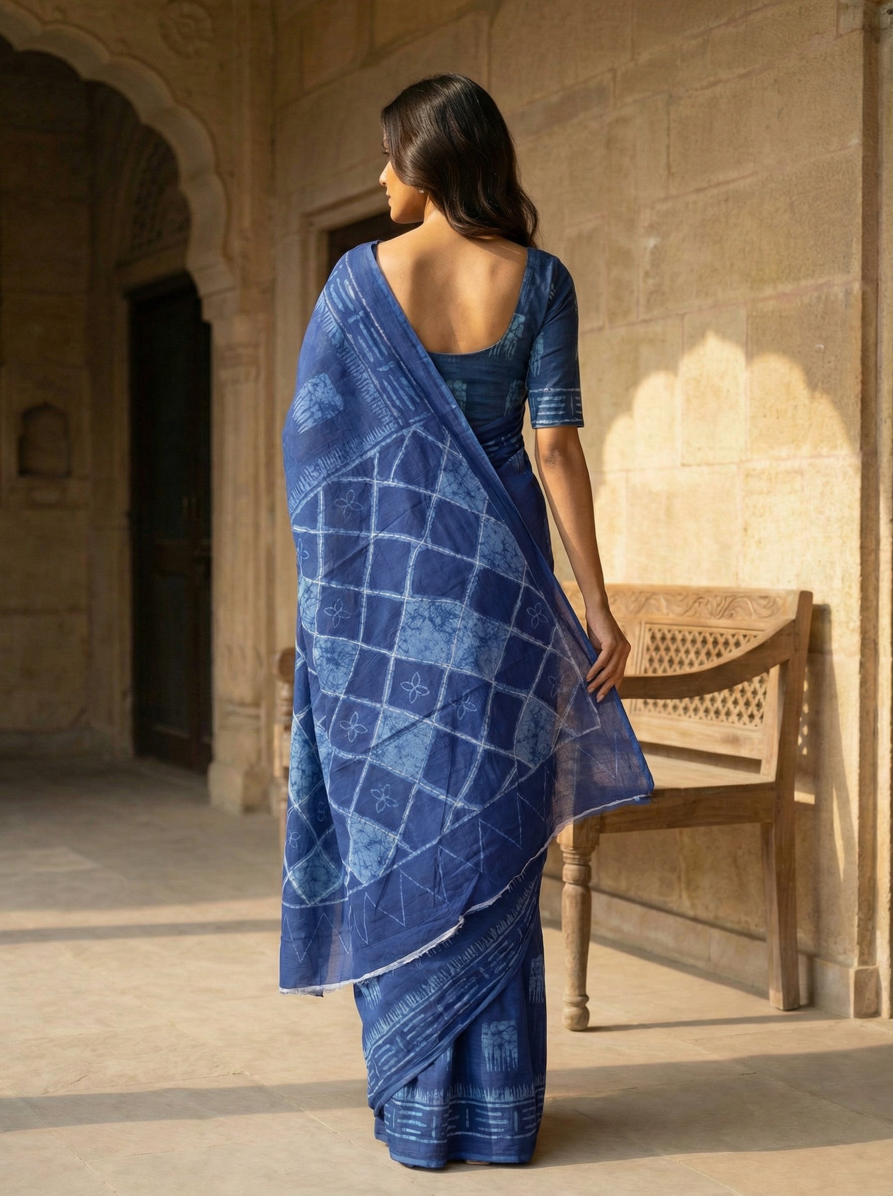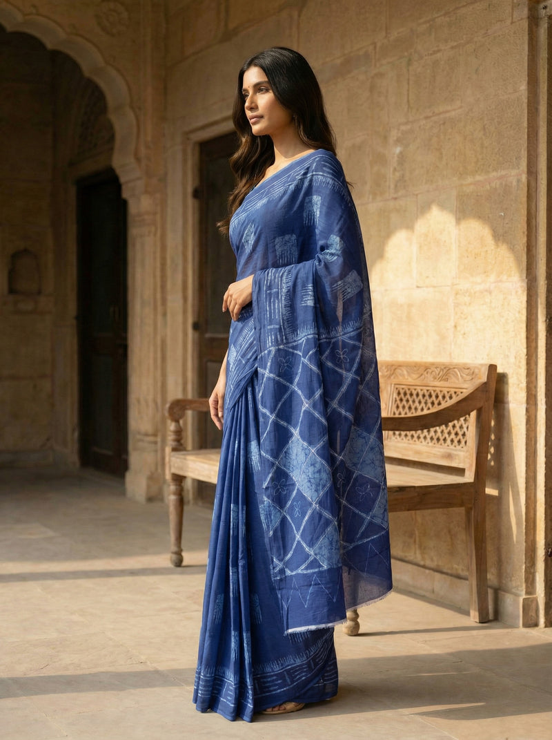 Indigo Blue Hand Block Printed Cotton Saree with Geometric Pallu