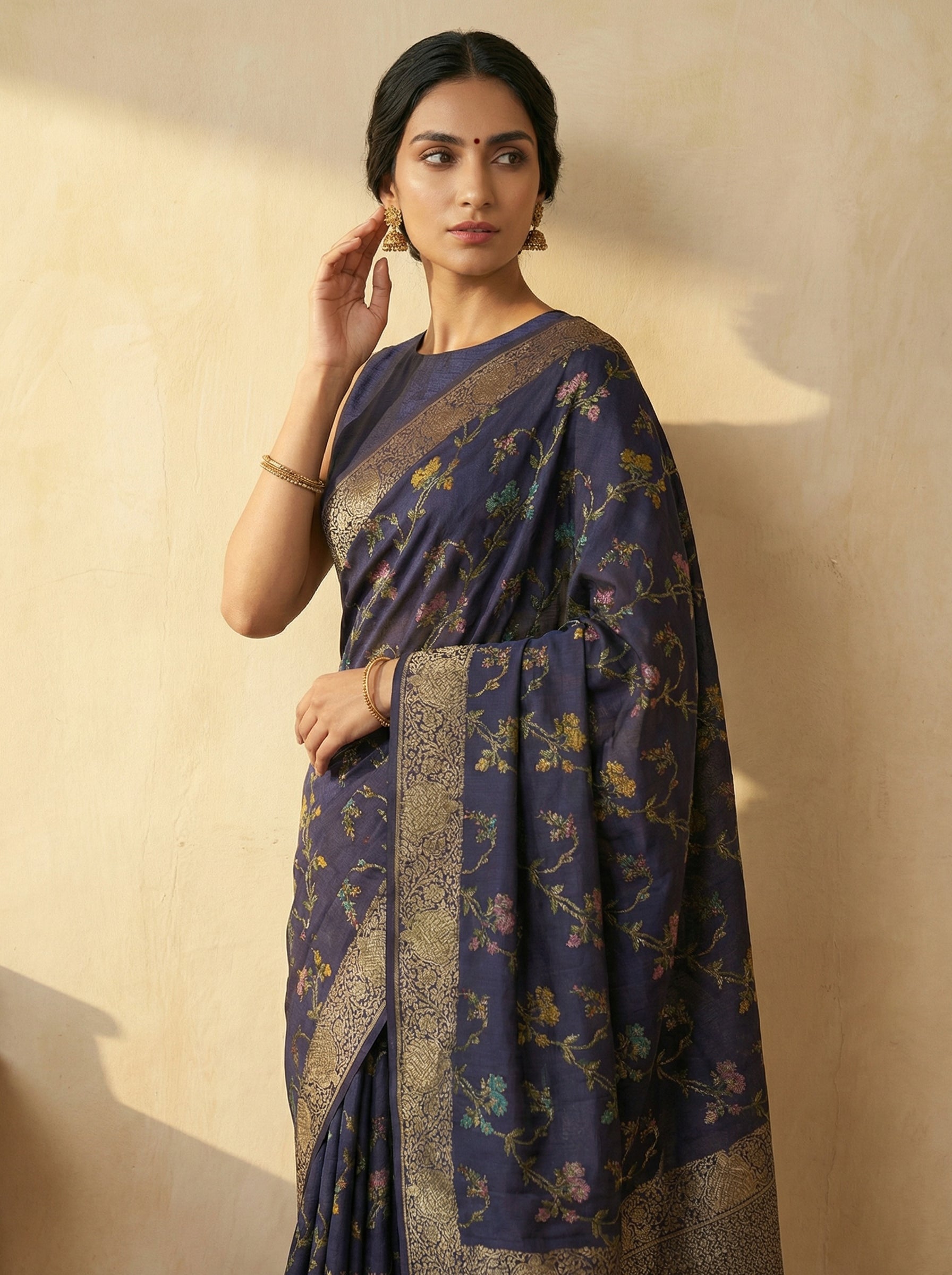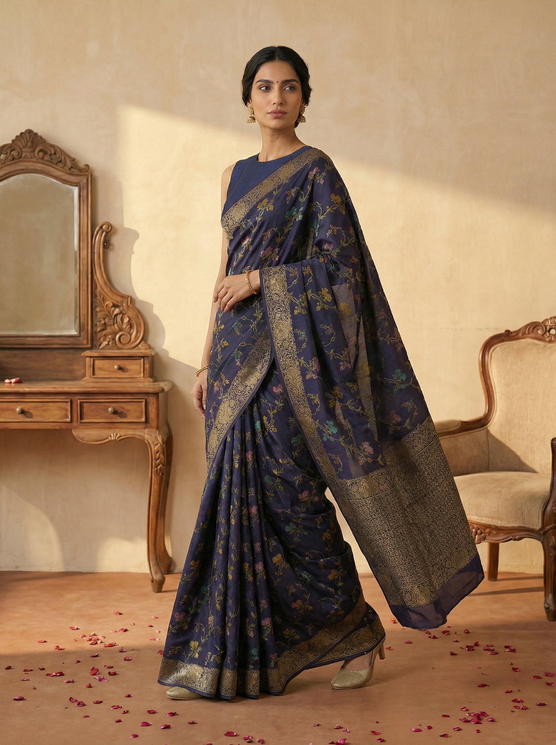 Embrace timeless elegance with this Jute Sapphire Blue Nature Trail Saree, a stunning blend of traditional craftsmanship and natural materials. Woven from premium jute fabric, this saree features a captivating sapphire blue hue that evokes the serenity of nature. The intricate Nature Trail design showcases detailed patterns inspired by botanical motifs, making it perfect for cultural celebrations, festive occasions, or everyday wear. The breathable jute composition ensures comfort in warm climates while maintaining its structured drape. A versatile piece that honors heritage while celebrating contemporary style, this saree is ideal for those seeking authentic, eco-conscious fashion.