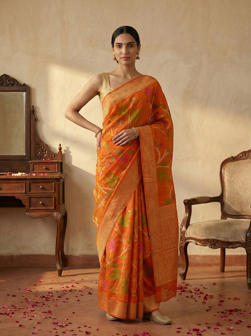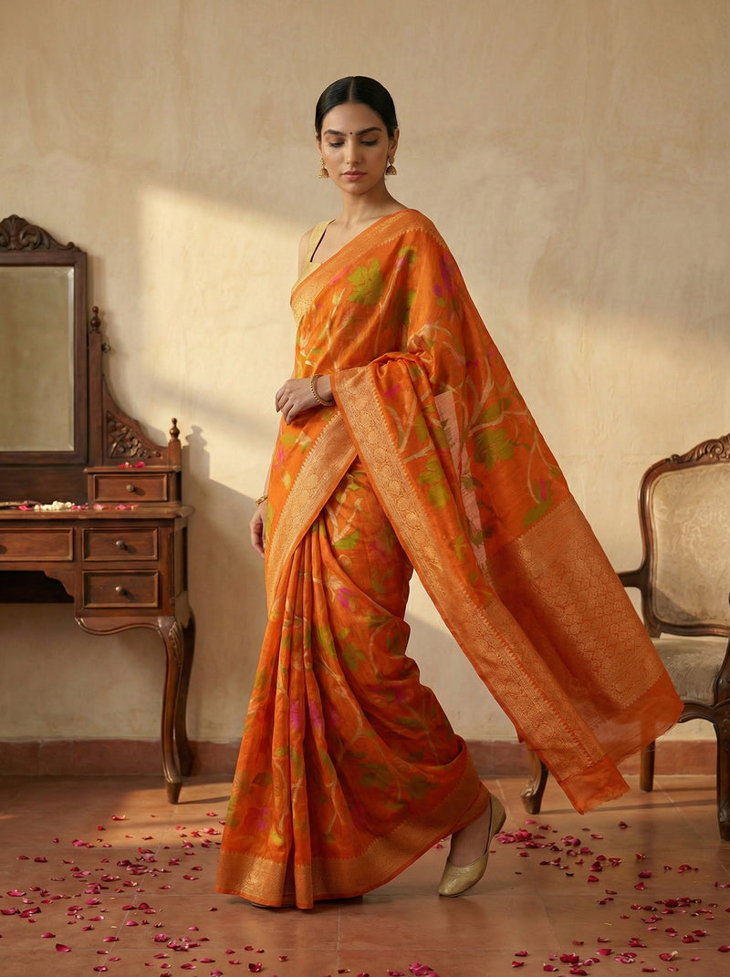 Jute Sunset Orange Botanical Print Saree