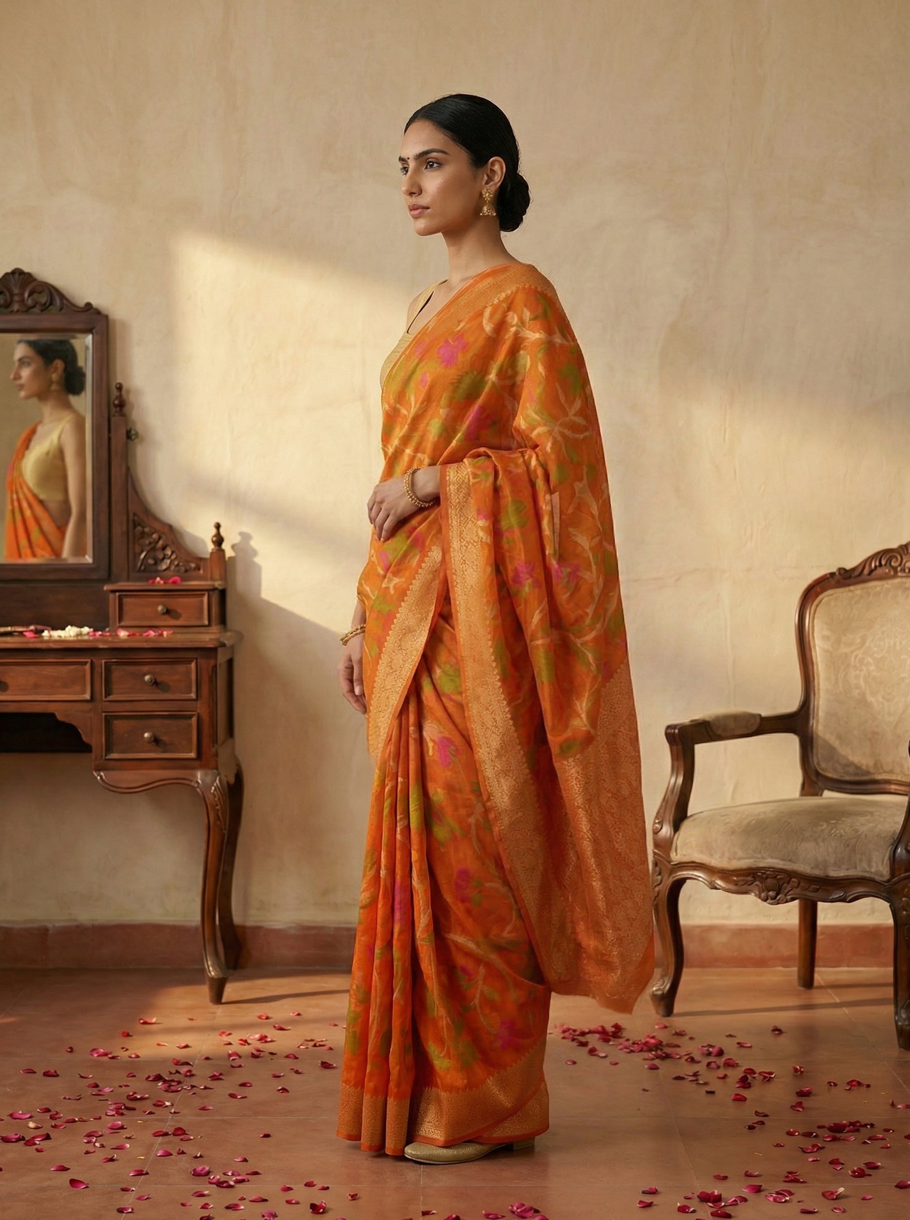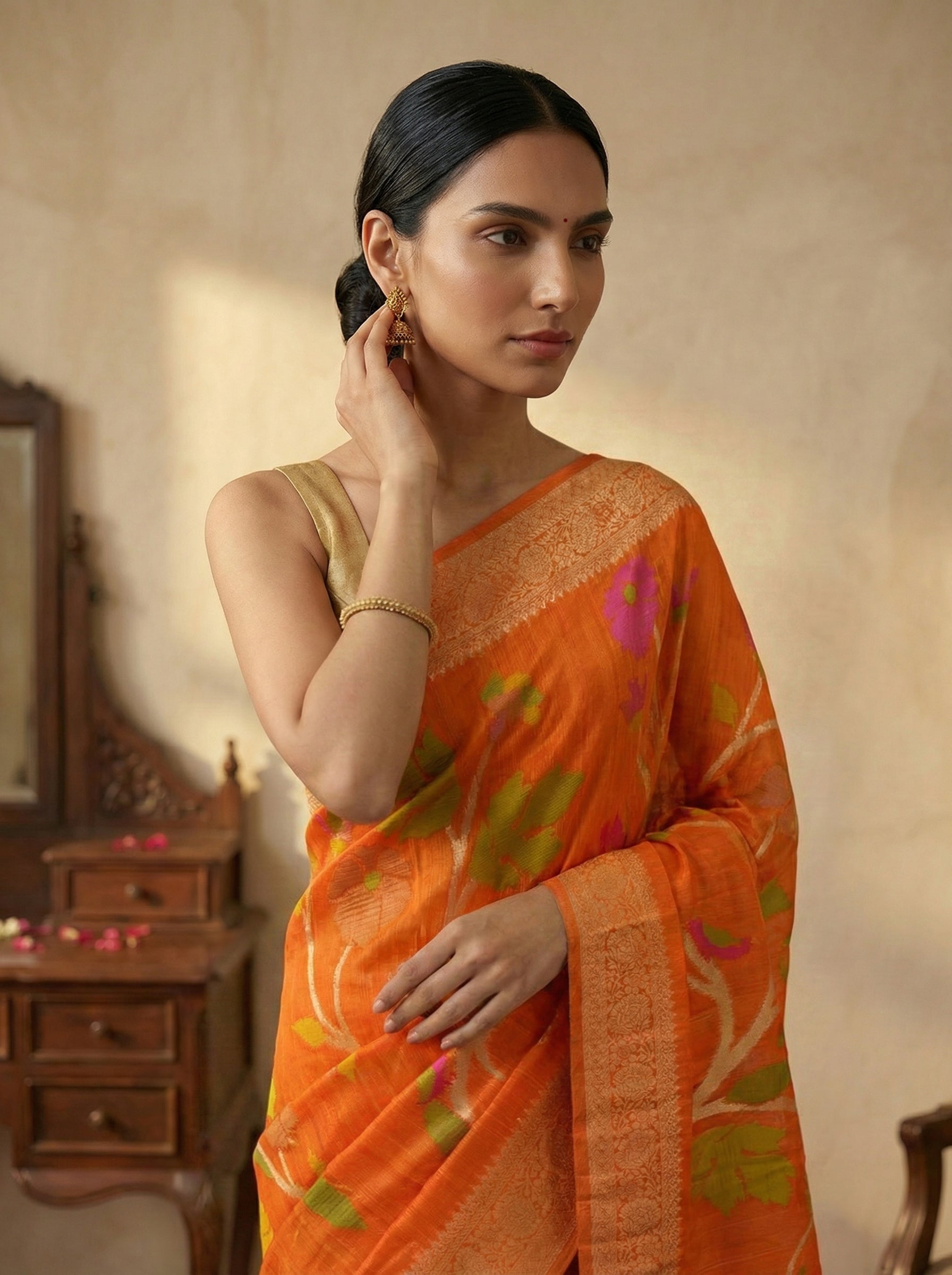Drape yourself in timeless elegance with this stunning Jute Sunset Orange Botanical Print Saree. Crafted from natural jute fabric, this saree features a captivating botanical print in warm sunset orange tones that brings nature's beauty to your wardrobe. The breathable, eco-friendly material makes it perfect for warm weather wear while maintaining traditional saree grace. Ideal for casual outings, festive gatherings, or everyday elegance, this versatile piece celebrates sustainable fashion without compromising on style.