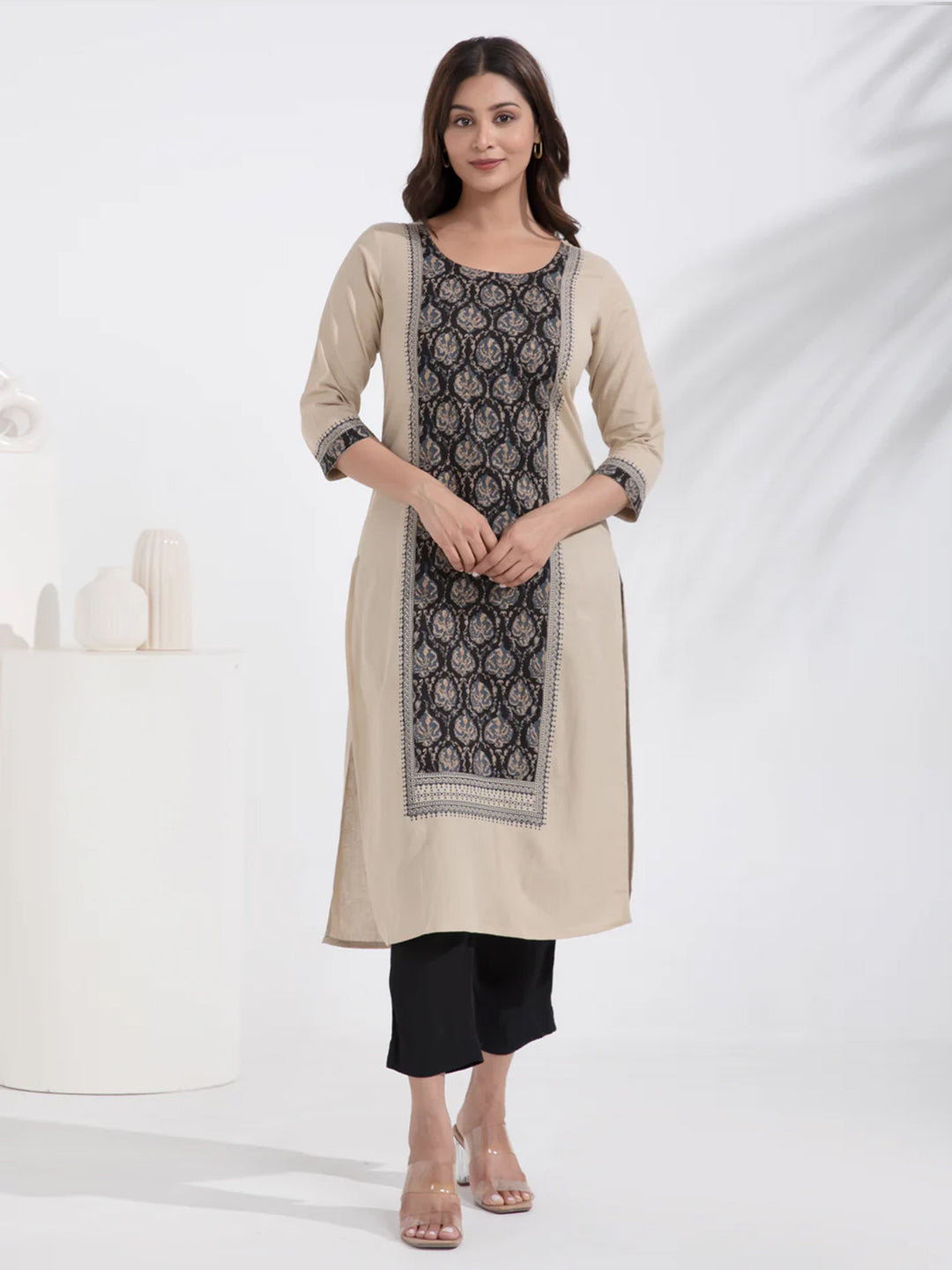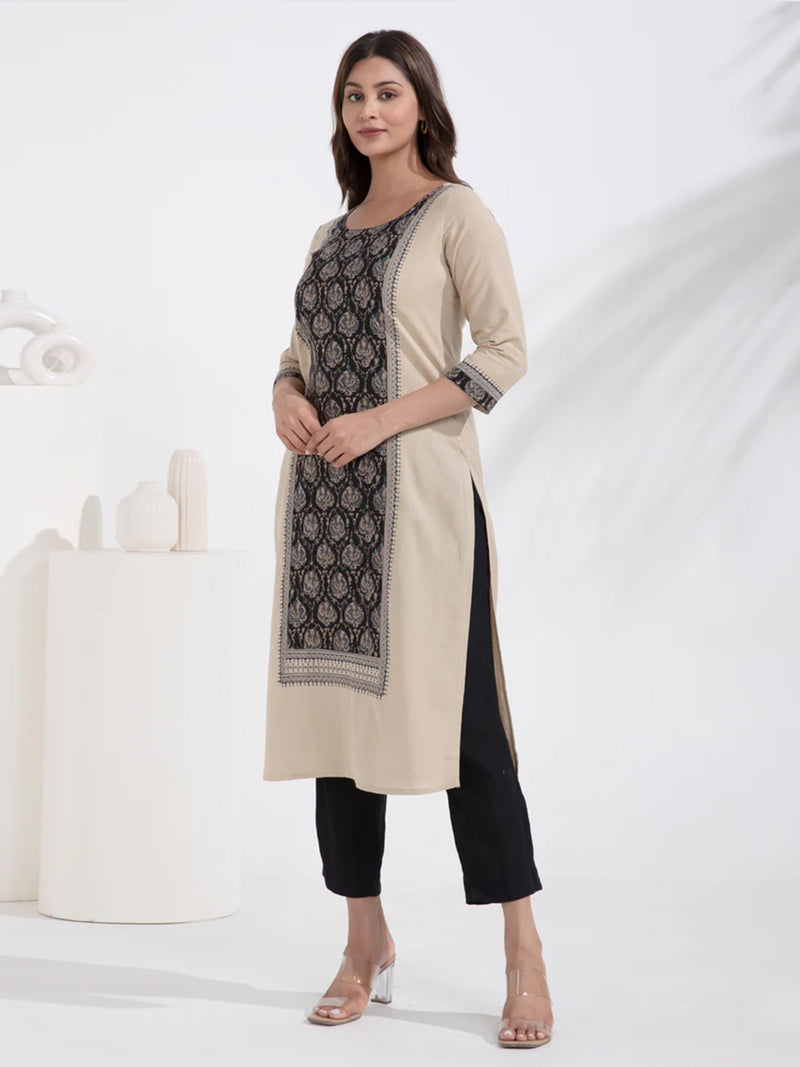 Kalamkari Printed Paneled Beige Cotton Kurta
