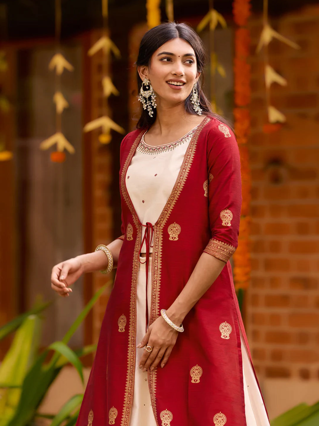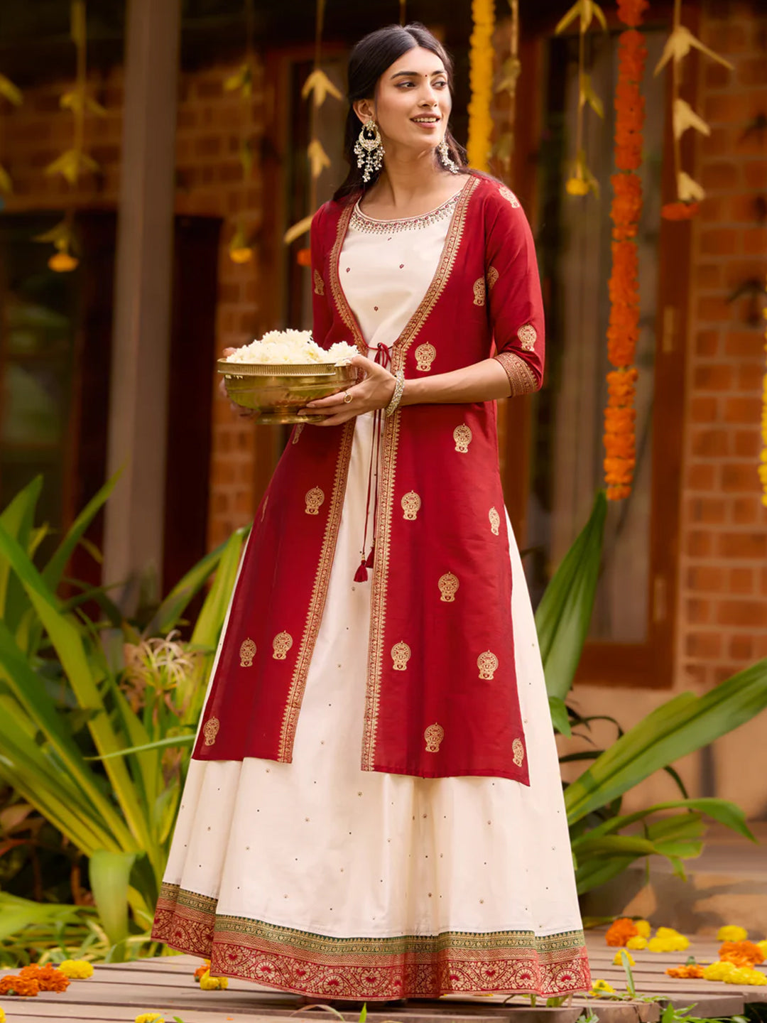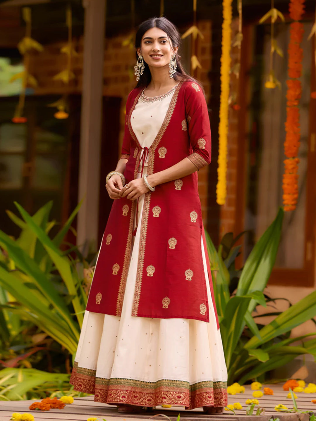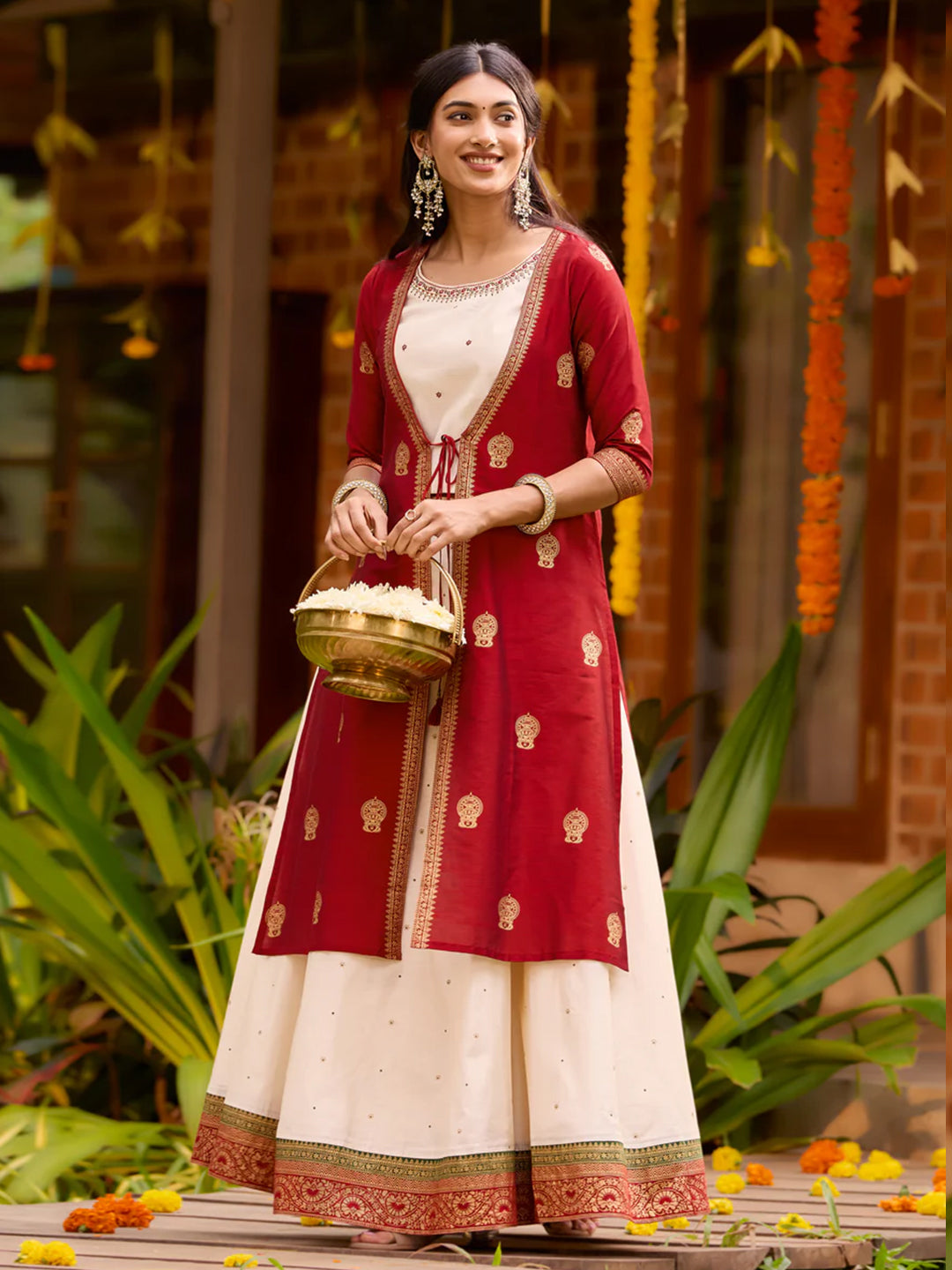 Kathakali Printed Off-White & Red Skirtset with Front Slit Jacket