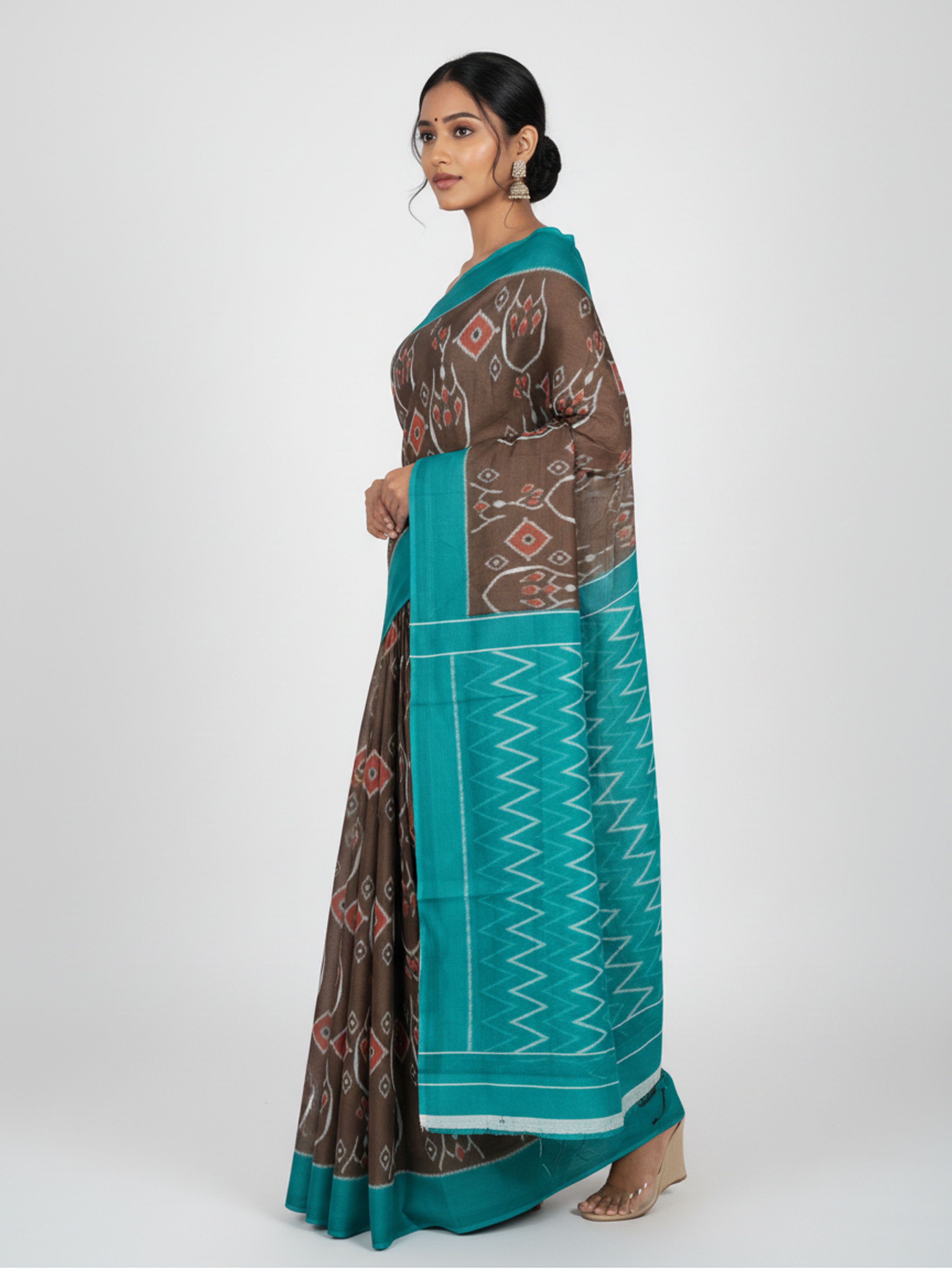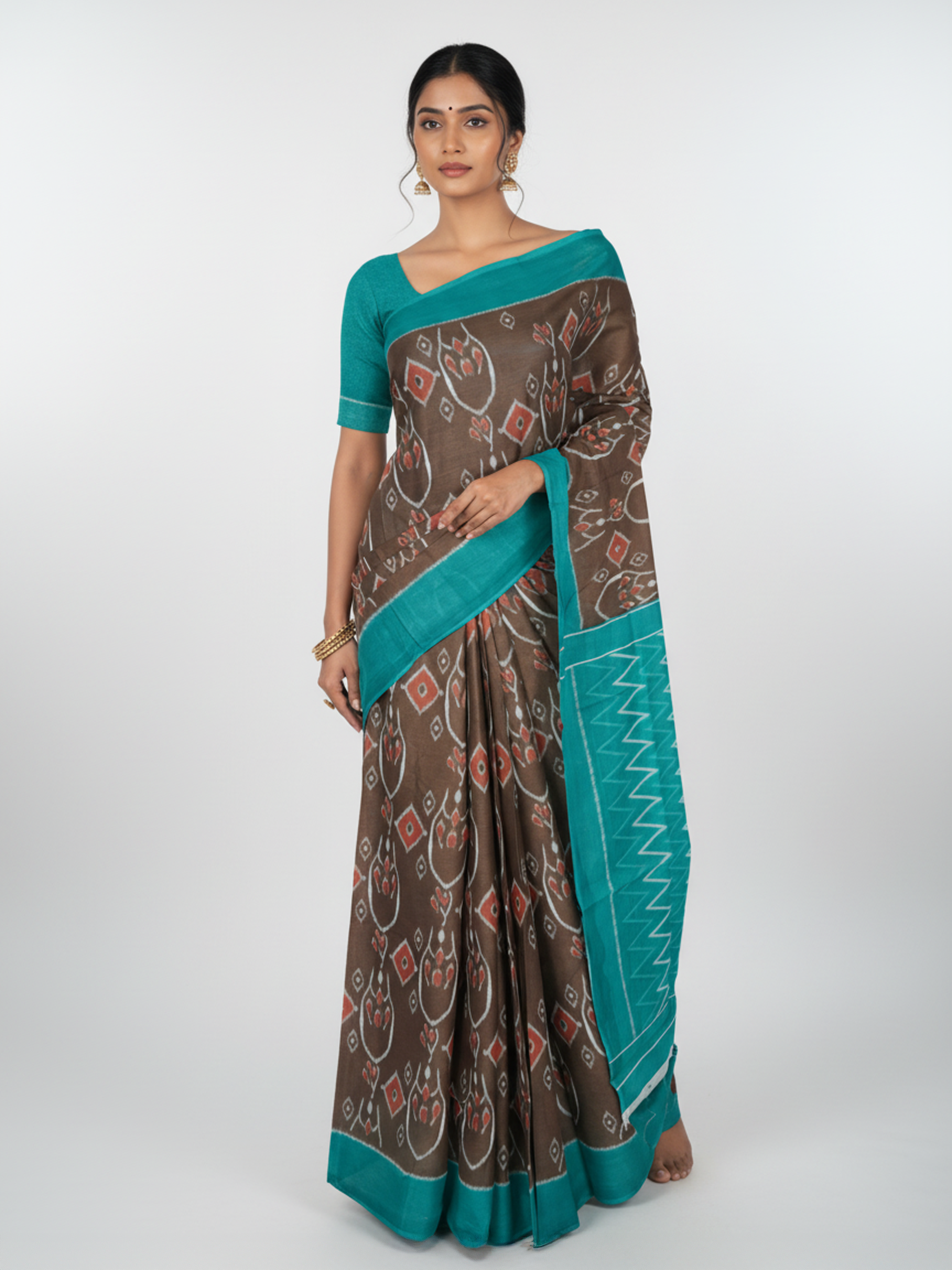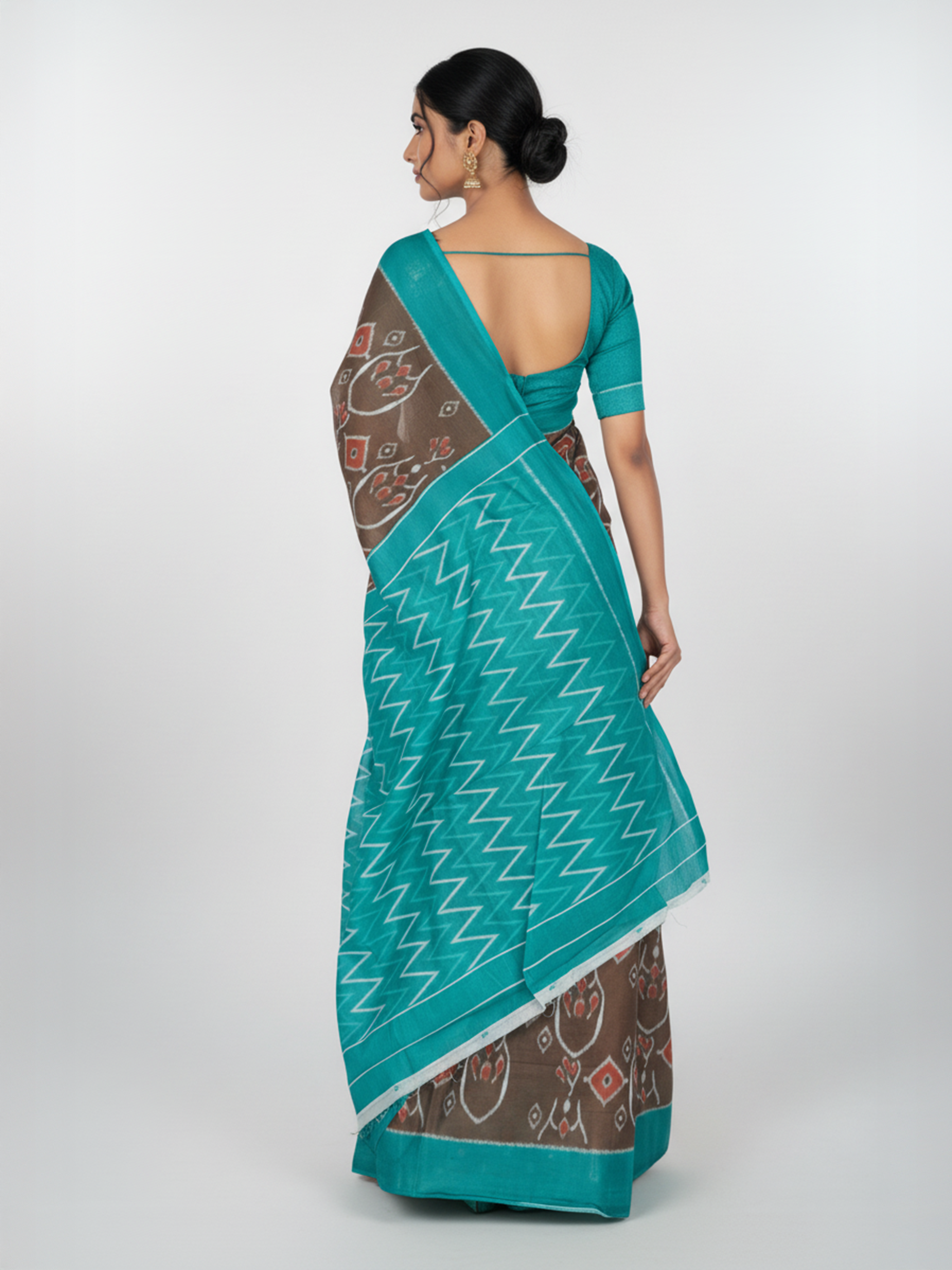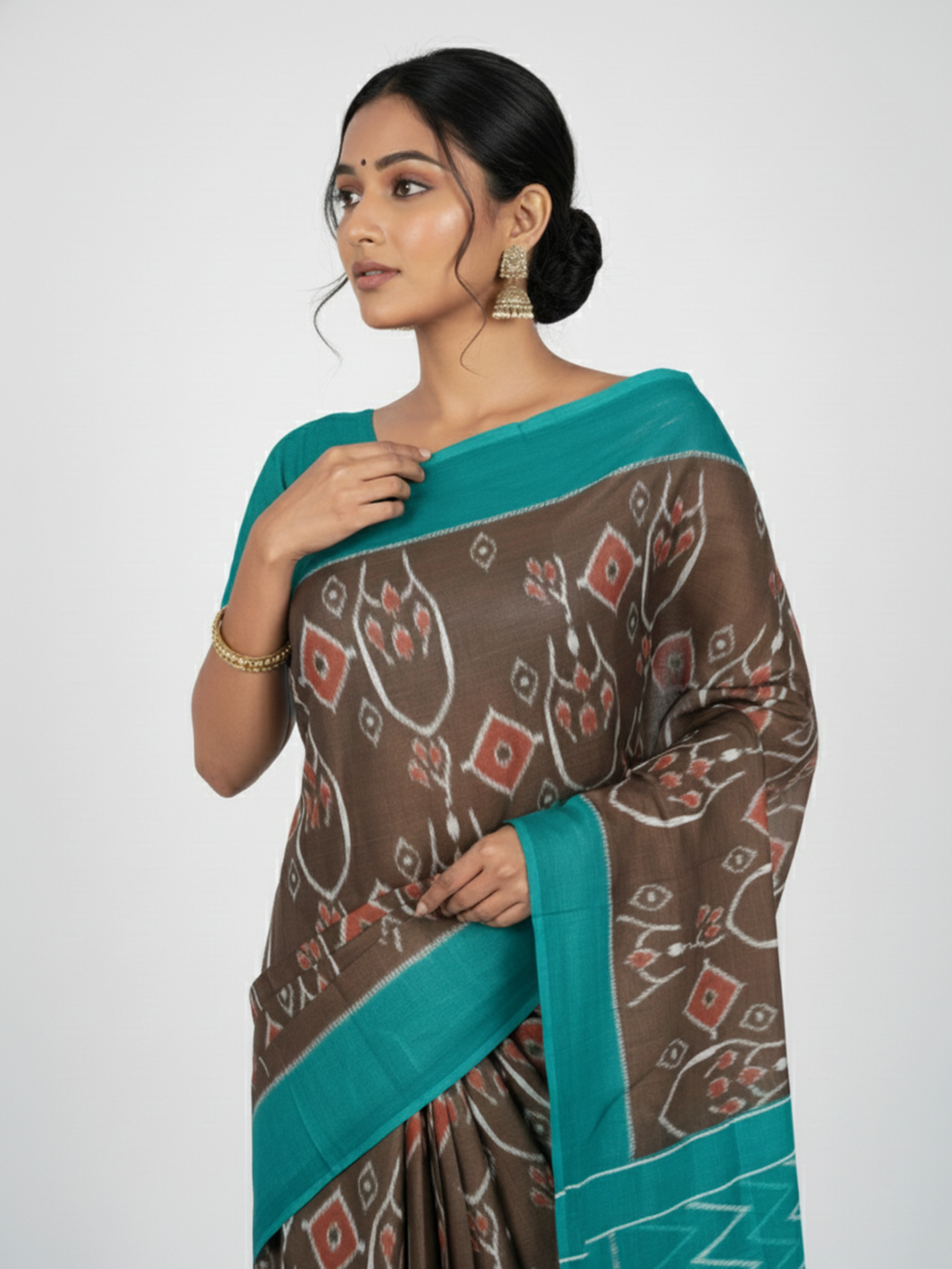 This light brown soft cotton saree is designed for effortless, season-round elegance. The printed body brings a subtle artistic charm, while the contrast printed pallu introduces a refined visual balance. The saree is finished with a contrast printed border that adds definition to the drape without overwhelming its understated tone. Paired with a complementary teal blue blouse, the ensemble achieves a harmonious and stylish look.