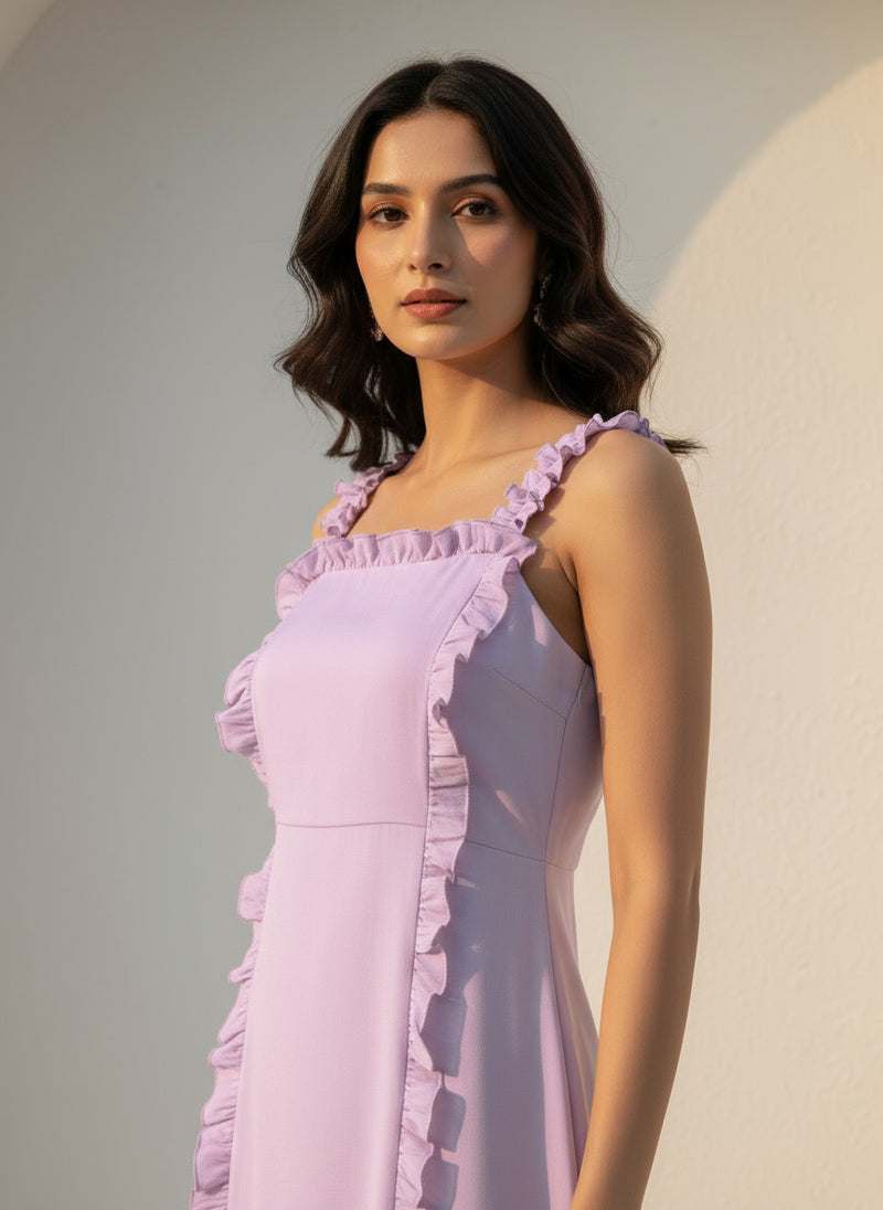 Chic and graceful, this sleeveless long flared dress in Cotton Poplin fabric features a soft lavender hue with a square neckline and frilled design — a dreamy choice in dresses for women.