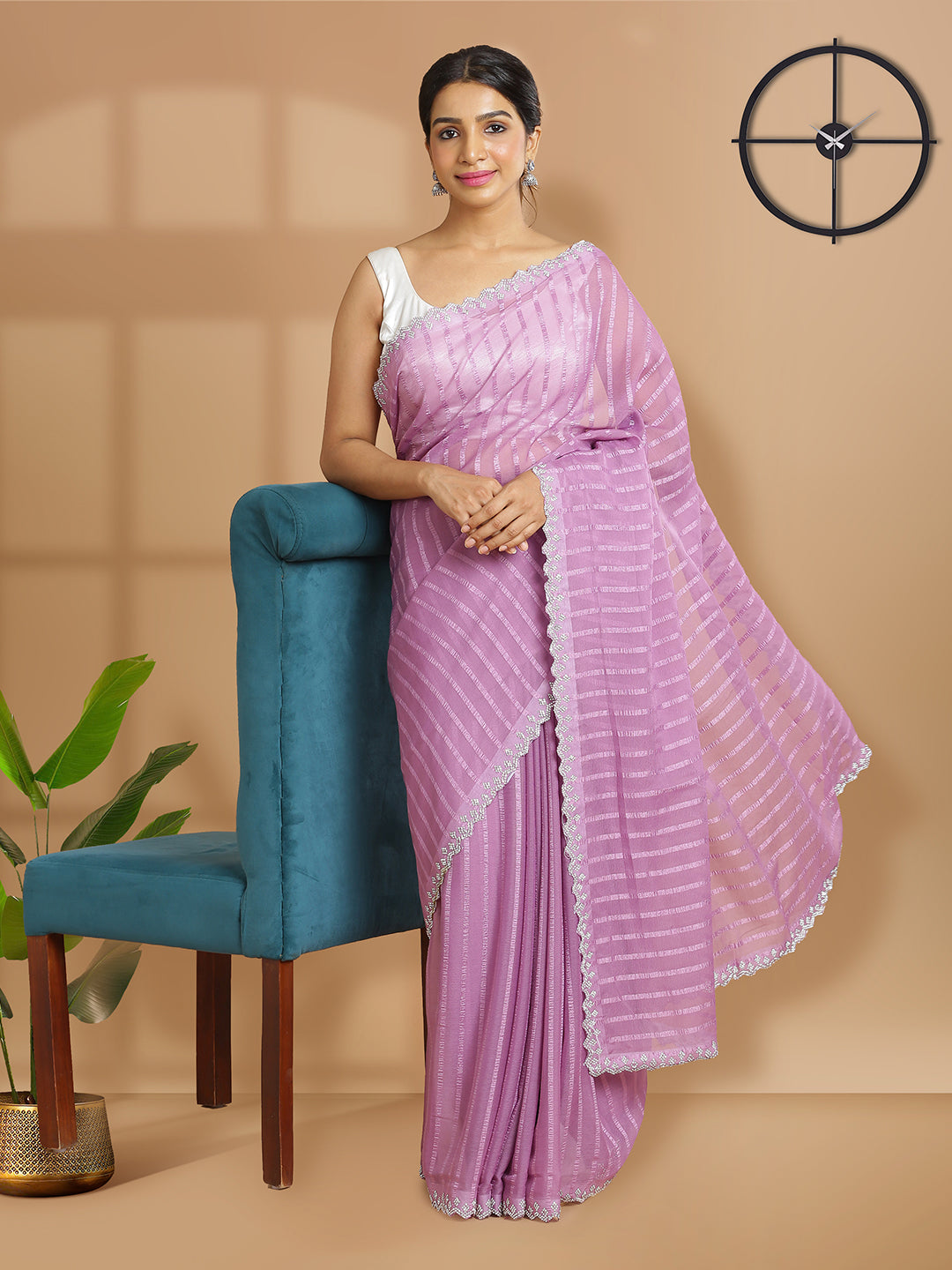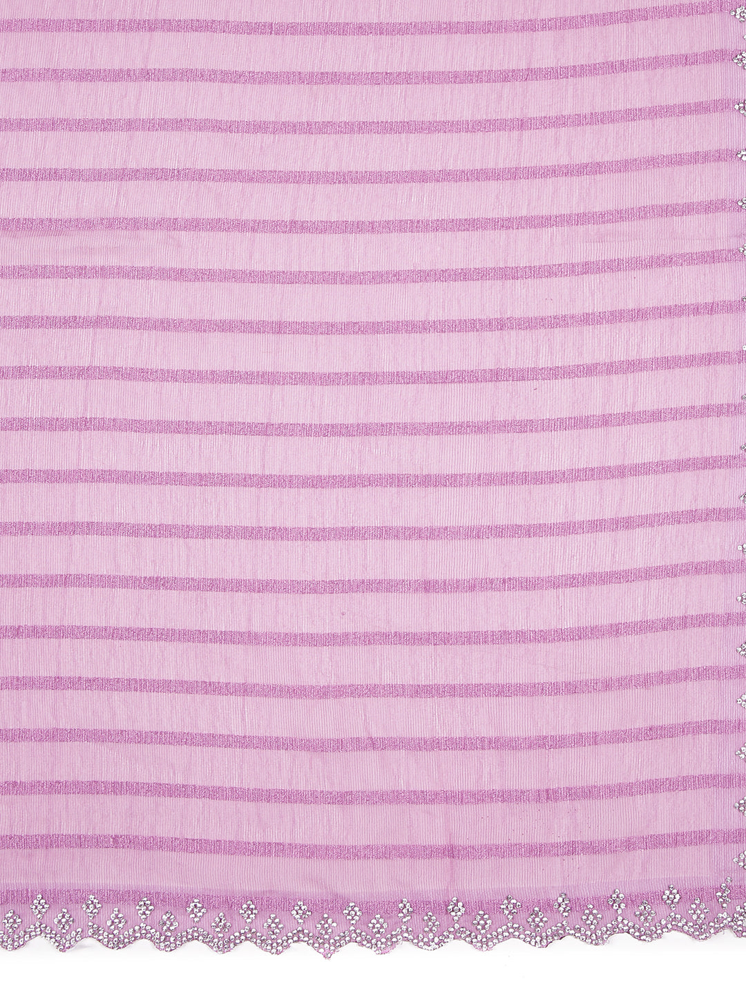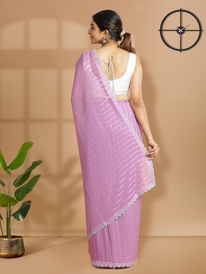 Add a touch of subtle elegance with this light purple georgette saree featuring delicate self stripes running throughout the body. Lightweight and graceful, it’s perfect for both casual and formal occasions.