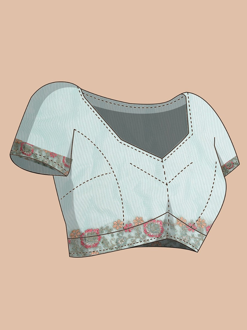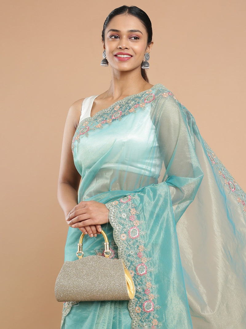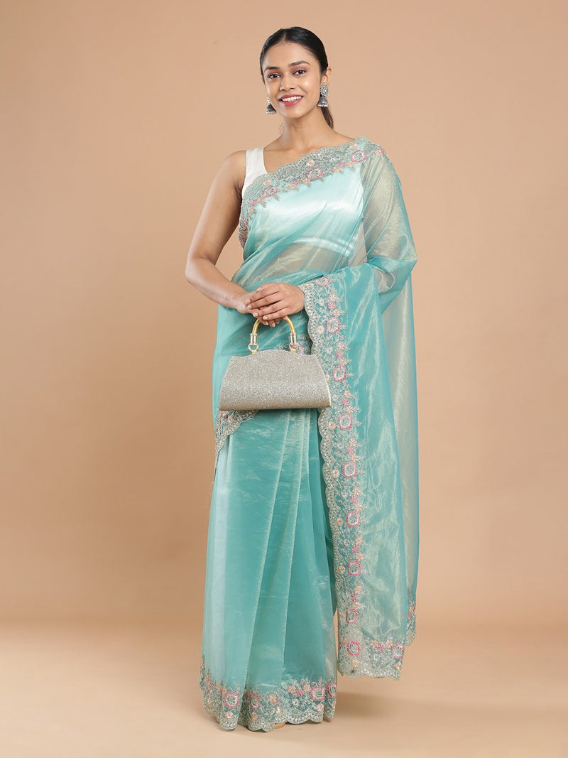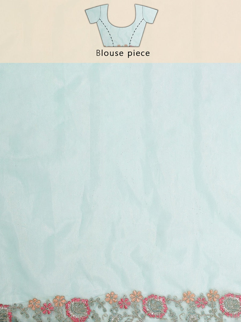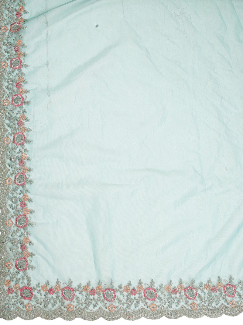 Light Teal Blue Shimmer Net Saree With Embroidery Scalloped Border