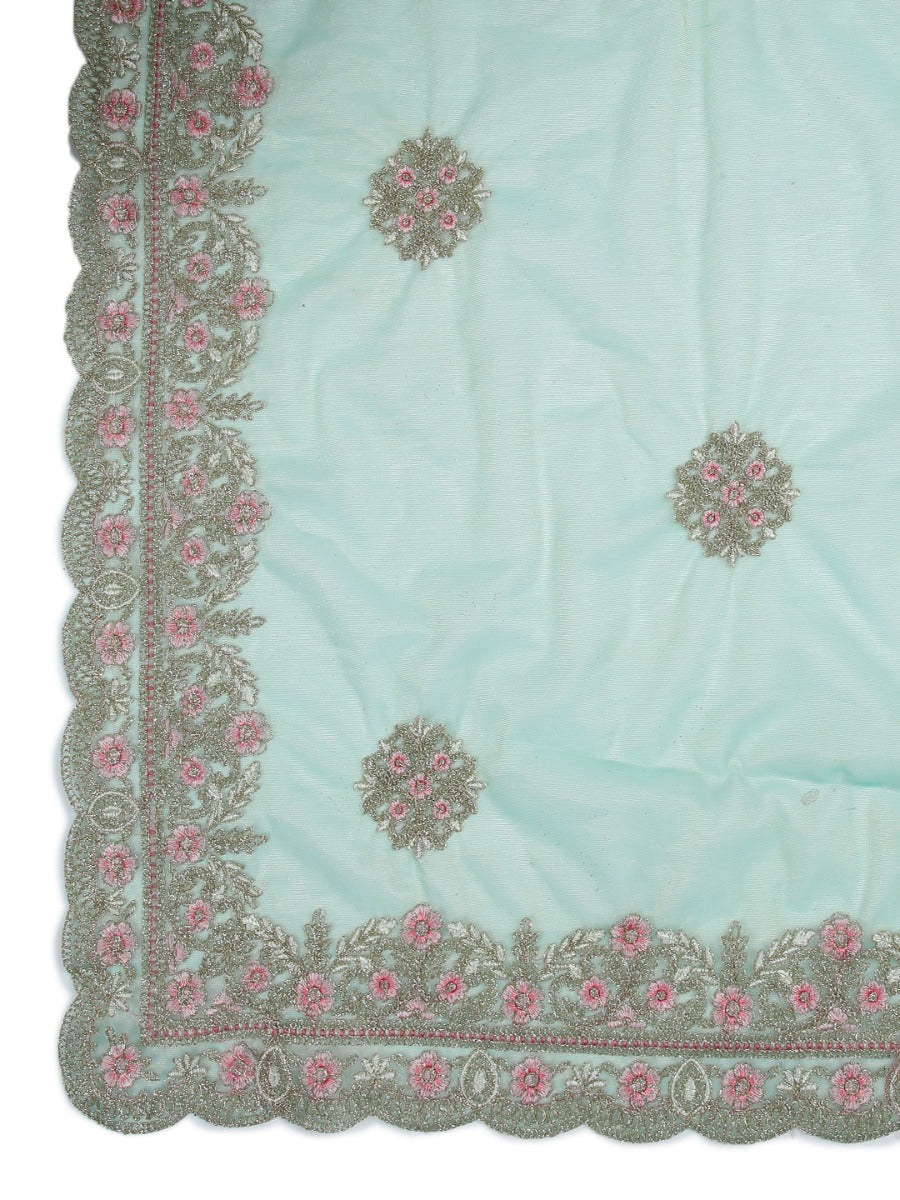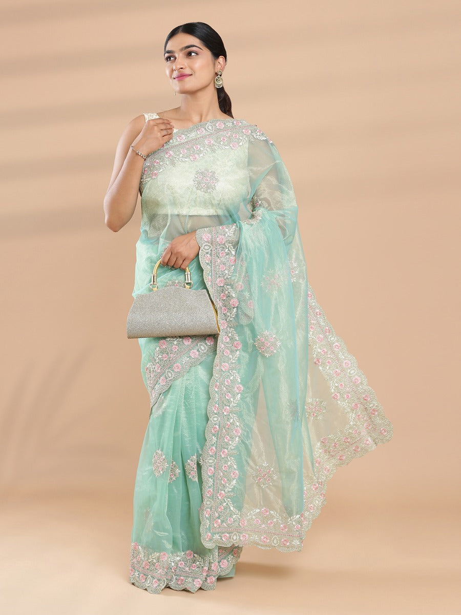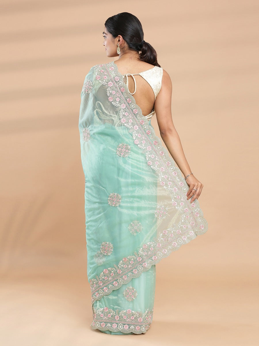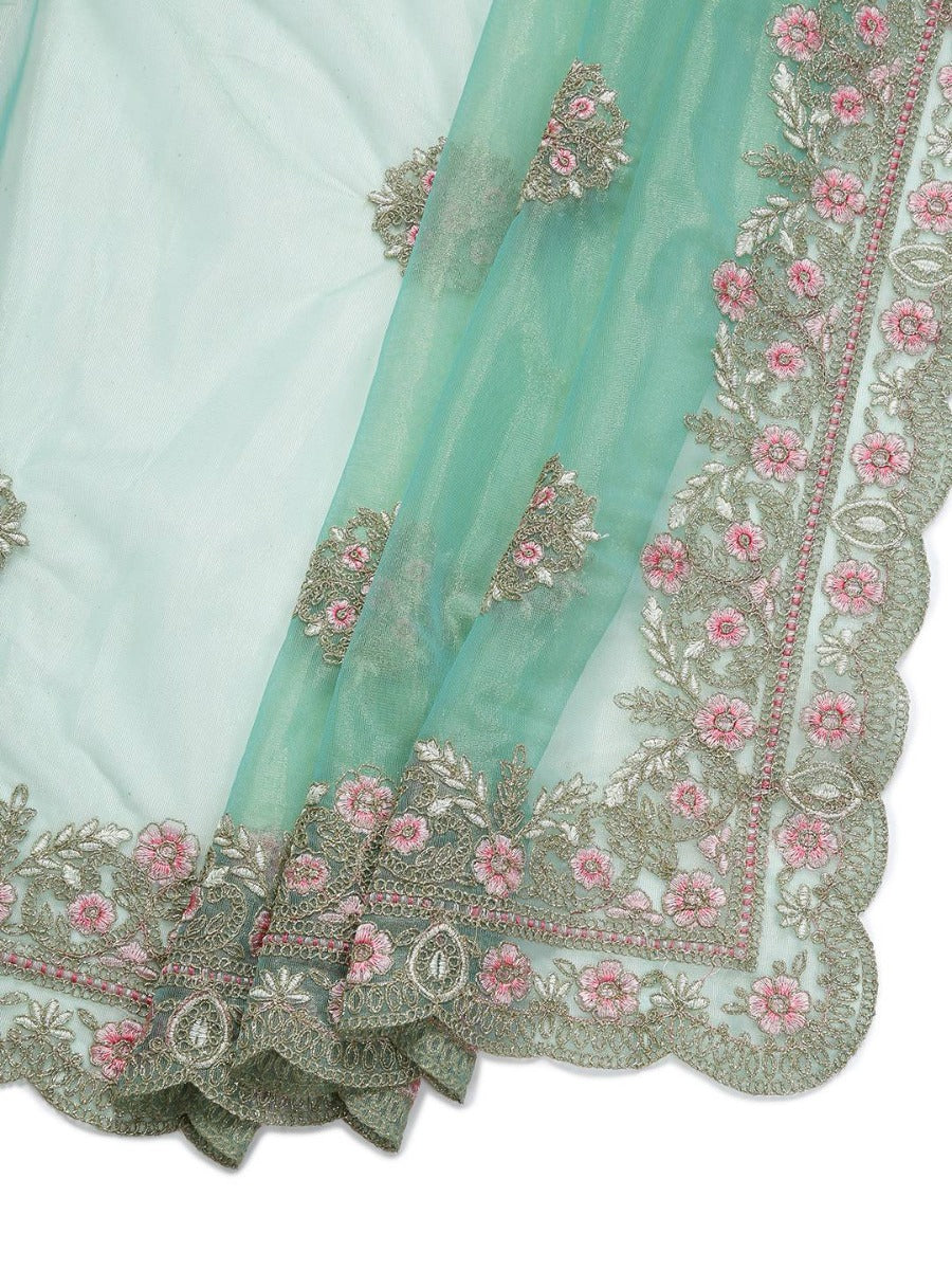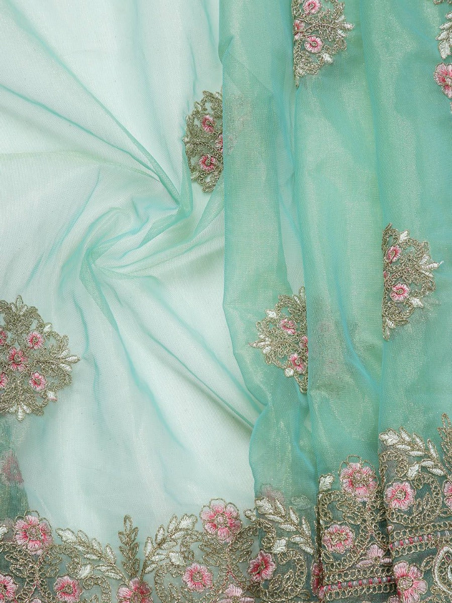 Light Teal Green & Golden Double Shaded Shimmer Net Saree With Embroidery Design