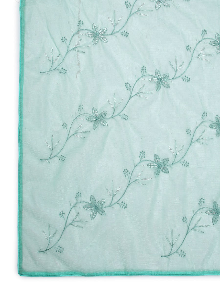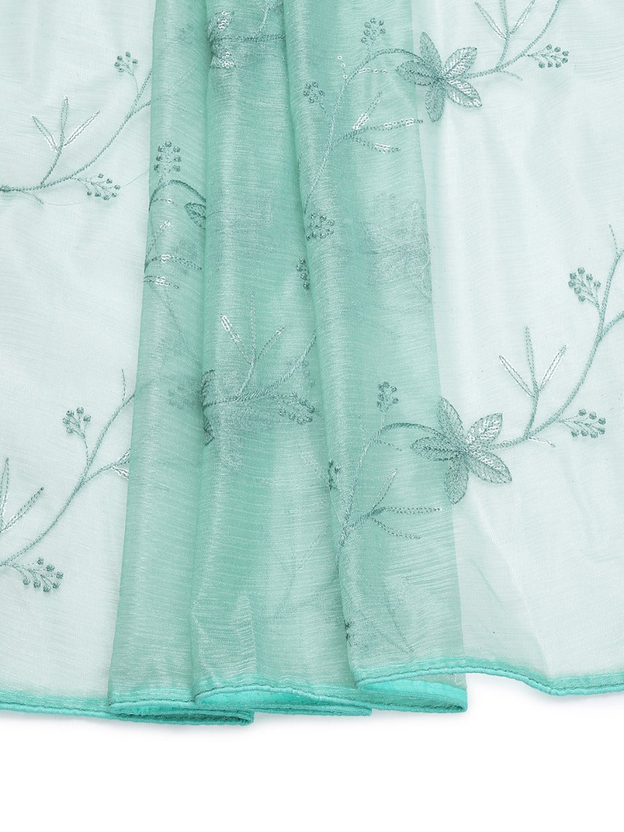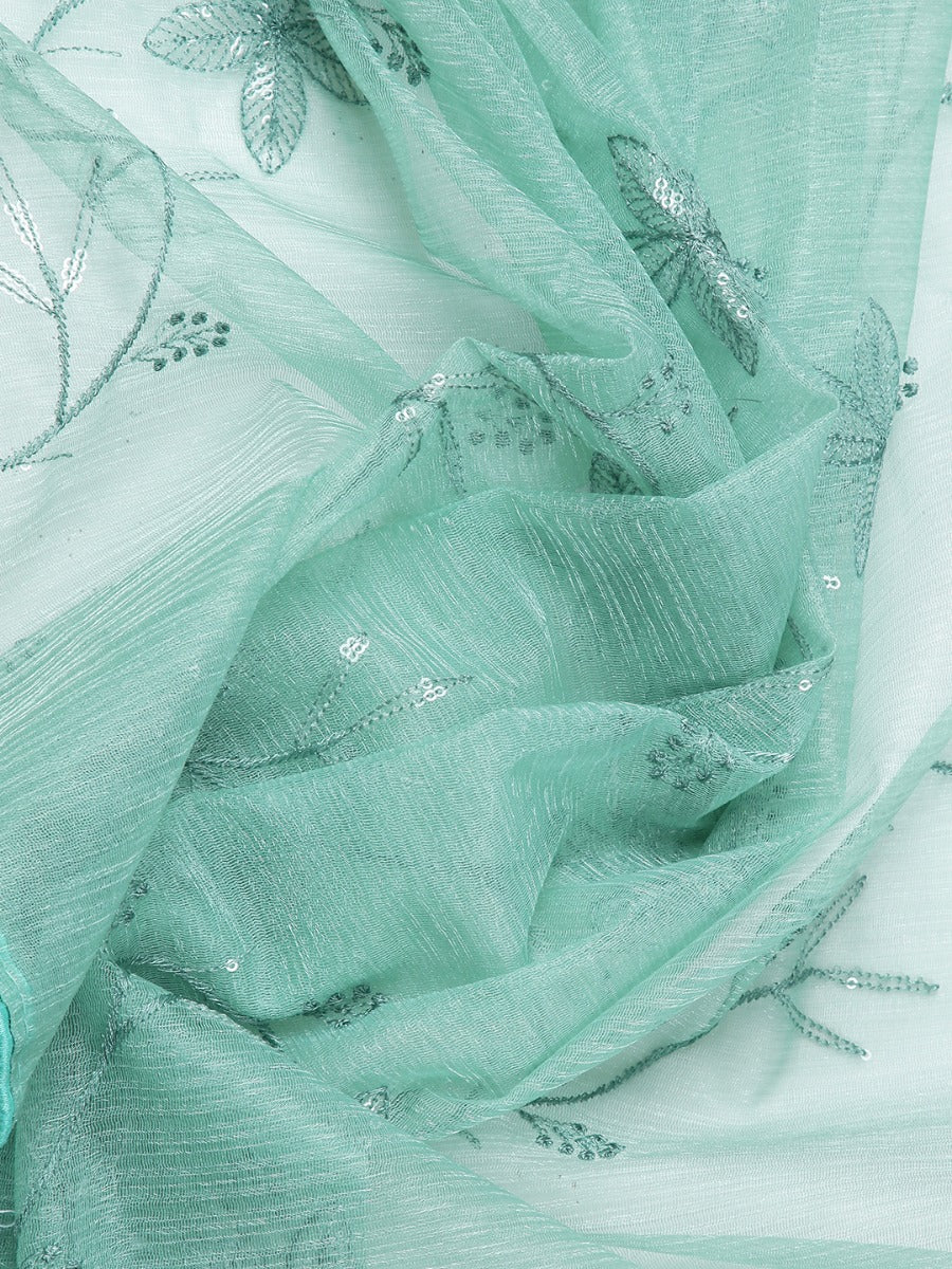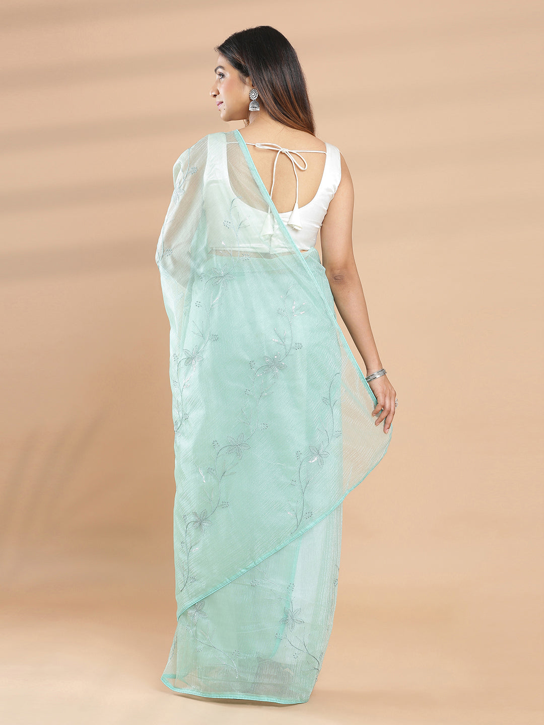 Light Teal Net Saree With Sequence And Floral Machine Embroidery Design