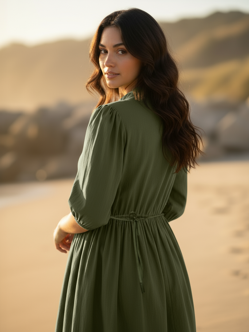 The stylish Mehandi Heavy Poplin short womens dress is back in stock! Flared fit and high neck. Popular dresses for women.