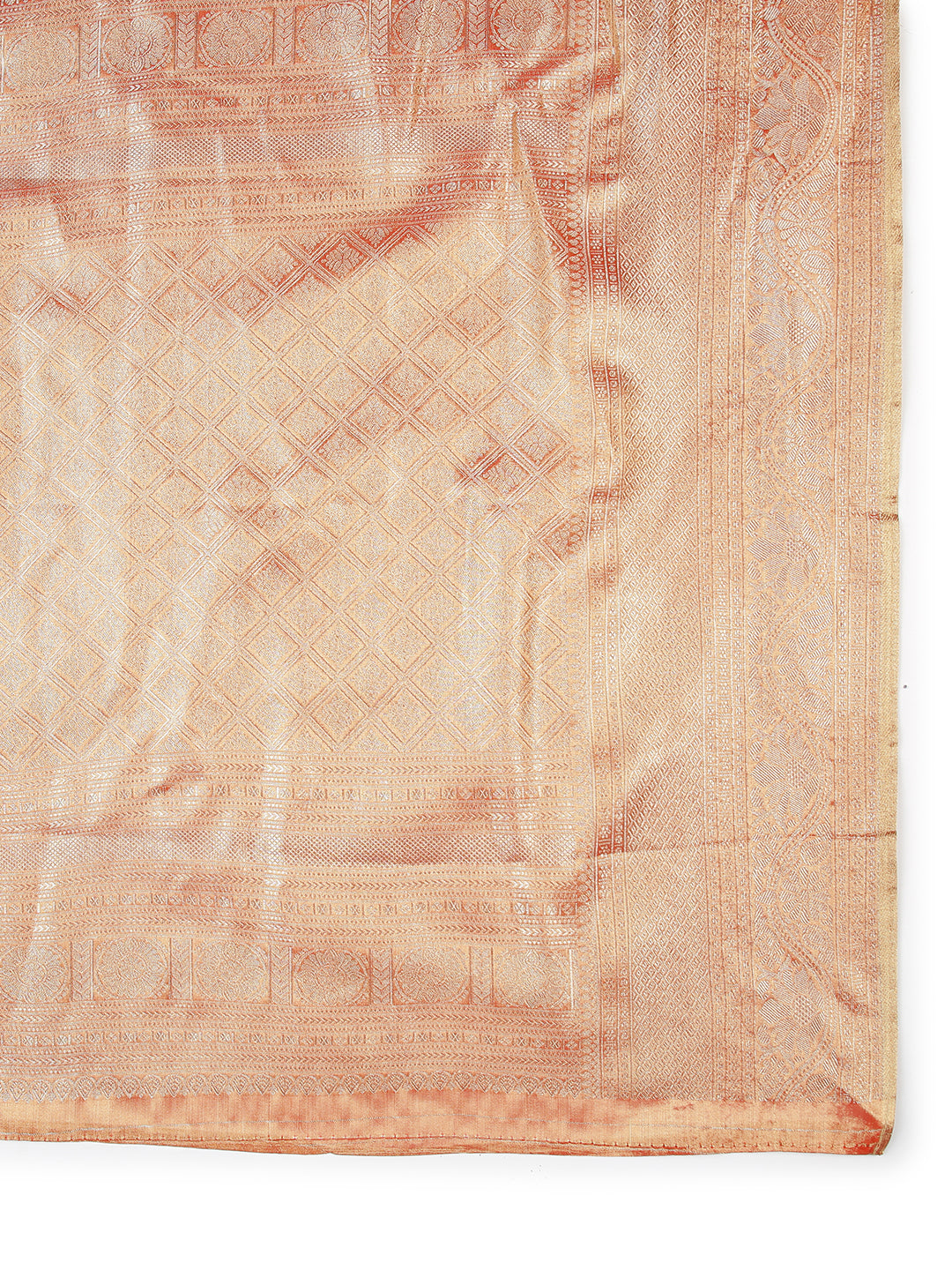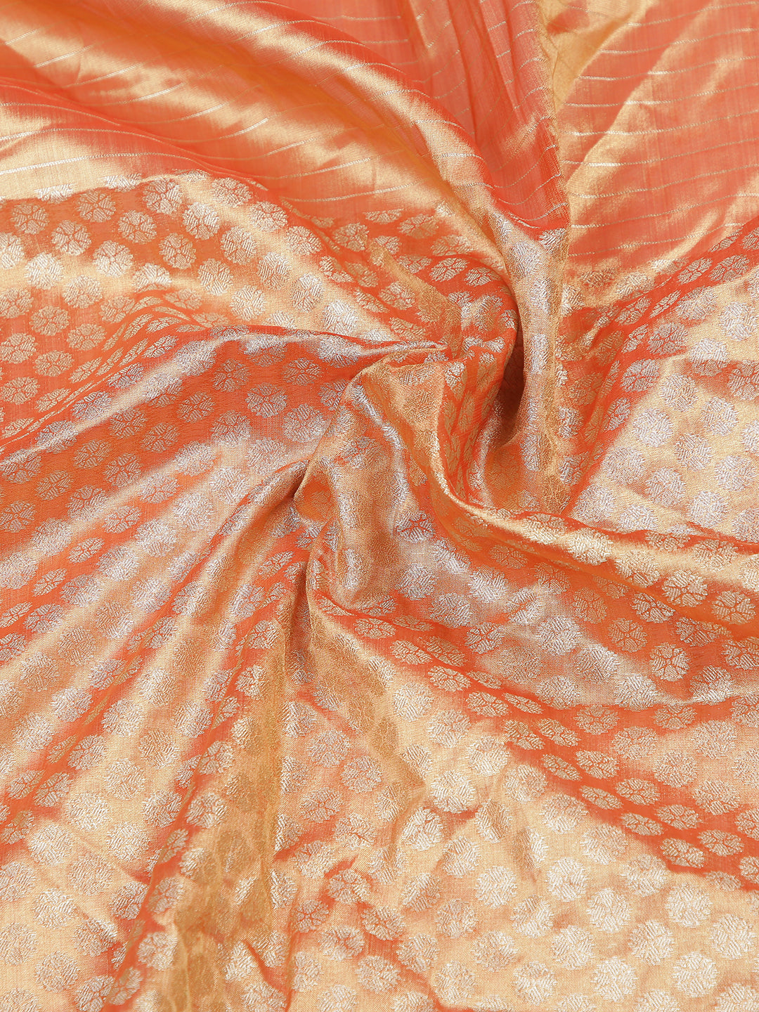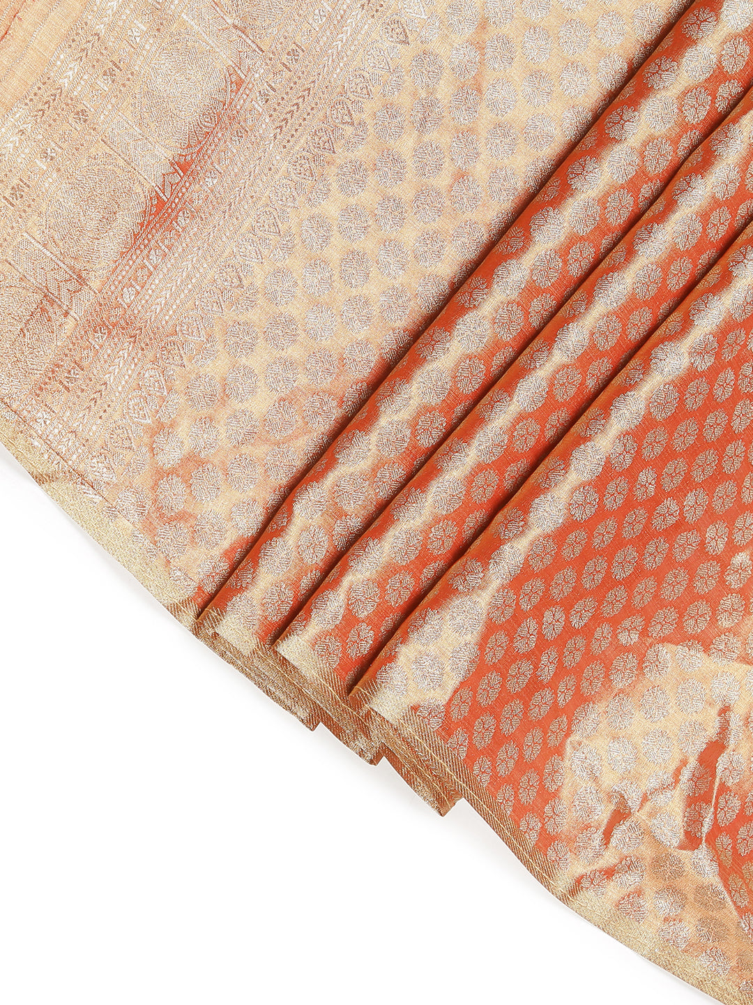 Stand out in this metallic rust-colored tissue saree, featuring intricate self floral designs and a matching golden zari border. Its rich texture and detailed work are perfect for special events.