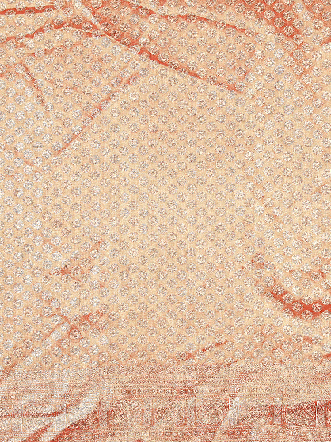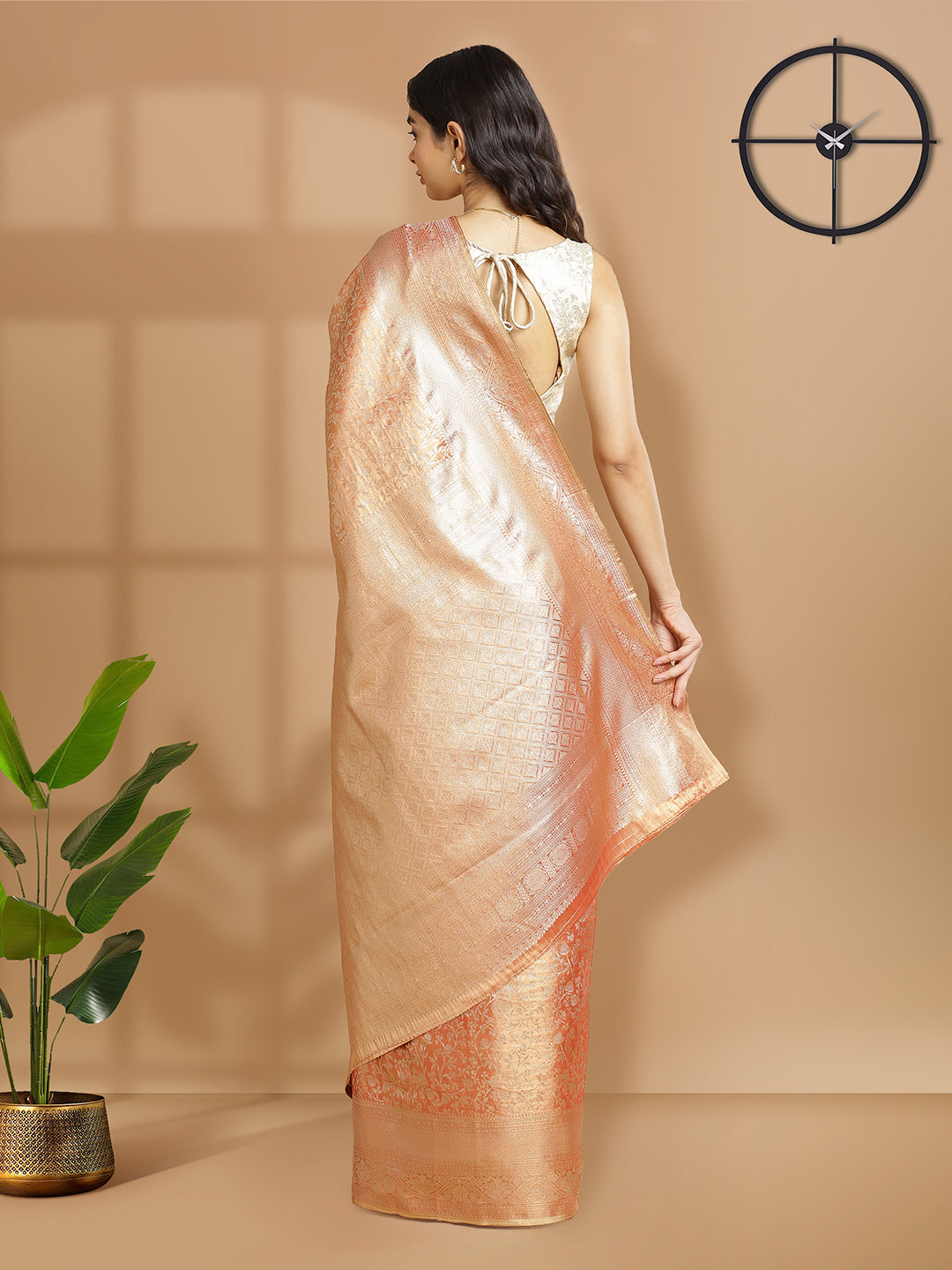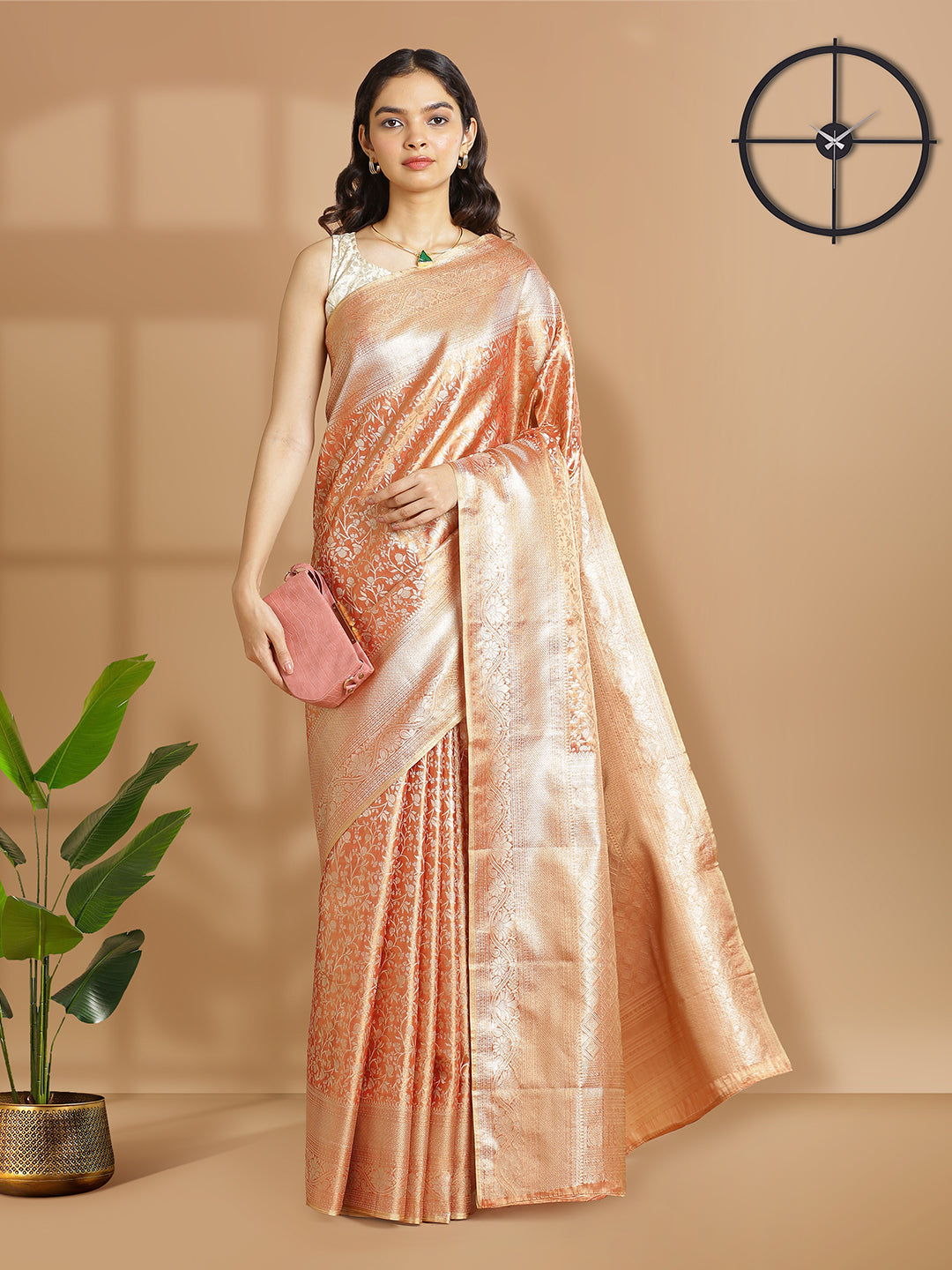 Stand out in this metallic rust-colored tissue saree, featuring intricate self floral designs and a matching golden zari border. Its rich texture and detailed work are perfect for special events.