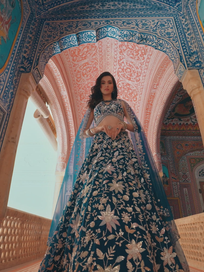 This stunning midnight blue lehenga is a perfect blend of contemporary sophistication and timeless Indian craftsmanship. Adorned with intricate floral embroidery in antique gold and silver tones, the ensemble exudes understated luxury and refined charm. The richly detailed lehenga features all-over botanical motifs that shimmer gracefully with every movement, creating a mesmerizing visual appeal.