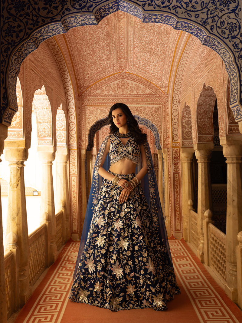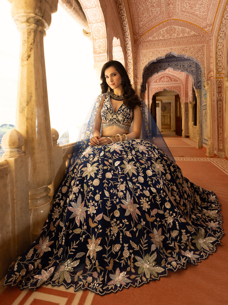 Midnight Blue Floral Zari Embroidered Lehenga