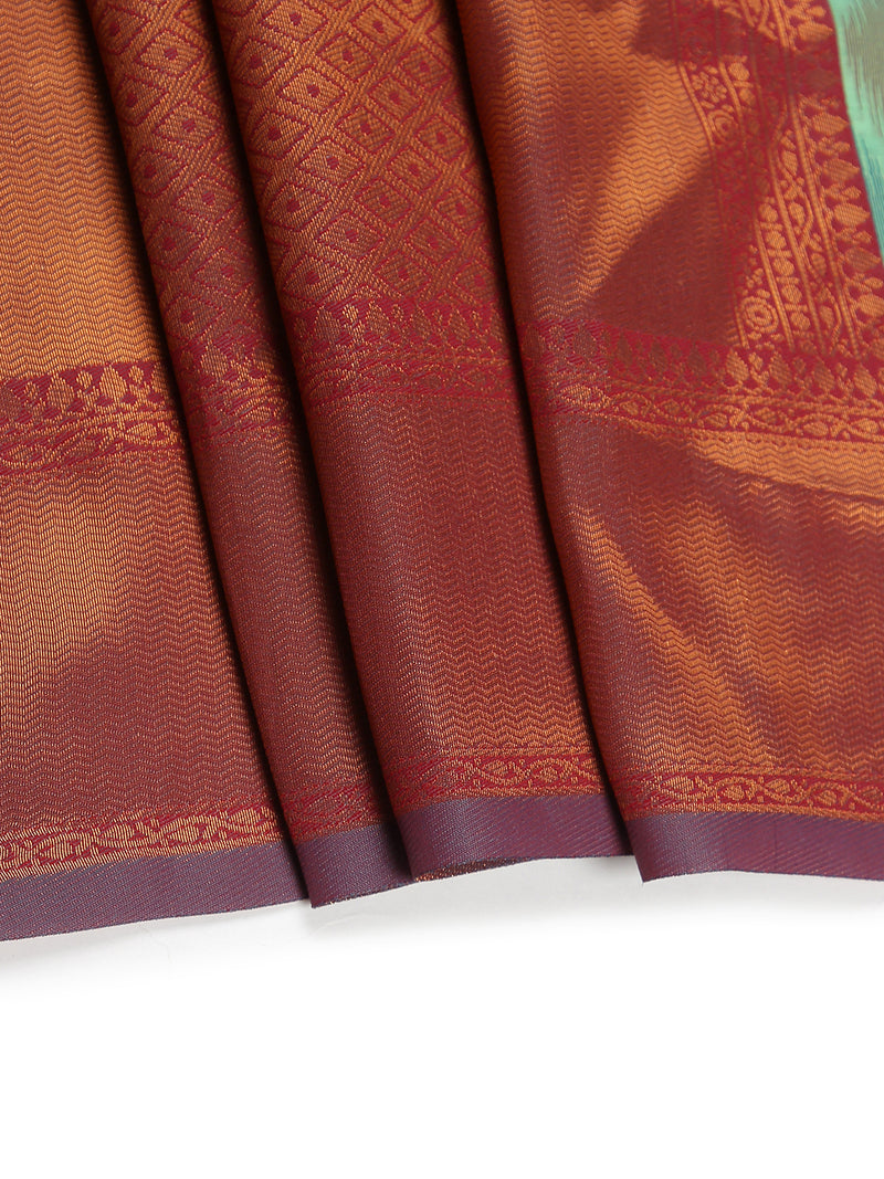 Embrace the rich heritage of Kalyan Silks with this elegant mint green art silk saree featuring the iconic Pochampalli Ikat design. The saree is accentuated with a striking maroon border that adds contrast and charm. Crafted for both style and comfort, this saree is perfect for festive occasions and celebrations.