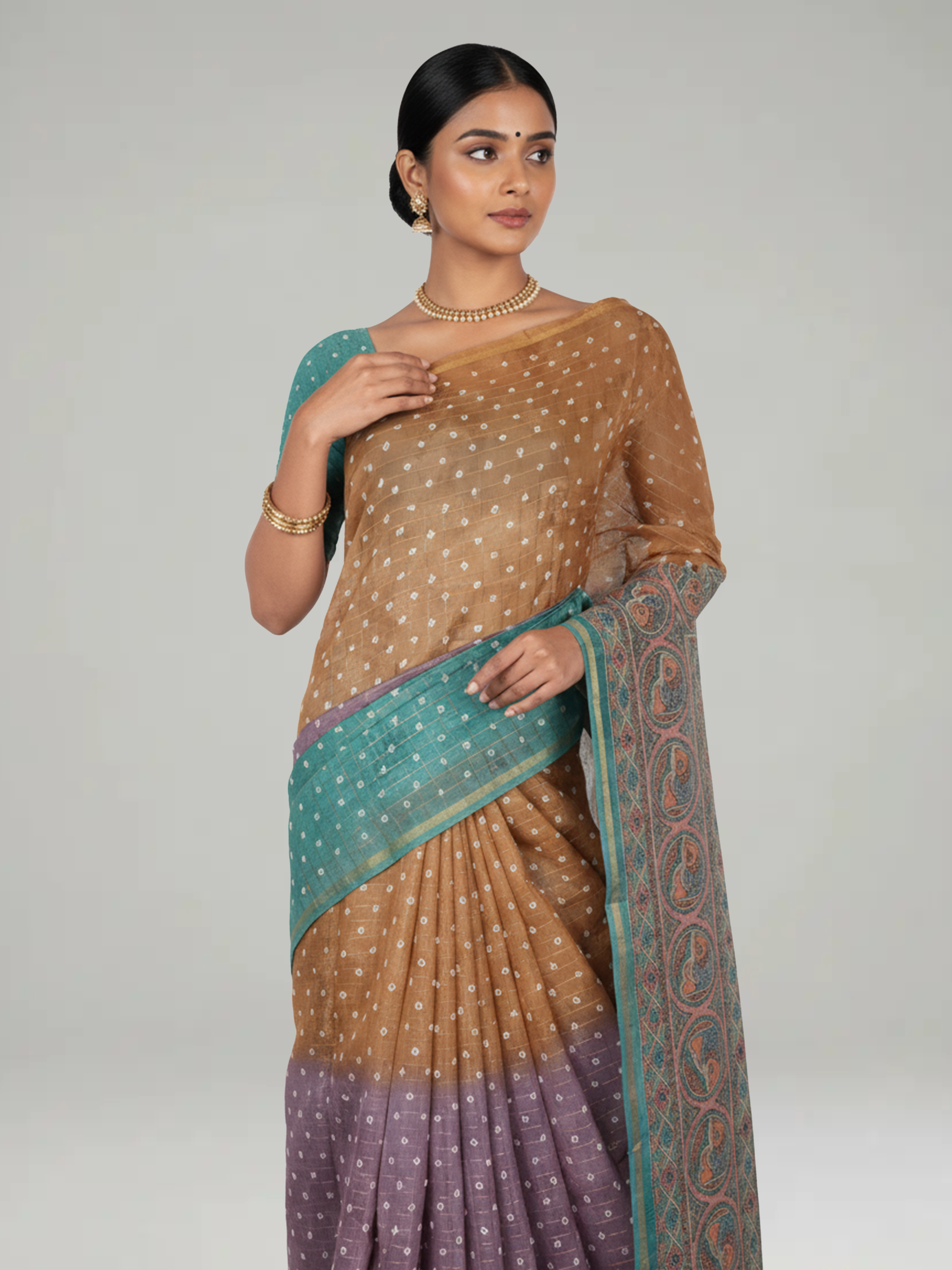 Multi Shade Semi Silk Saree With Pinal Checks And Bandhani Print