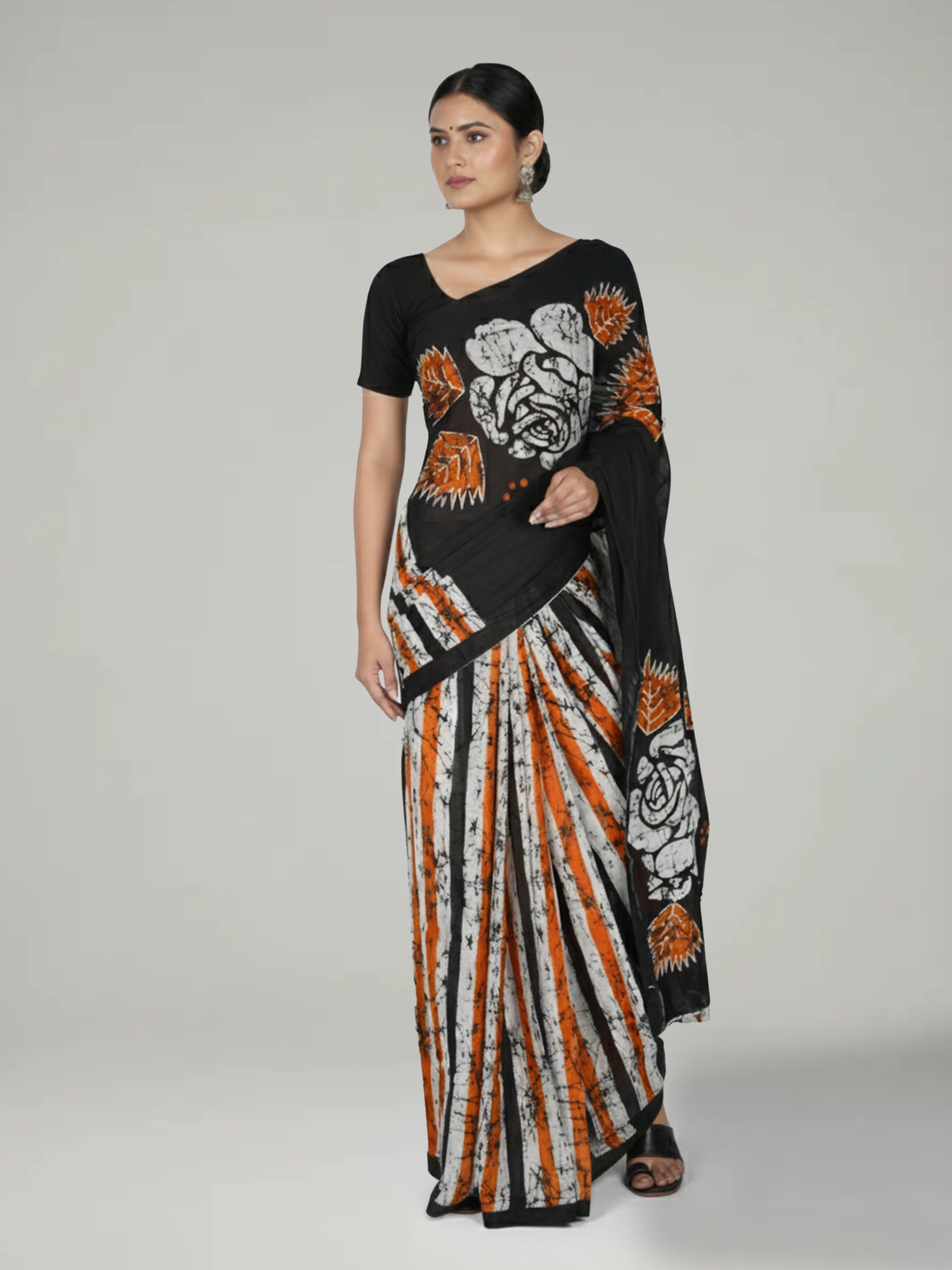Multi-Shade Soft Cotton Saree with Striped Body, Contrast Black Printed Pallu & White Blouse