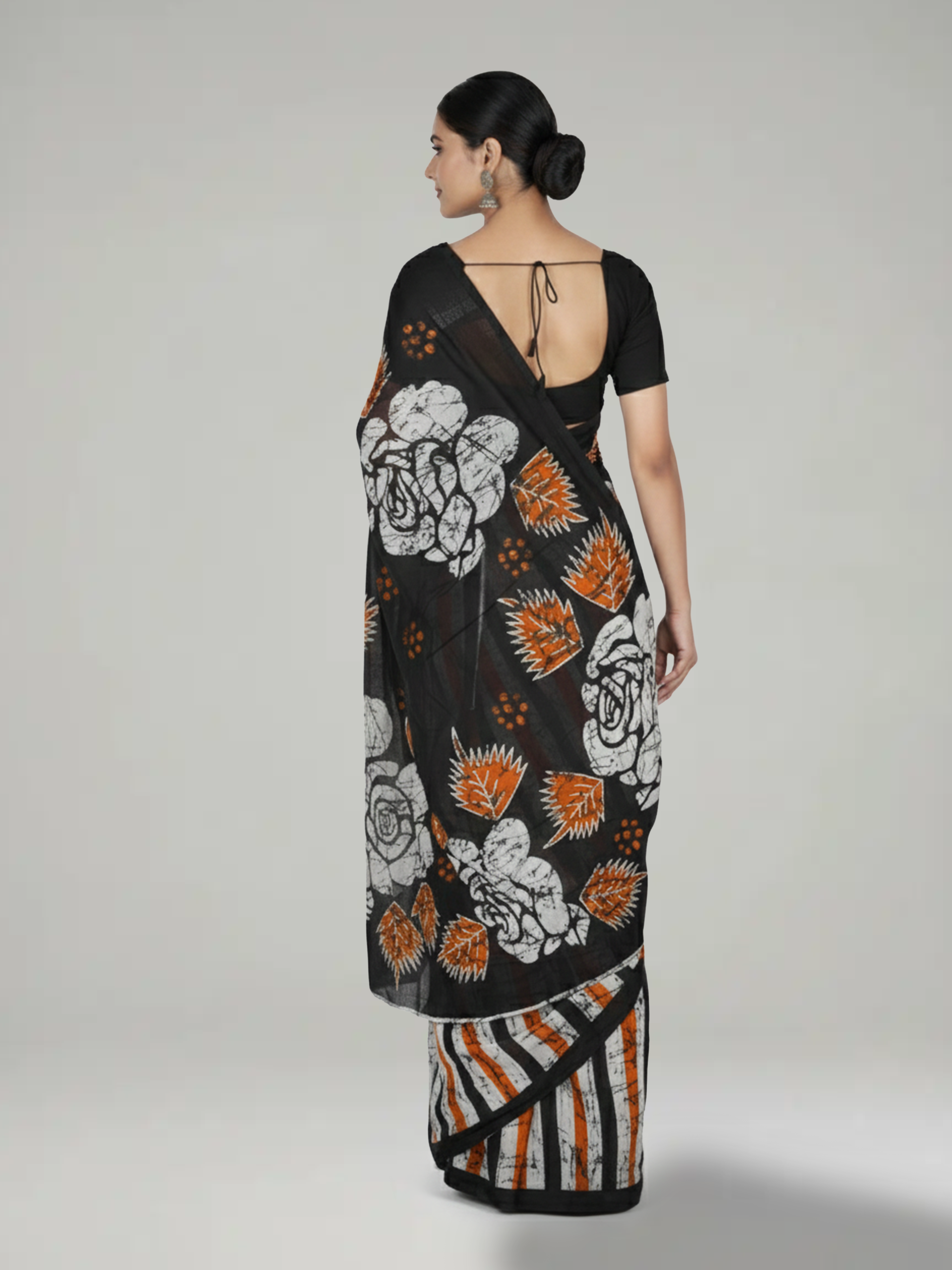 This elegant saree features a soothing multi-shade palette that flows seamlessly across the body in soft, refined stripes. Crafted from breathable soft cotton, it offers a lightweight and comfortable drape, perfect for both daily elegance and special occasions. The contrast black pallu with printed detailing adds a striking visual balance, while the plain contrast border enhances its contemporary appeal. Paired with a white printed blouse, the ensemble delivers a sophisticated blend of subtlety and style.
