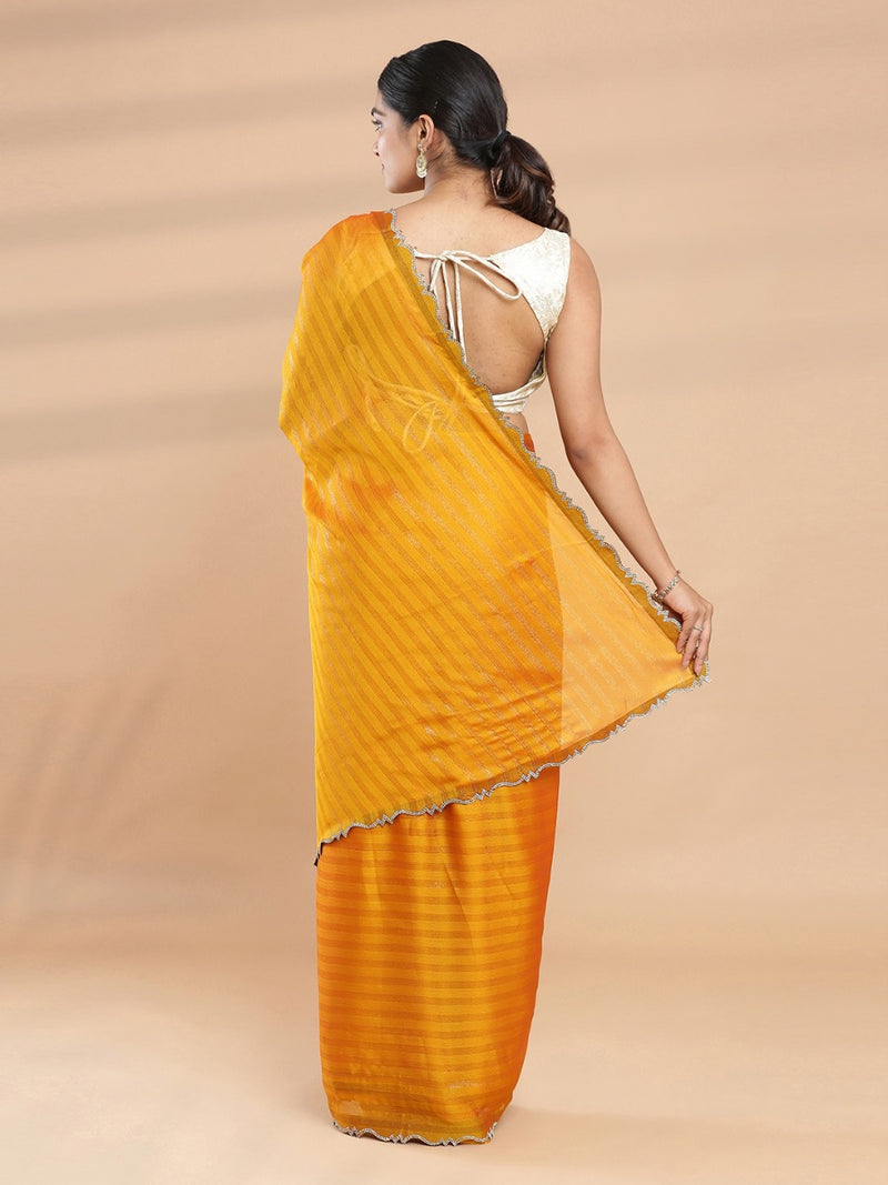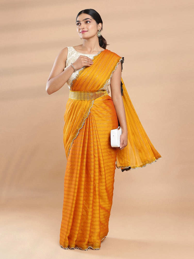 Mustard Yellow Color Shimmer Chiffon Striped Saree With Scalloped Stone worked Border & Belt