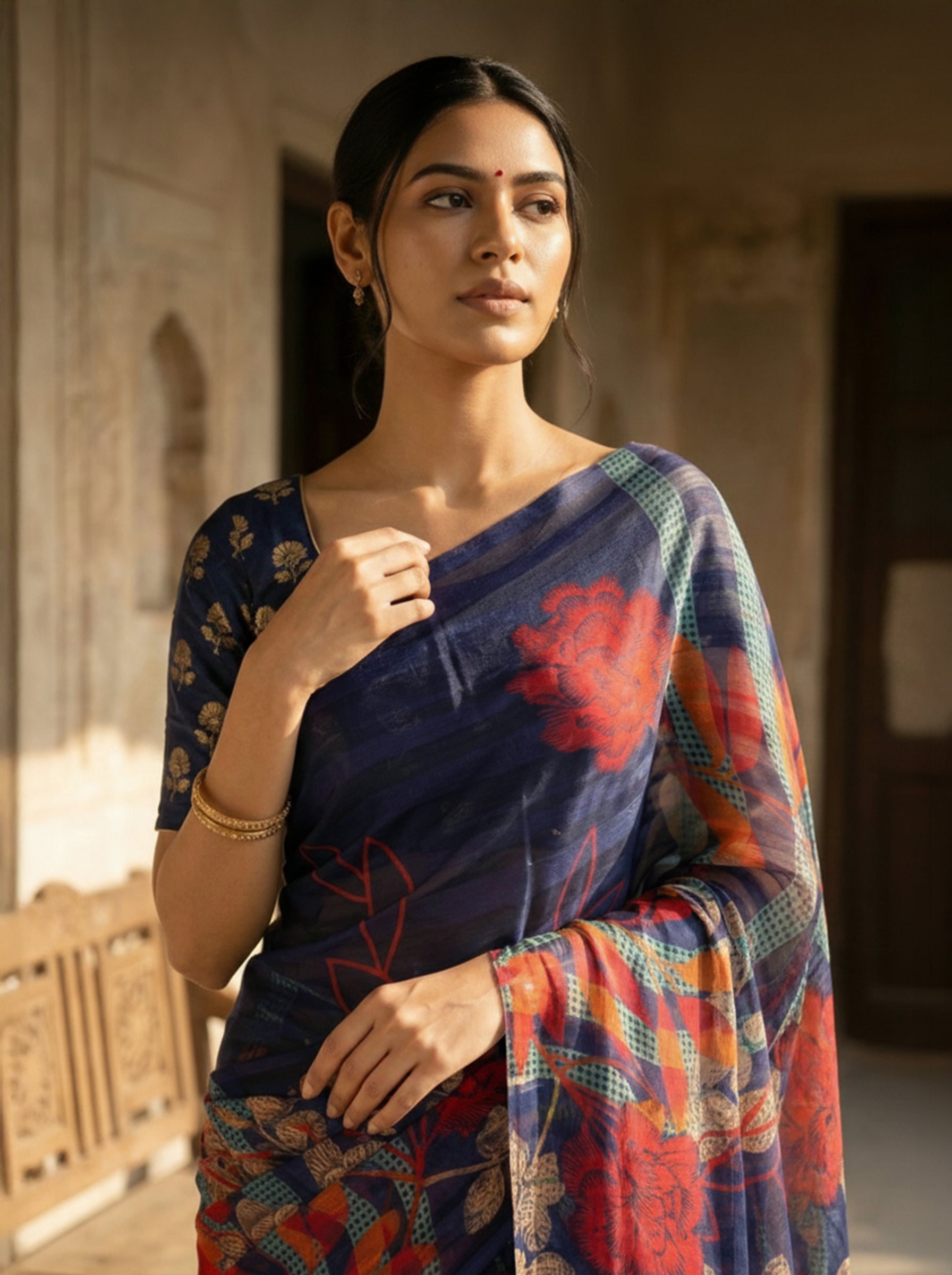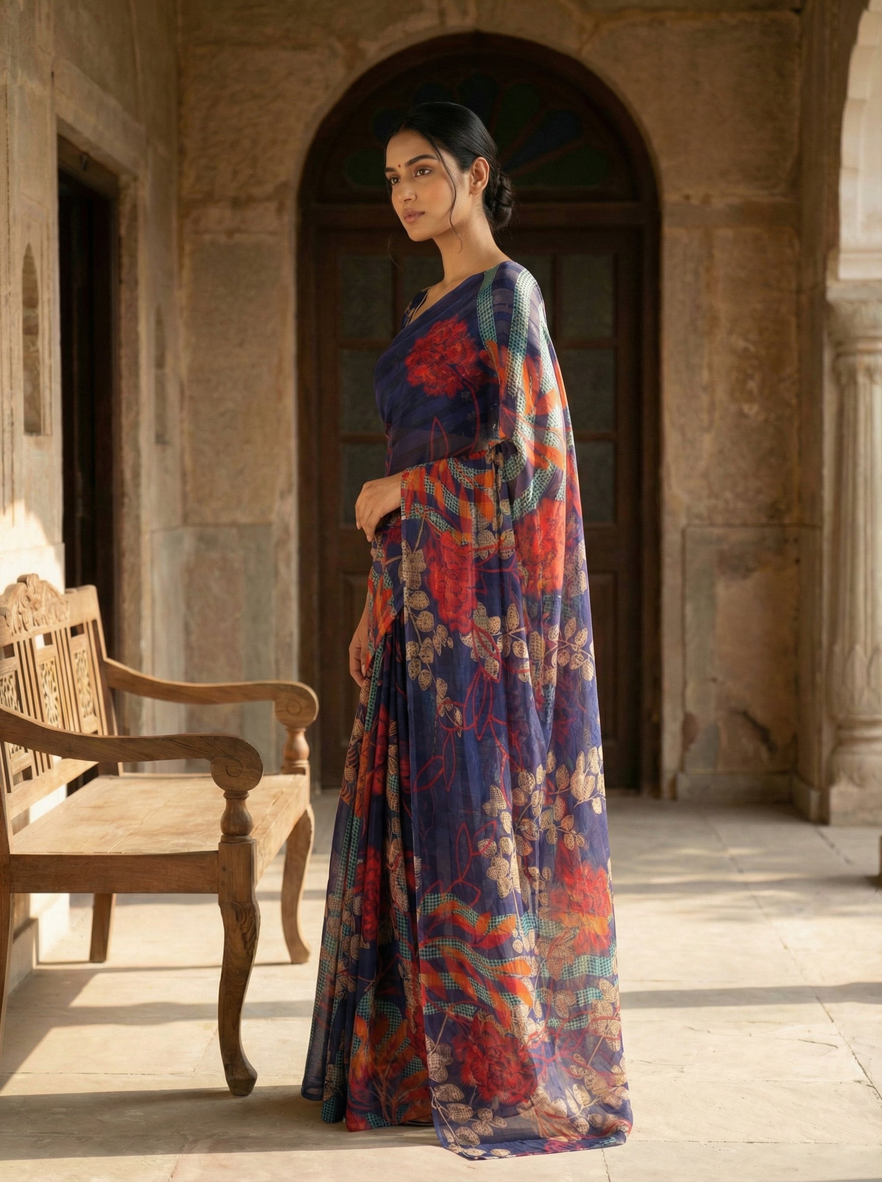 The saree features an elegant all-over floral print on the body and pallu, blending vibrant colors with the deep navy base for a refreshing and modern look. The borderless design enhances its fluid and contemporary appeal, making it a go-to option for women who prefer stylish yet comfortable sarees.