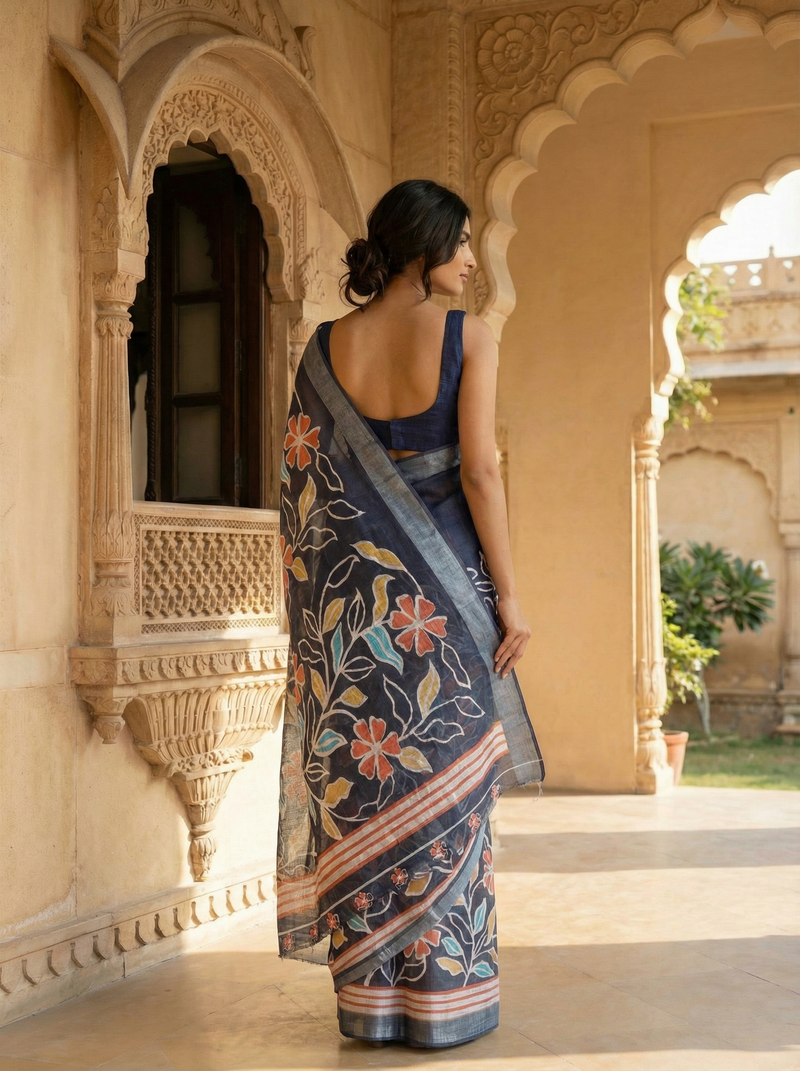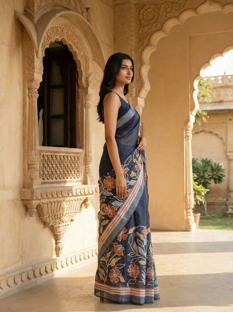 This elegant navy blue polyester saree features vibrant floral and leafy motifs in warm shades of coral, mustard, and teal, creating a striking yet balanced look. The solid navy body offers a refined base, while the printed lower half and pallu add artistic charm. Finished with a smart contrast striped border, this saree drapes beautifully and feels lightweight, making it ideal for long hours of wear. Perfect for office wear, casual outings, and daytime gatherings, this saree blends modern design with effortless elegance.