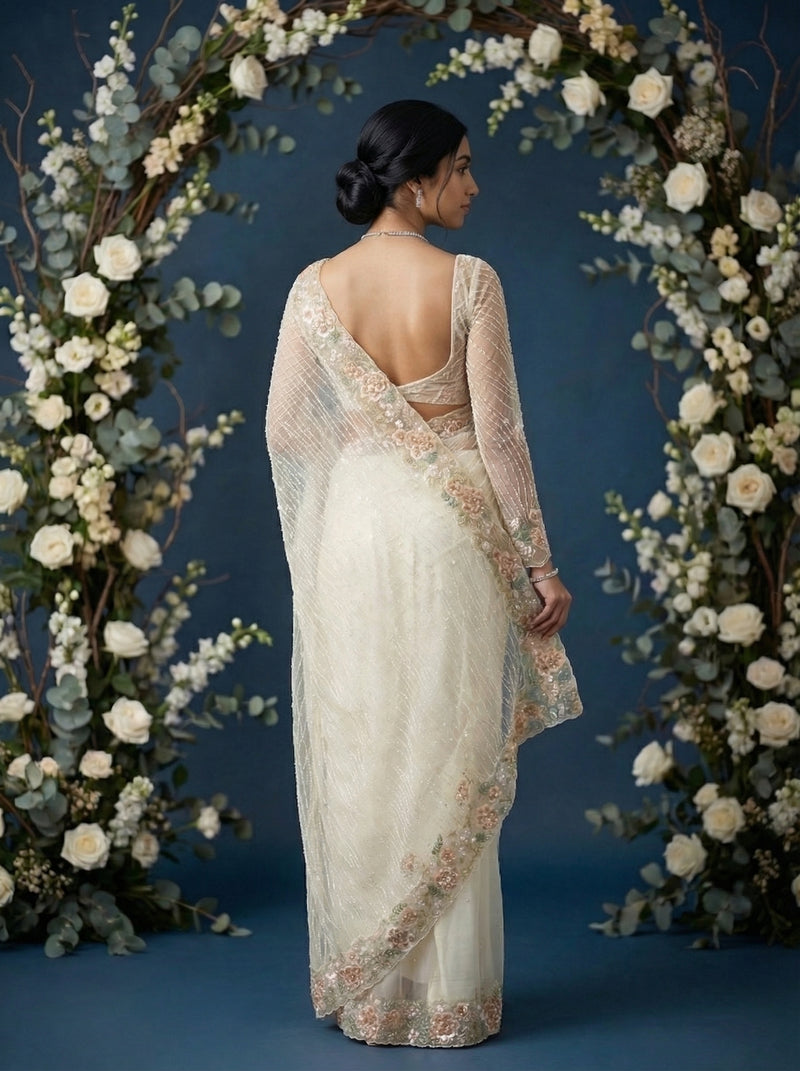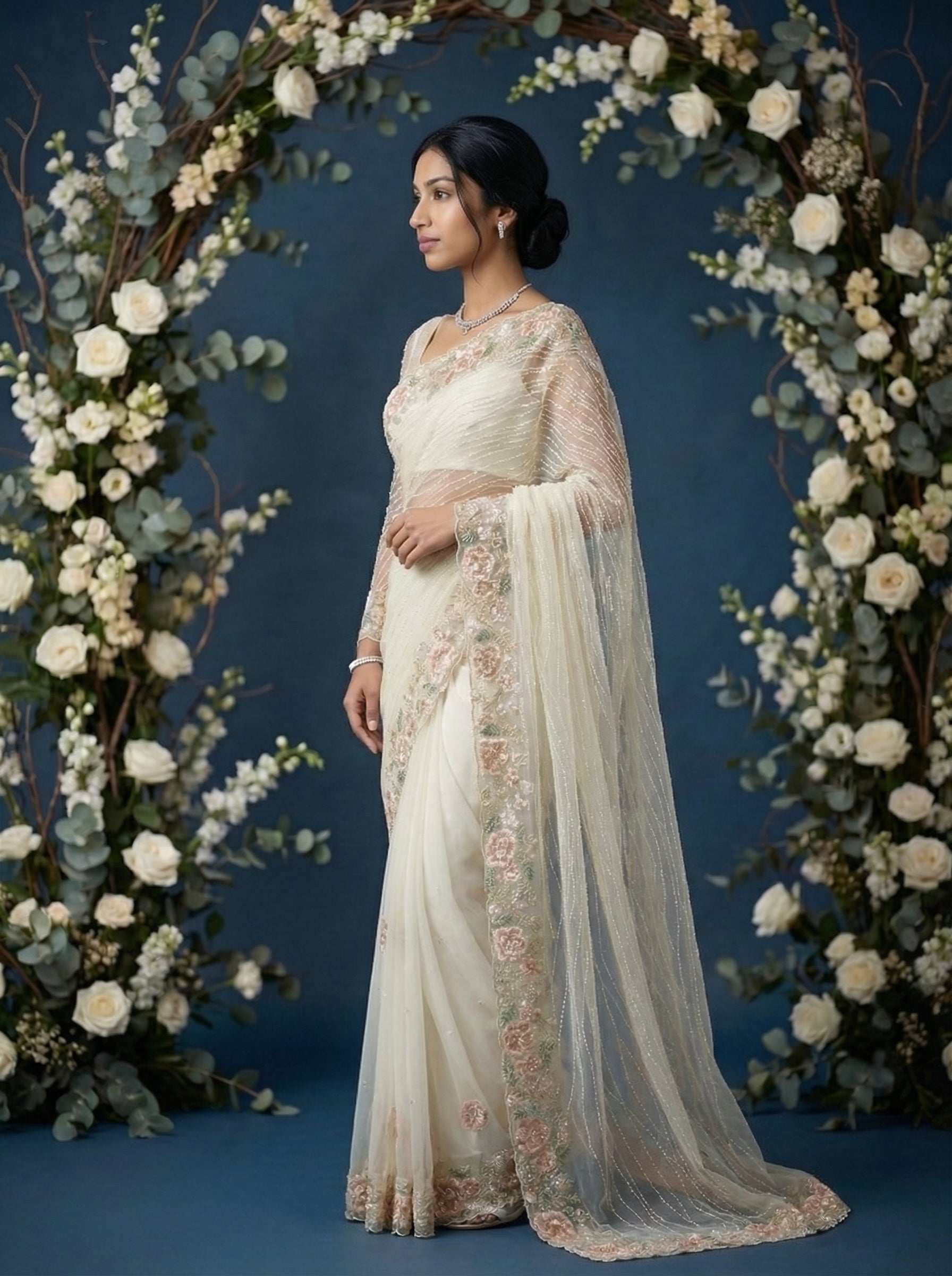 This beautiful Net Ivory Floral Designer Wedding Wear Saree is a perfect choice for elegant and special occasions. Made from soft net fabric, it feels light and flows gracefully, giving a delicate and stylish look. The soft ivory color adds a fresh and classy touch, while the floral embroidery enhances its beauty with subtle detailing.The saree features fine floral work along the border and pallu, adding charm and richness to the design. Ideal for weddings, receptions, and parties, it creates a graceful and modern appearance. Pair it with elegant jewelry to complete your perfect wedding look.