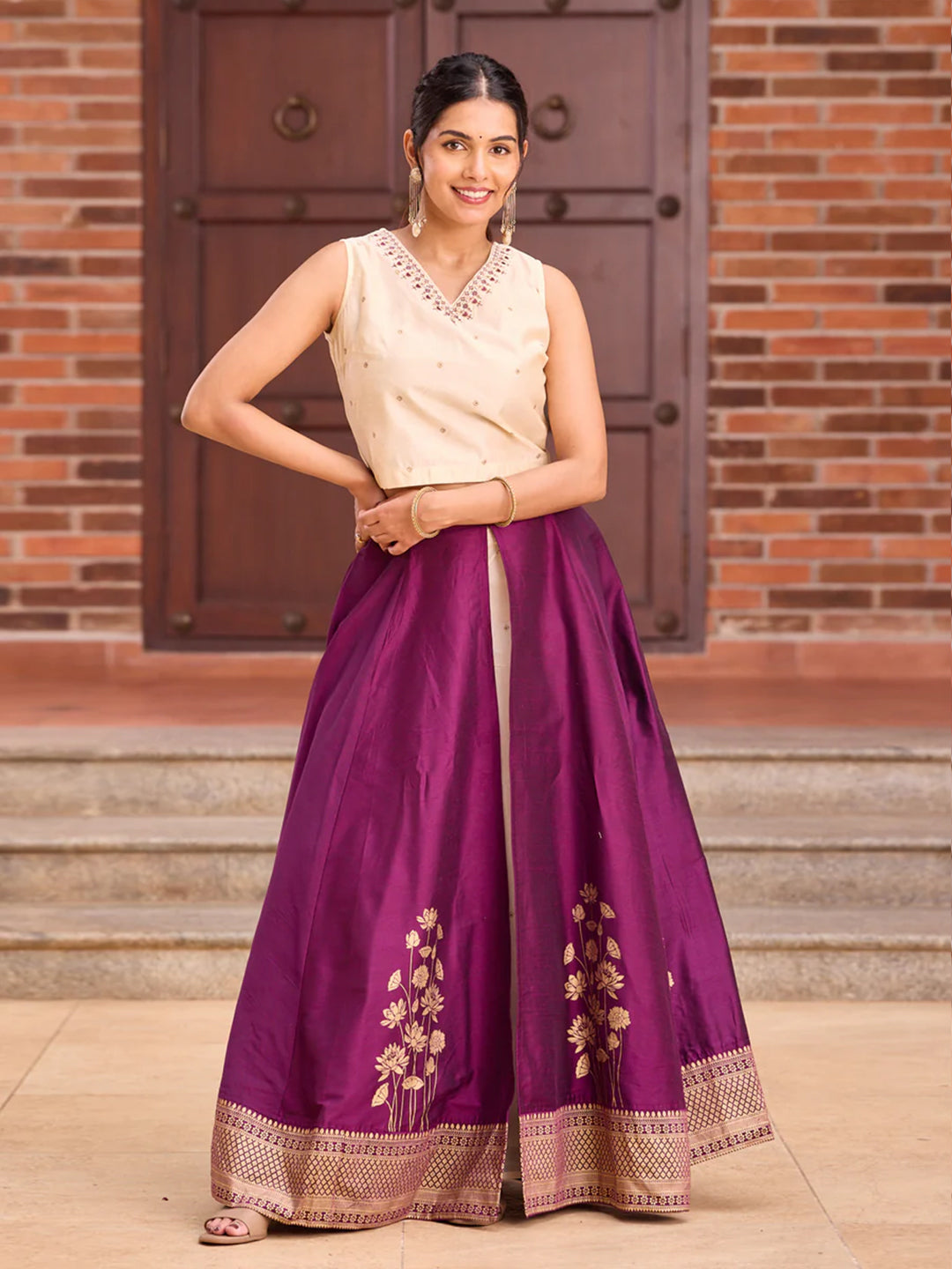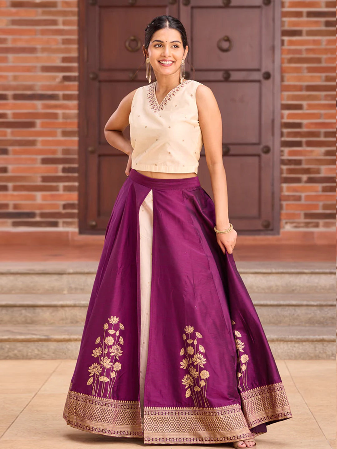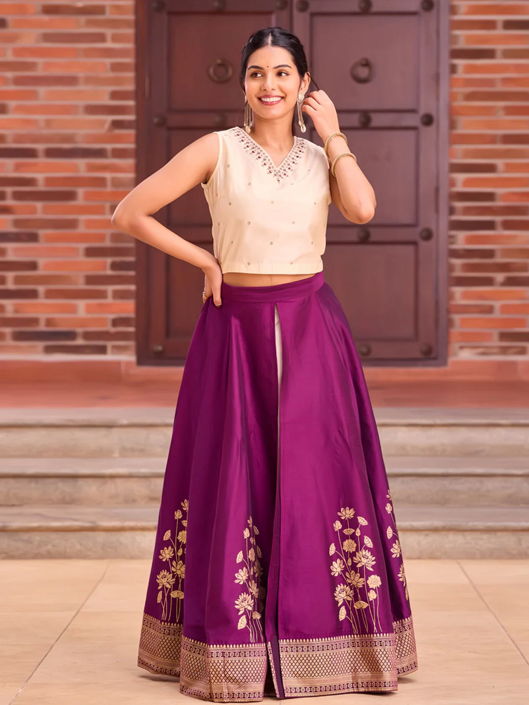 Off-White Chanderi Crop Top with Embroidery & Purple Golden Printed Skirt Set