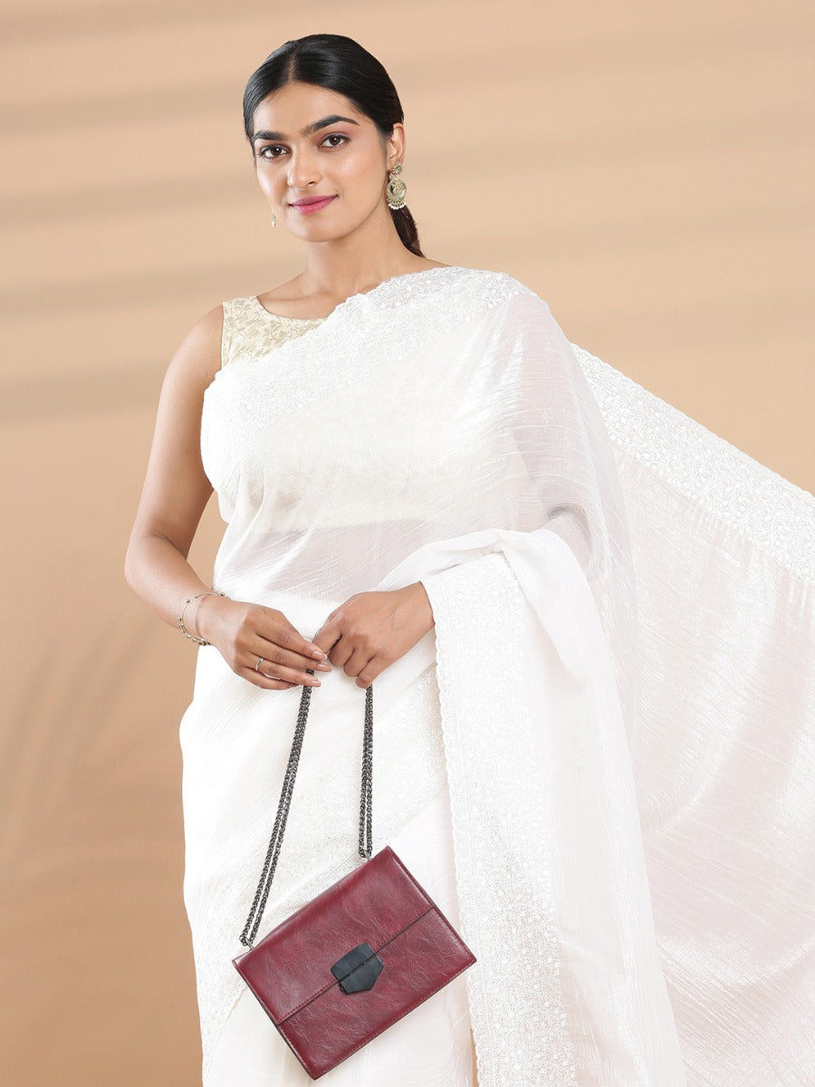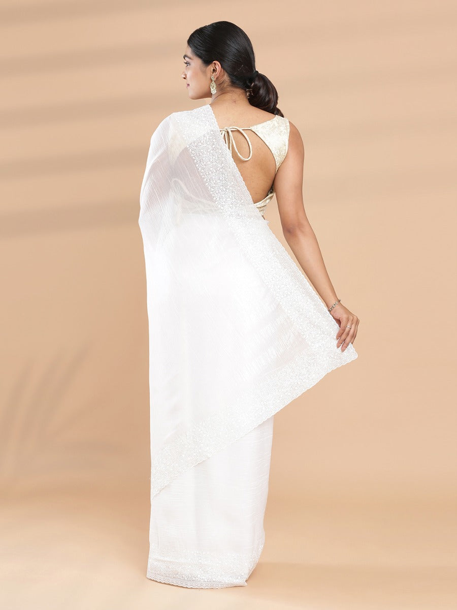 Off White Color Crushed Organza Plain Saree With Off White Color Embroidery Design On Border