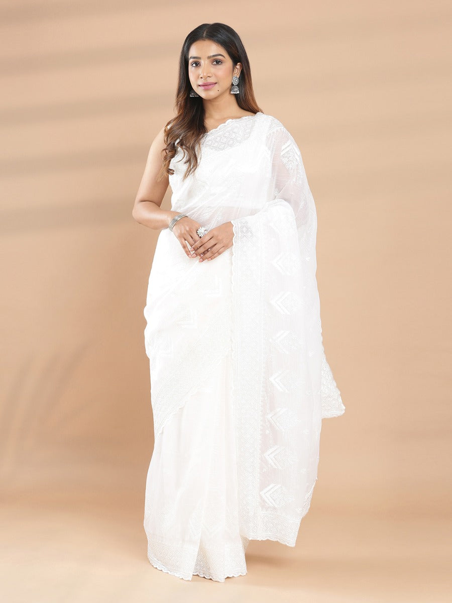 Off White Color Glass Organza Saree With Off White Embroidery Design On Body