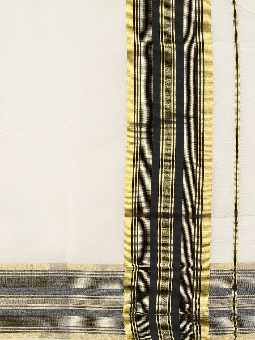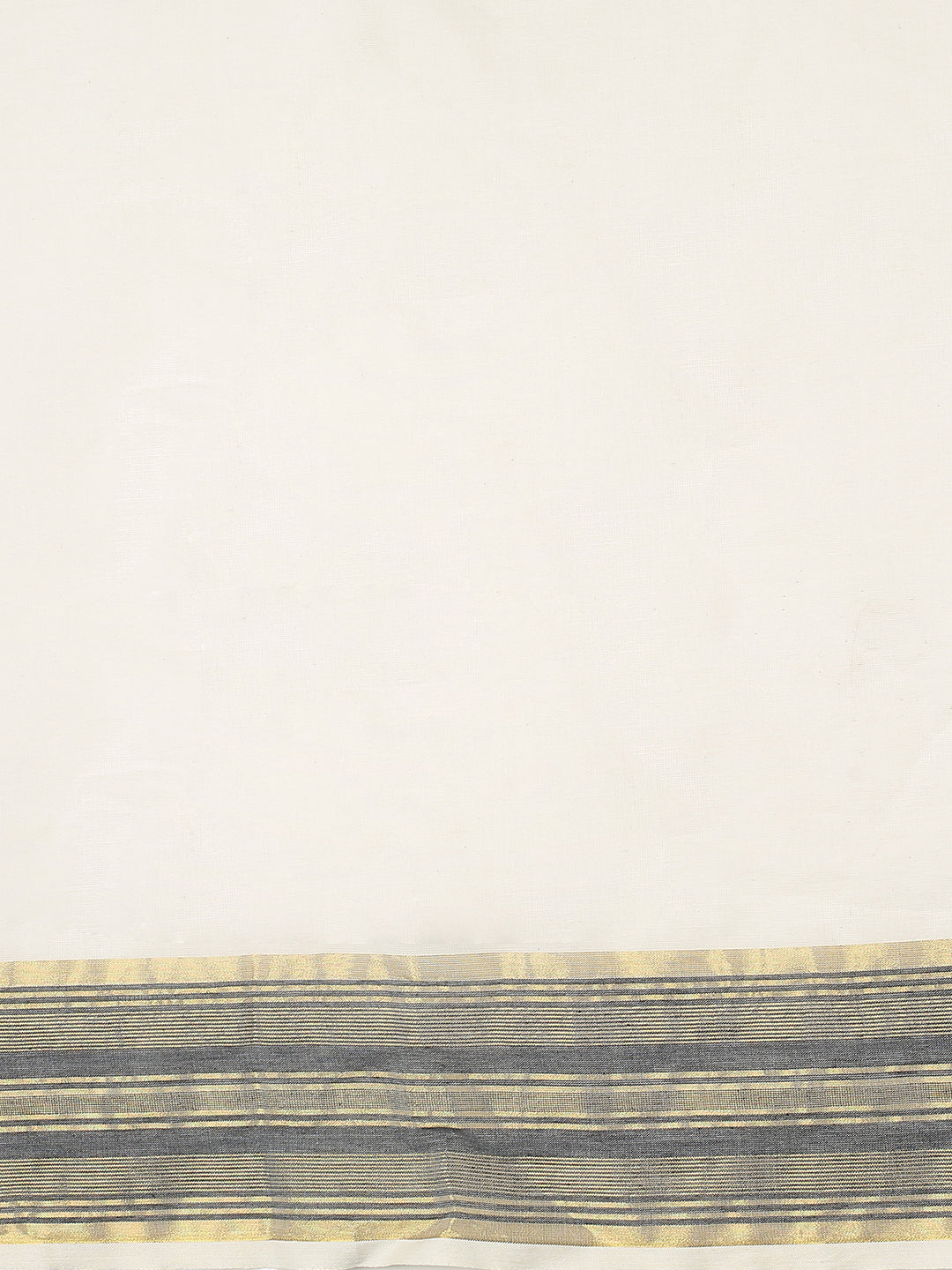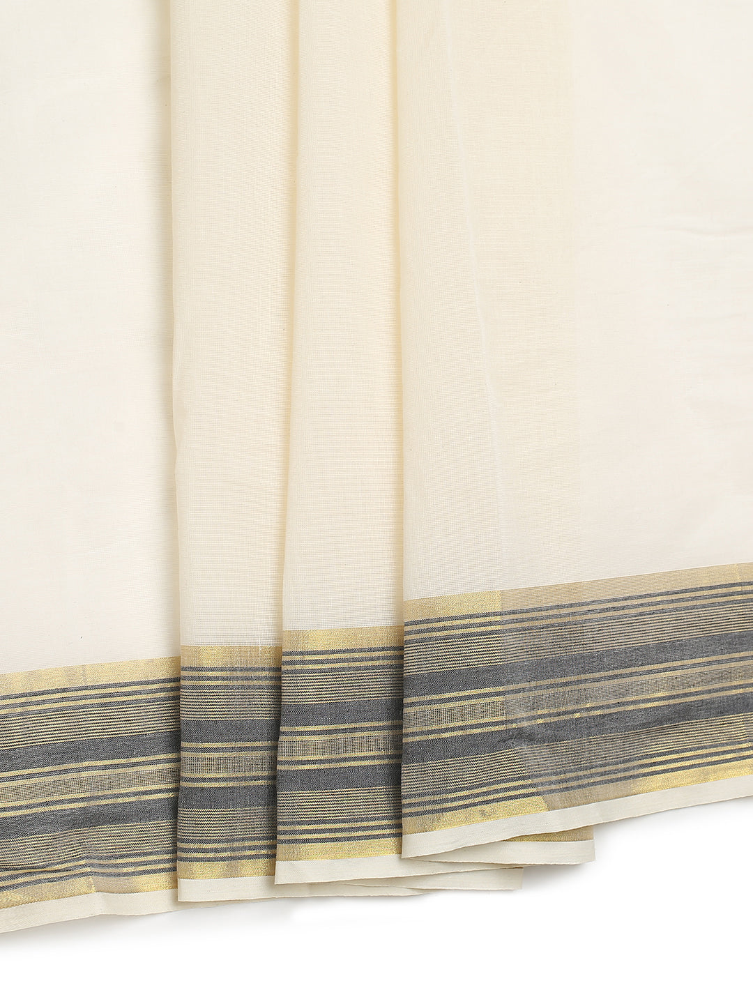 Off-White Cotton Plain Set Saree with Black Stripes On Golden Kasavu Border