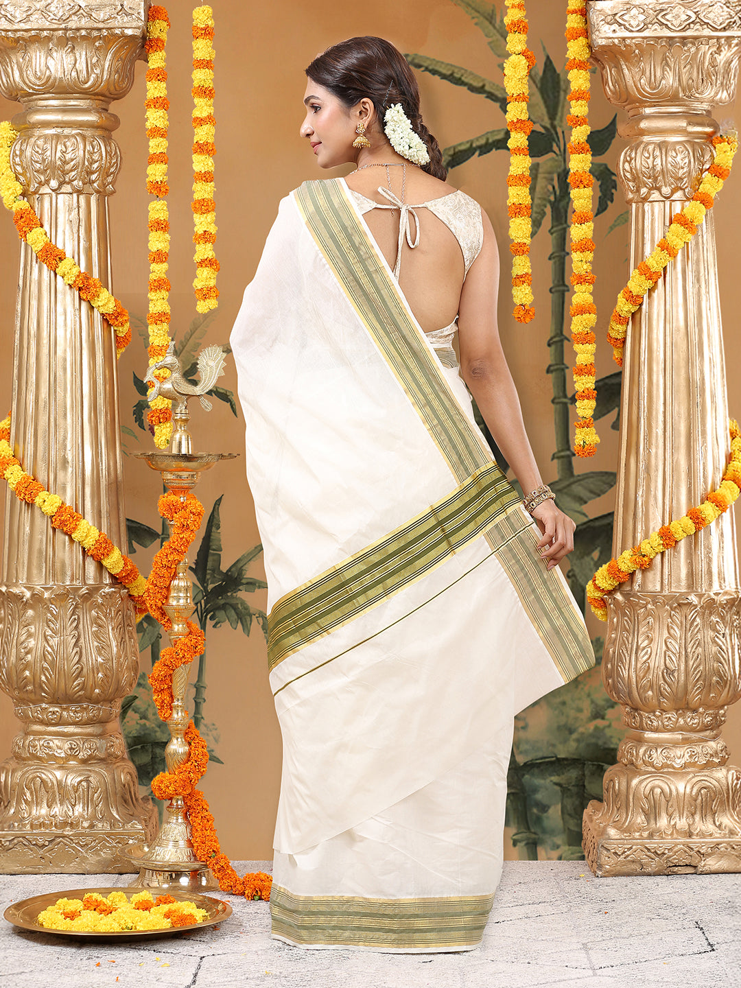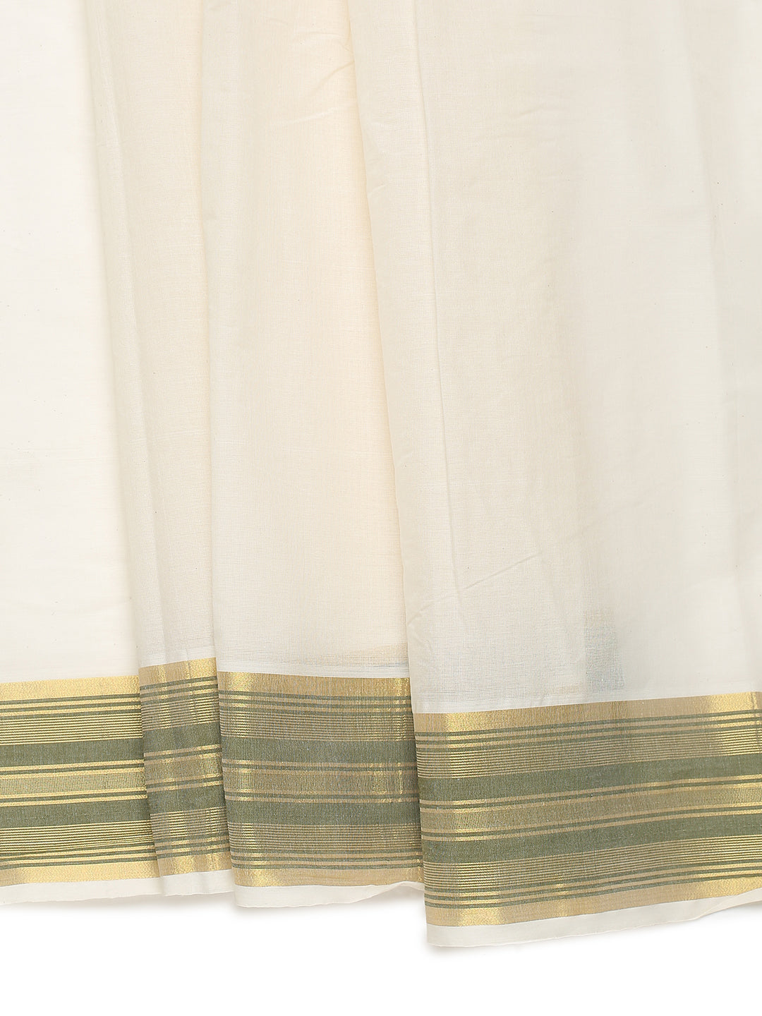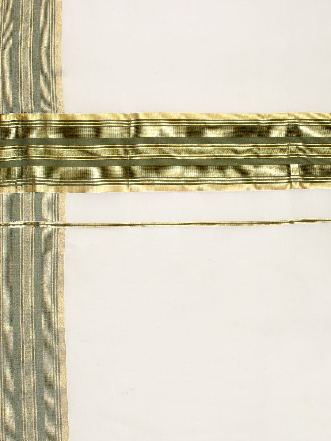 Off-White Cotton Saree with Olive Green Stripes & Golden Kasavu Border