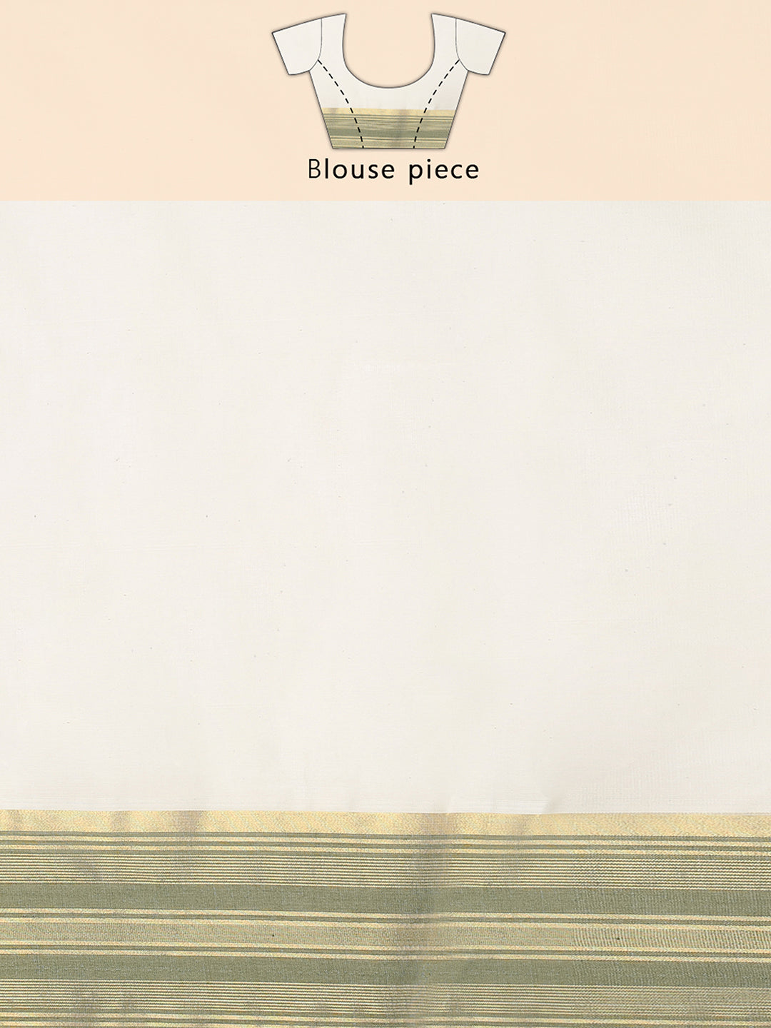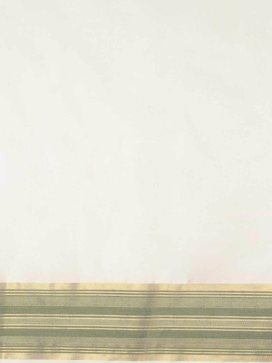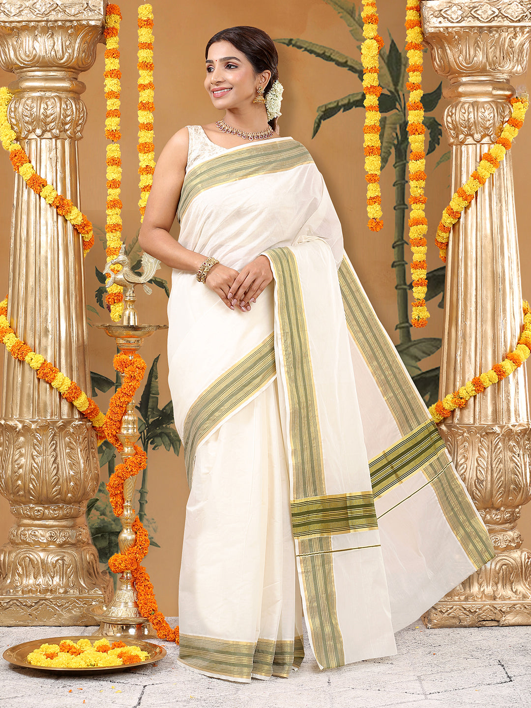 Off-White Cotton Saree with Olive Green Stripes & Golden Kasavu Border