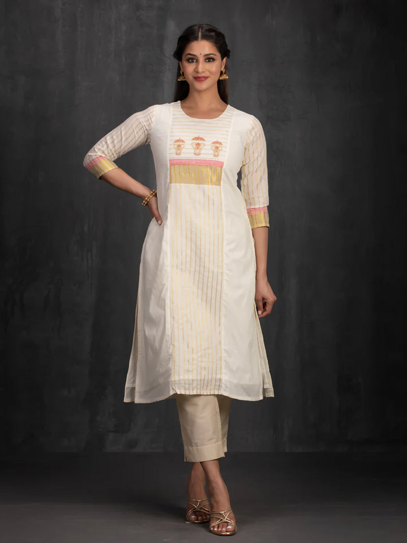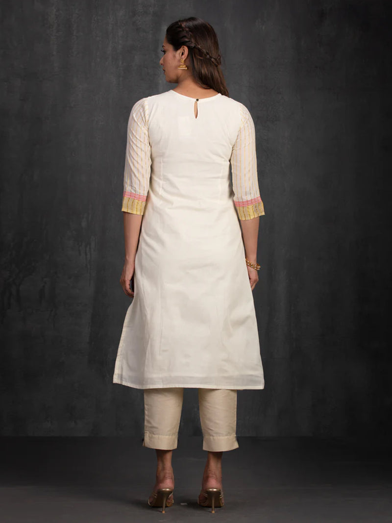 Off-White Mulmul Cotton Kurta with Muthukkuda Golden Thread Work