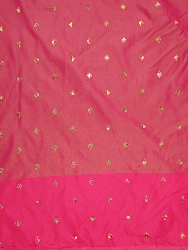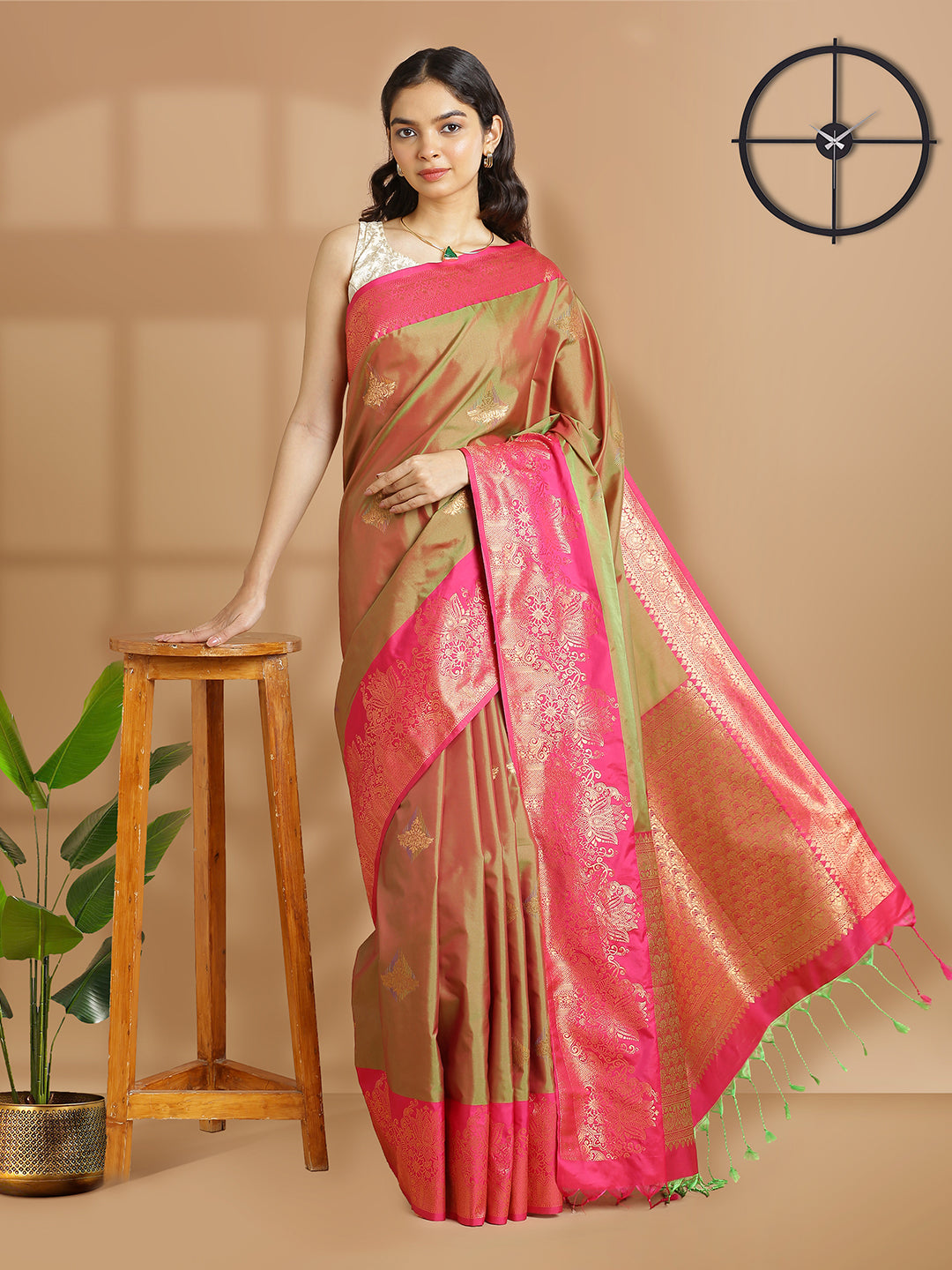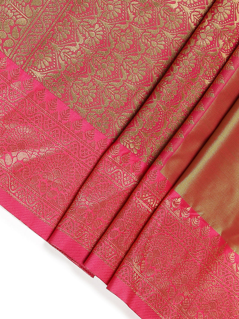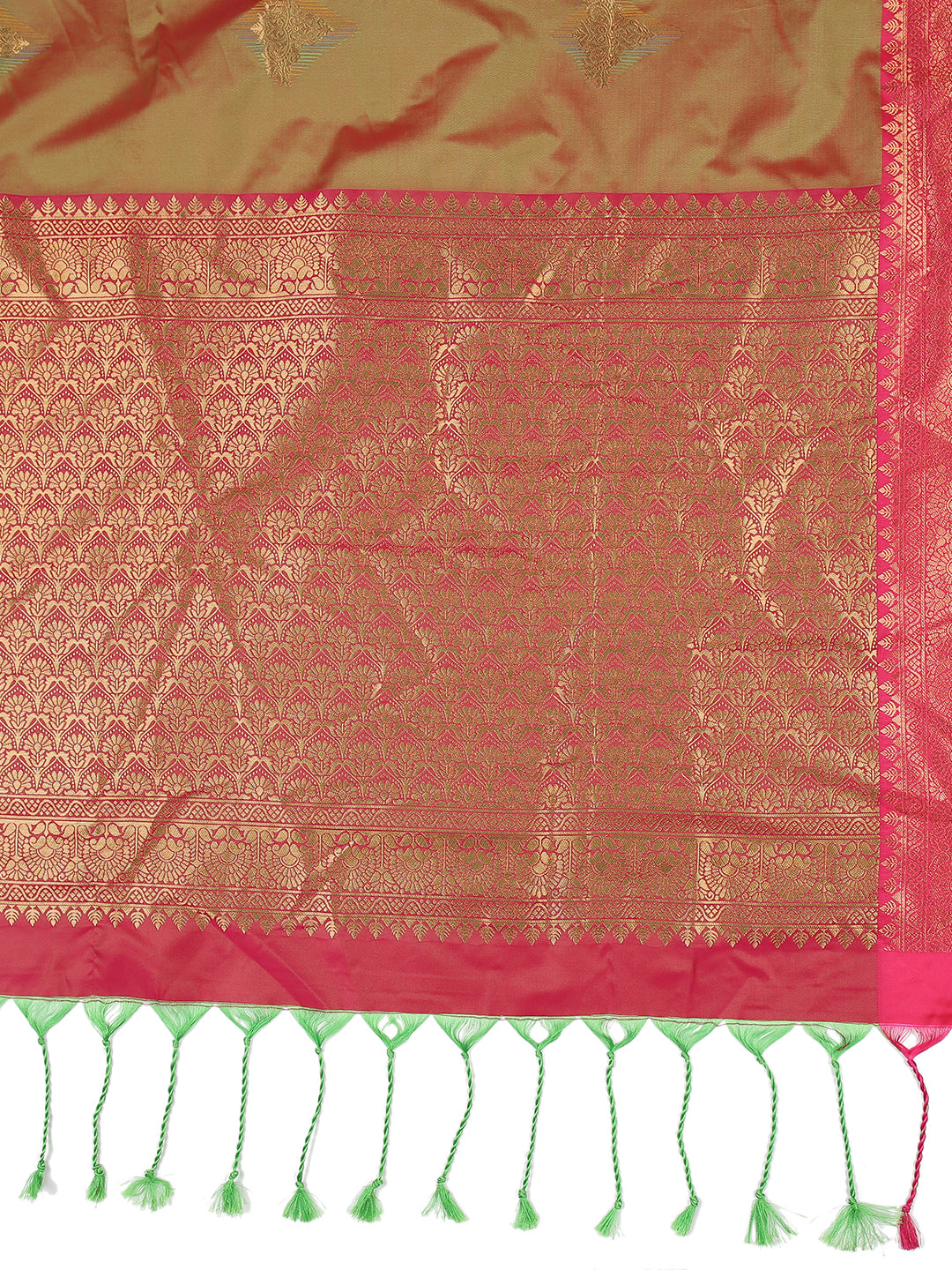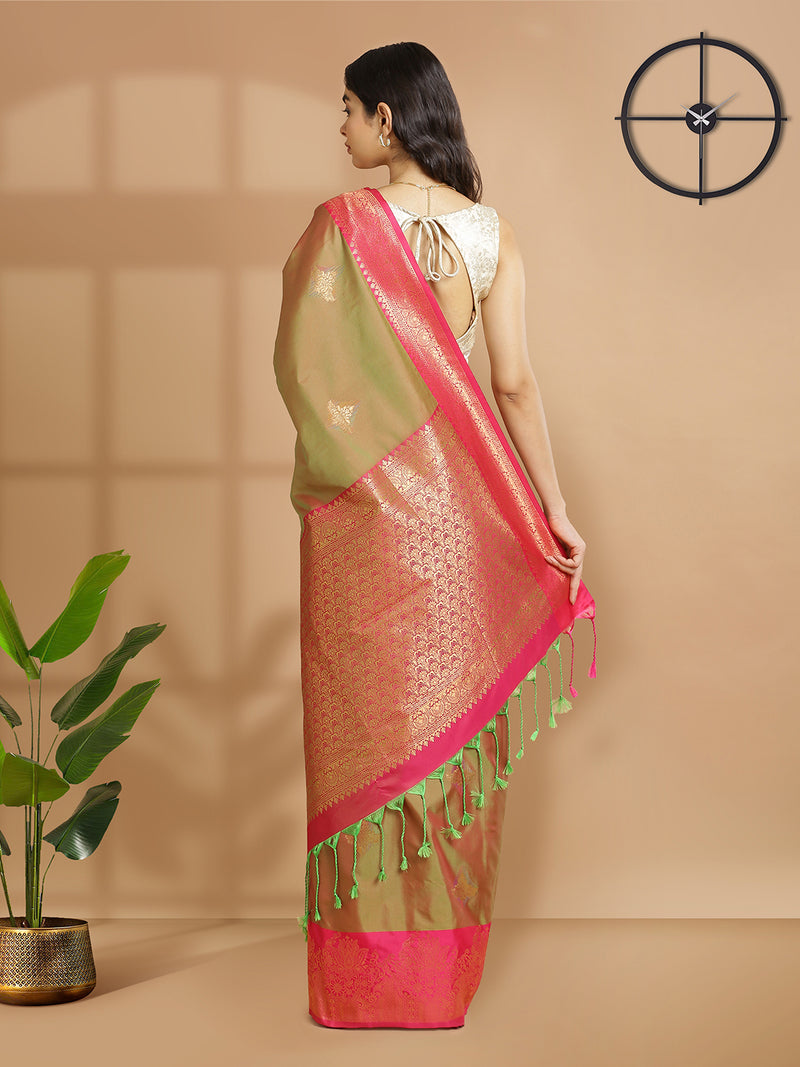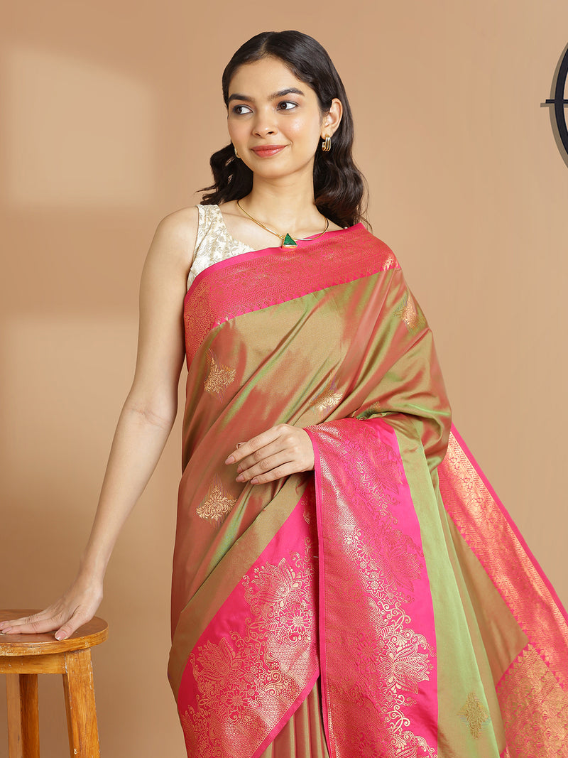 Olive Green Art Silk Saree With Copper Color Buttas And Pink Border