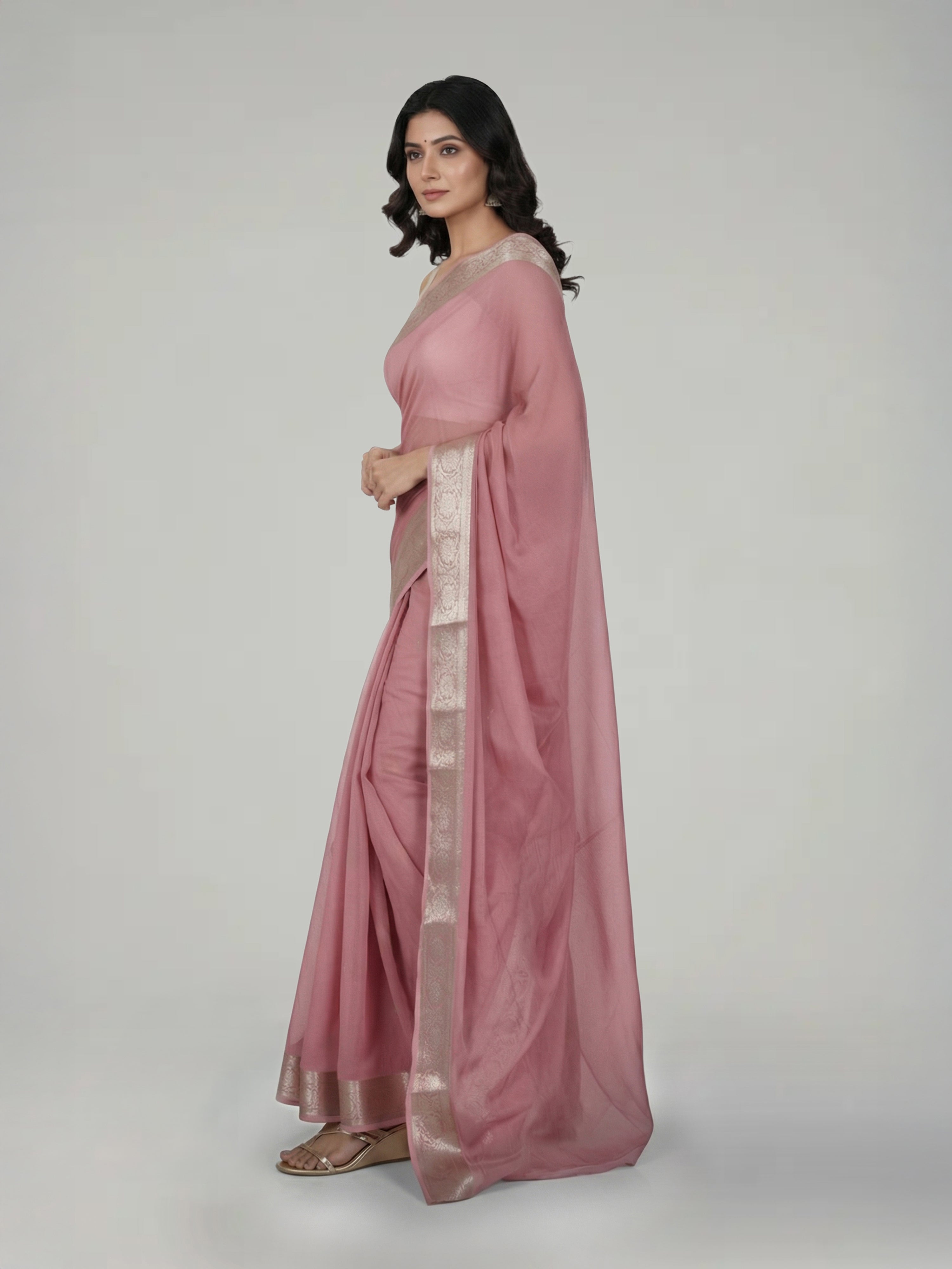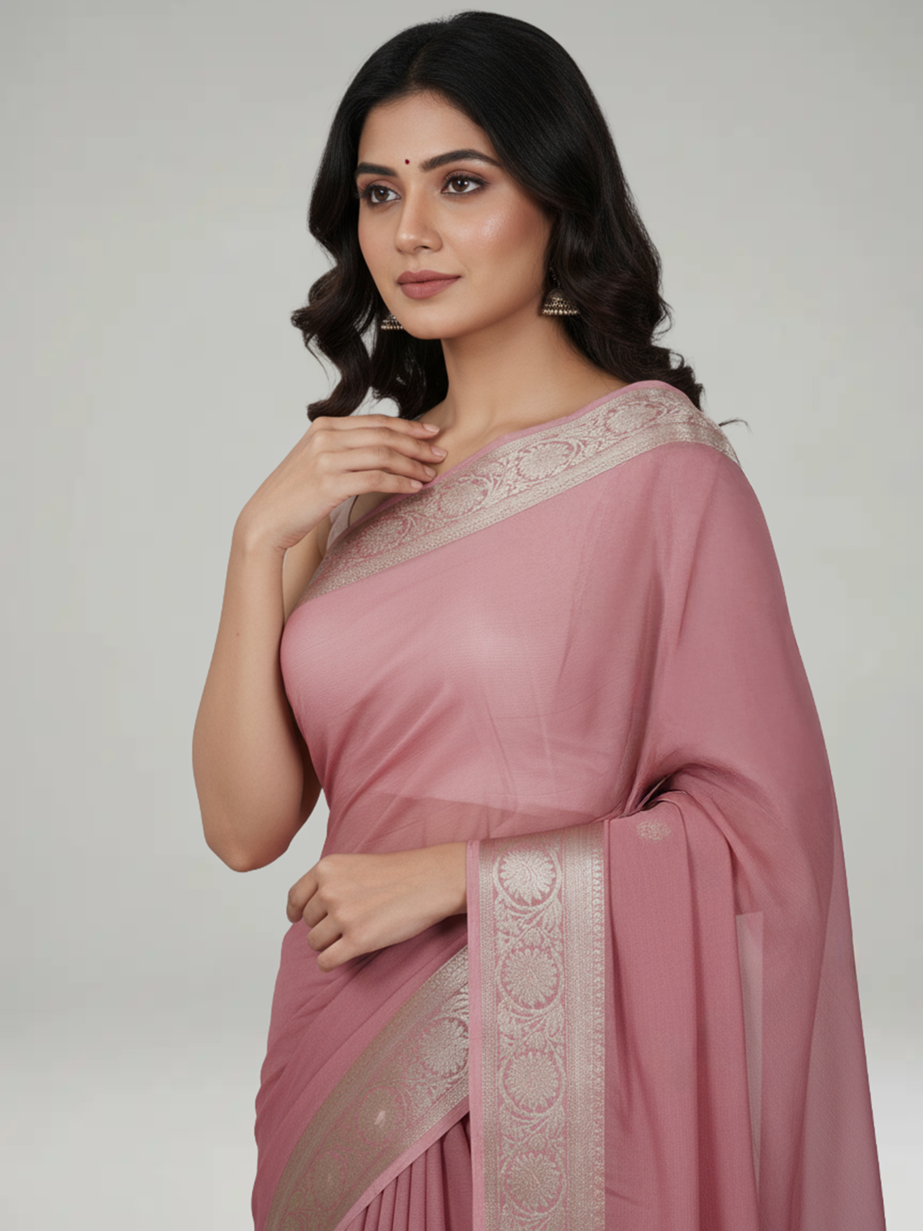 Elegant Banarasi saree in soft onion pink, crafted from fine georgette silk with delicate butta design and rich Banarasi detailing for a timeless look.