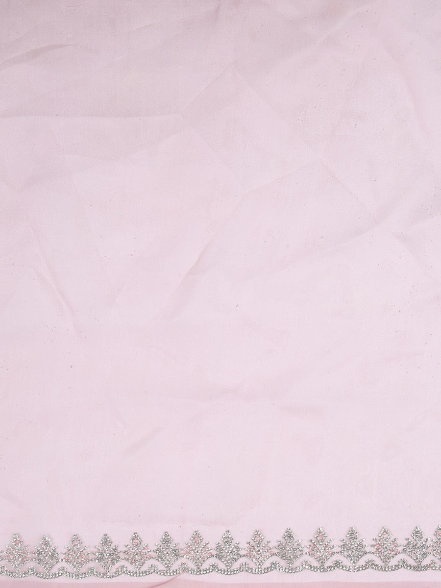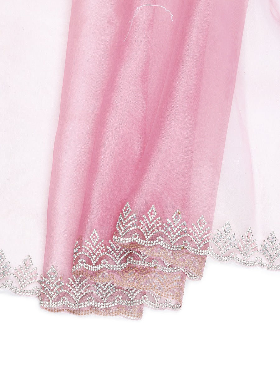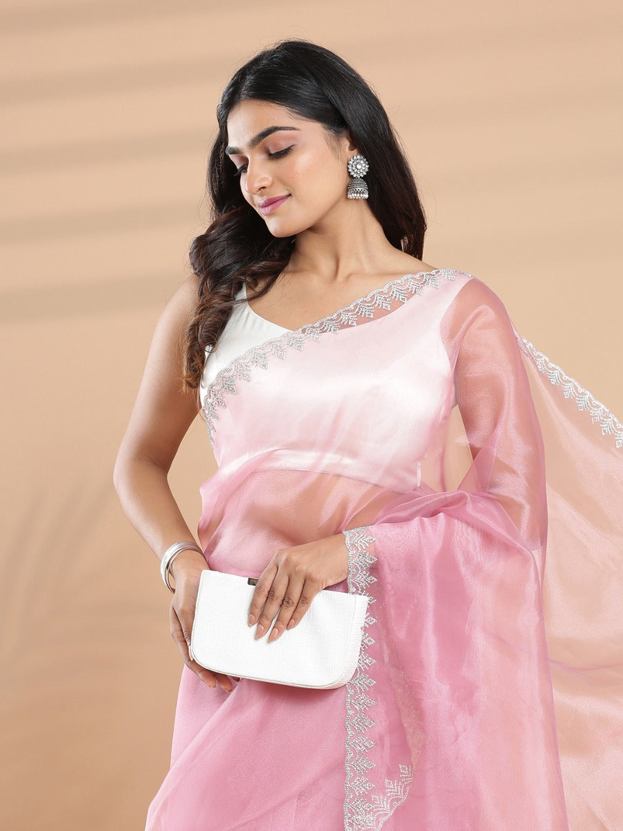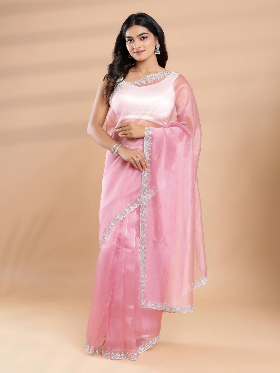 Onion Pink Color Organza Plain Saree With Stone Worked Scalloped Border & Blouse