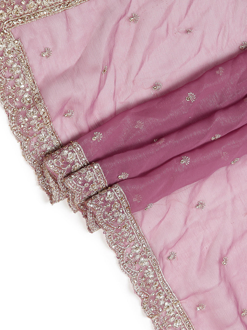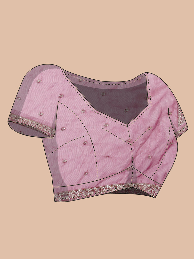 Make a statement in this onion pink georgette tissue saree, featuring intricate golden thread and stone embellishments all over the body. The blend of fabrics ensures a luxurious sheen and graceful drape.