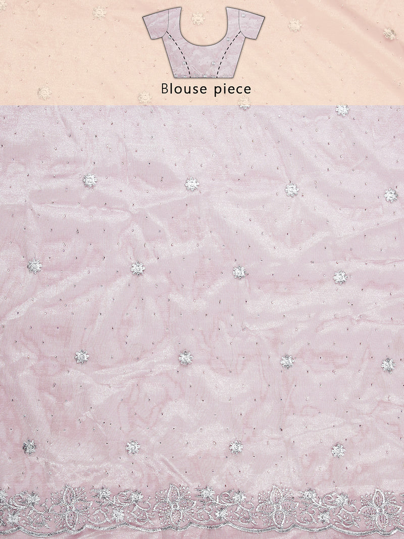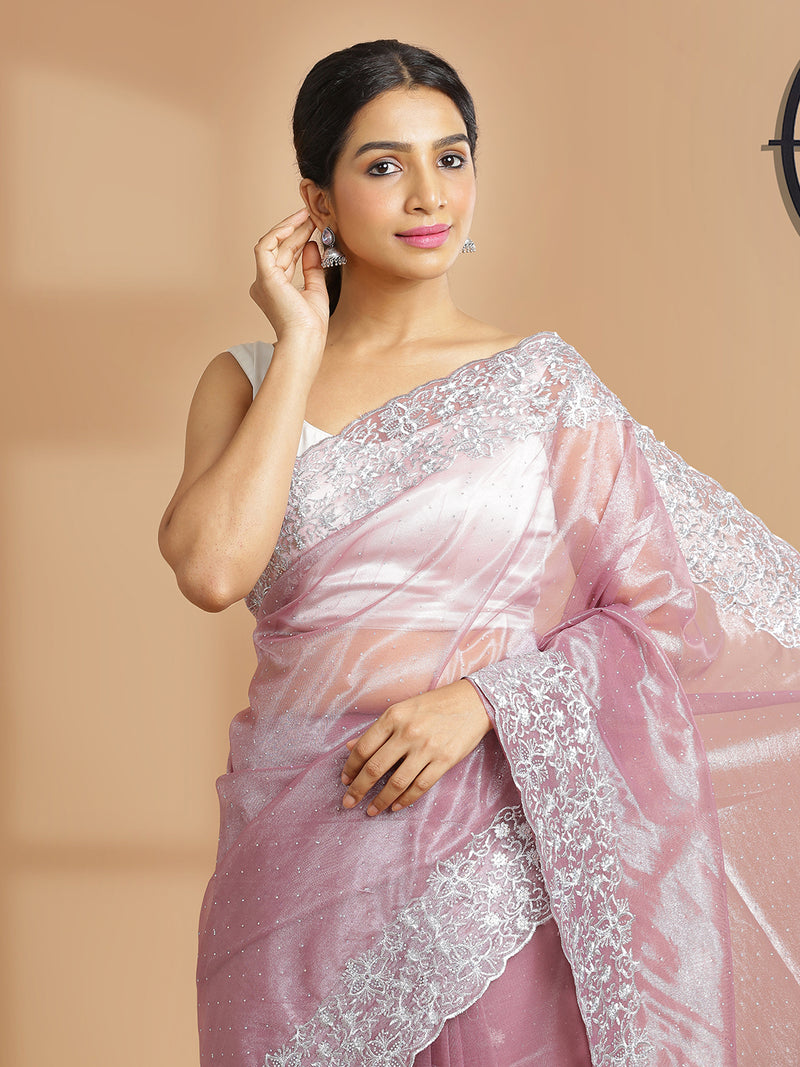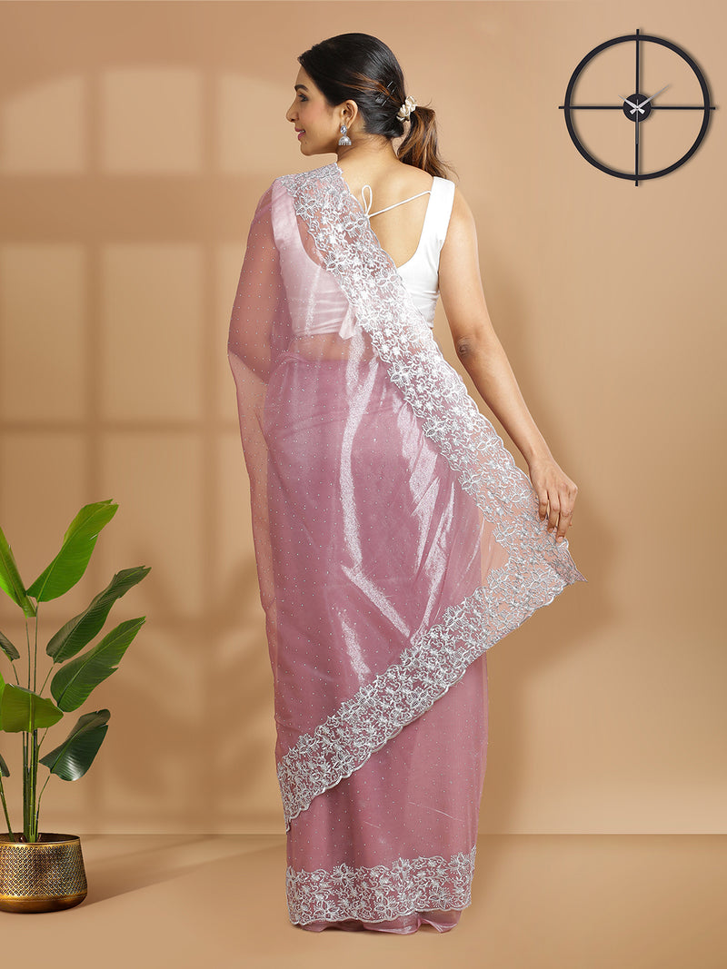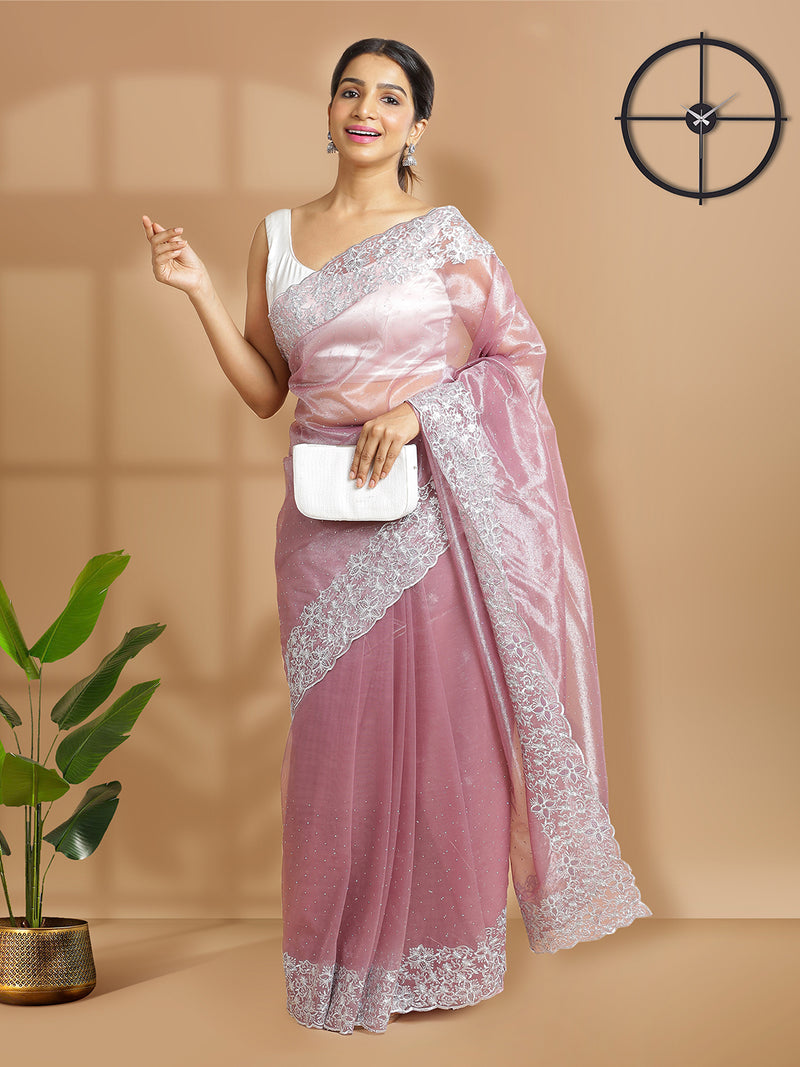 Onion Pink Net Tissue Saree With Multi Mini Stones Over Body
