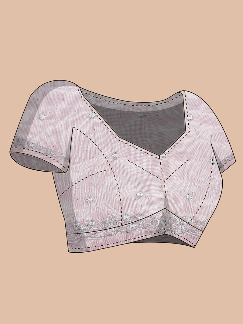 Celebrate festive moments with this onion pink net tissue saree, adorned with multiple mini stones that add sparkle across the body. The light and airy fabric ensures comfort and style for special occasions.