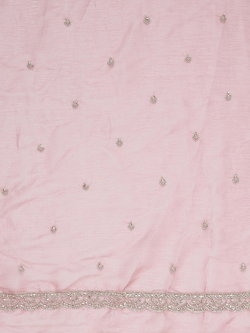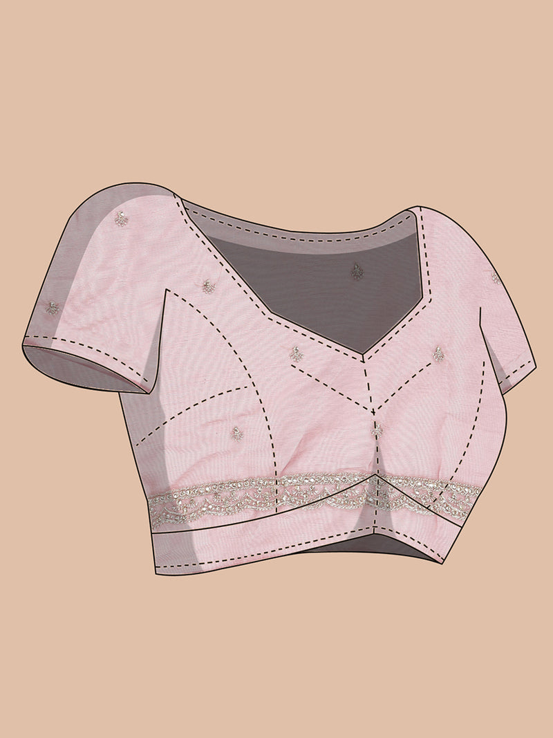 Delight in the delicate beauty of this onion pink organza saree, featuring intricate thread and stone work embellishing the body. The light weight fabric offers a graceful drape, perfect for festive occasions and elegant gatherings.