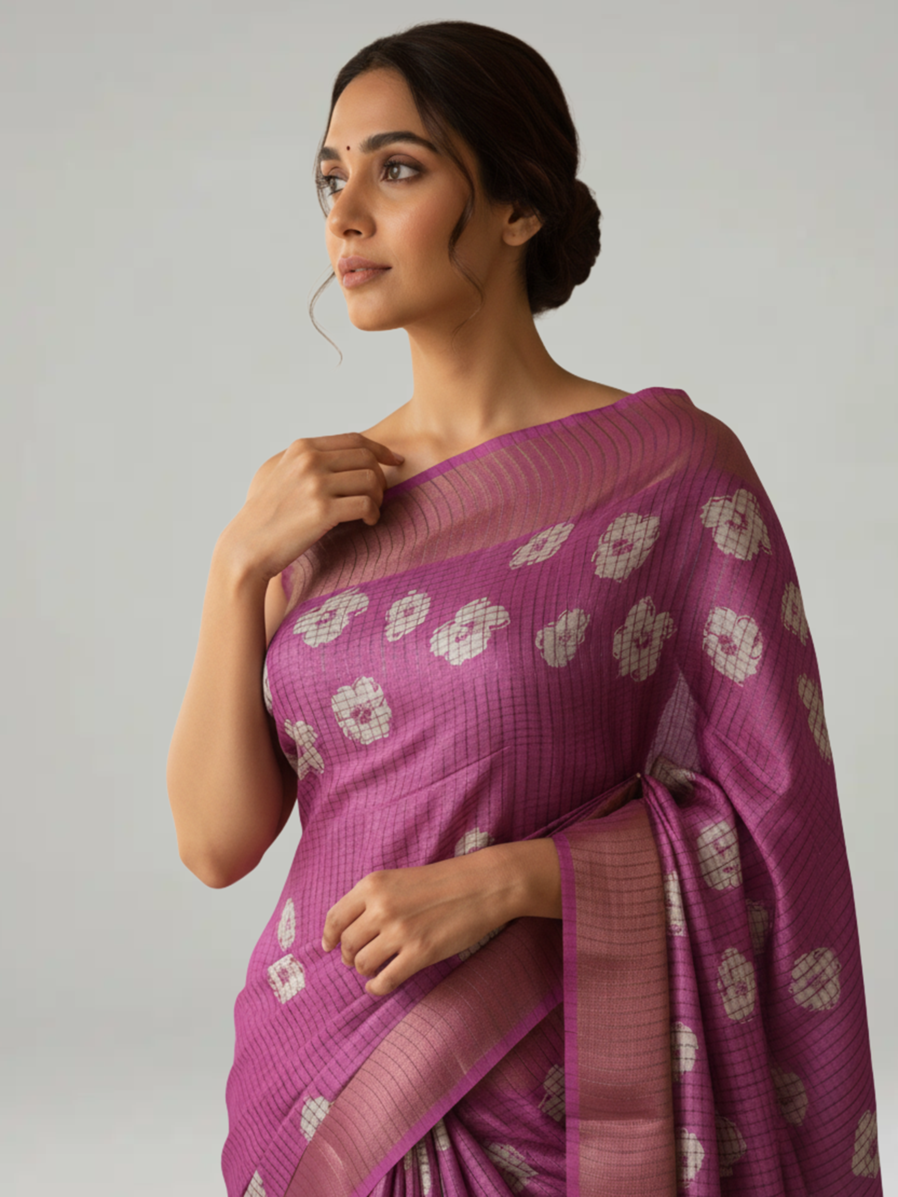 Onion Pink Semi Tusser Check with spreaded Floral Design Saree