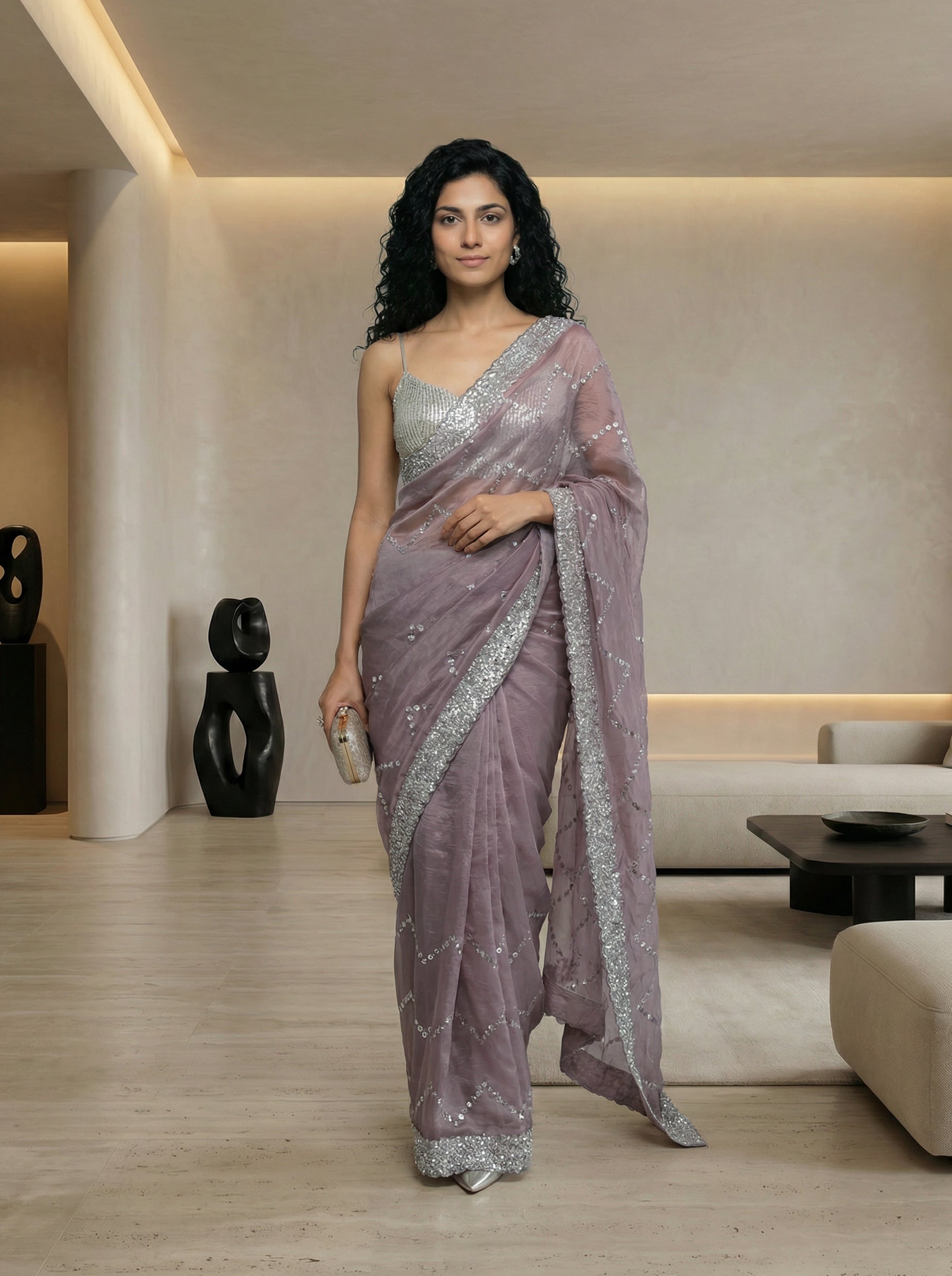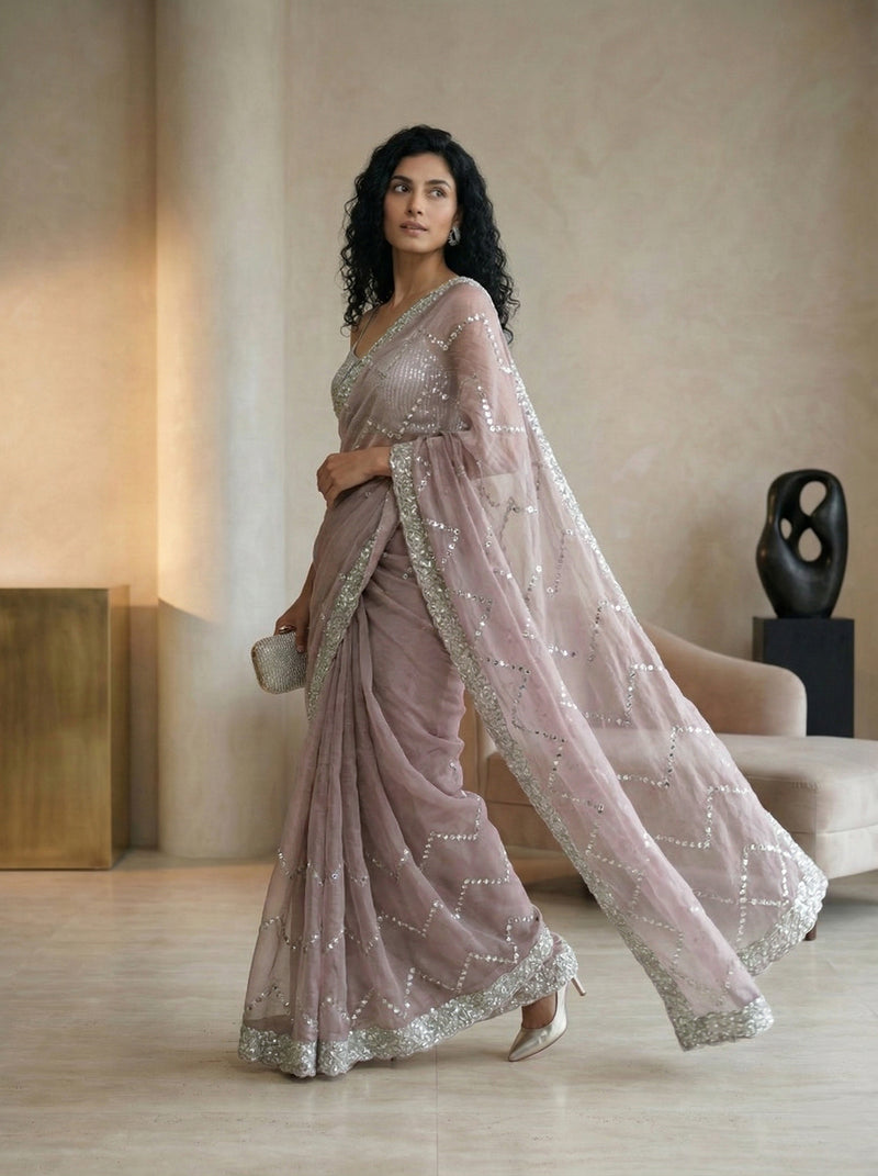 Organza Dusty Mauve Sequin Pattern Designer Saree