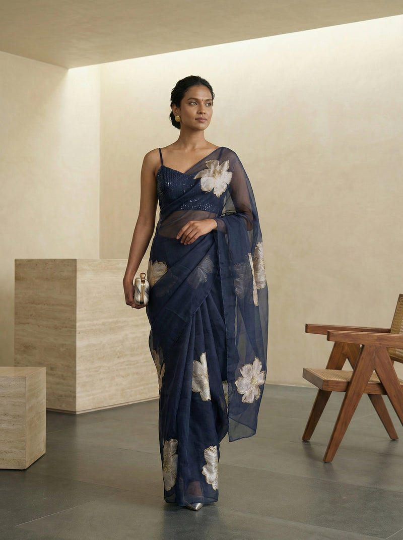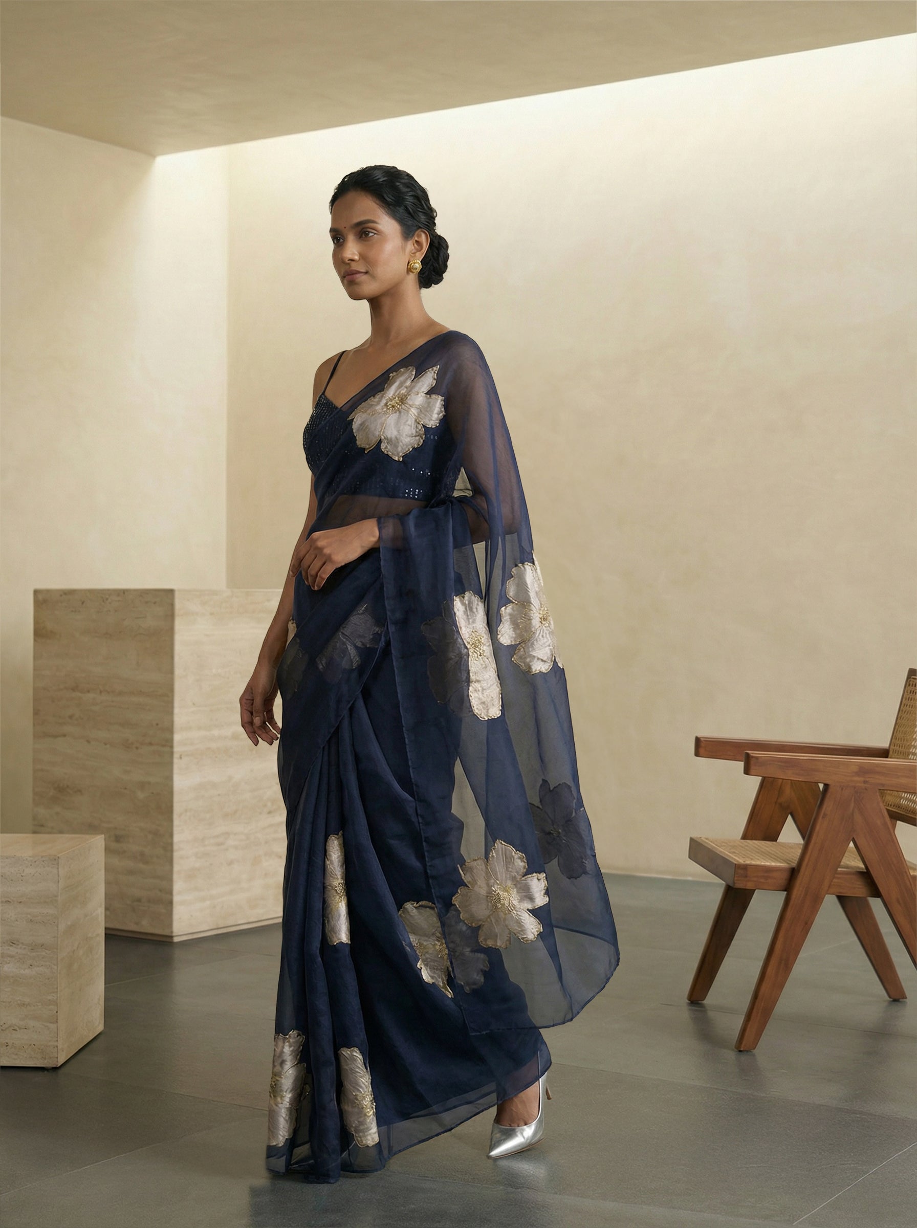 Organza Navy Blue Gold Floral Pattern Designer Saree