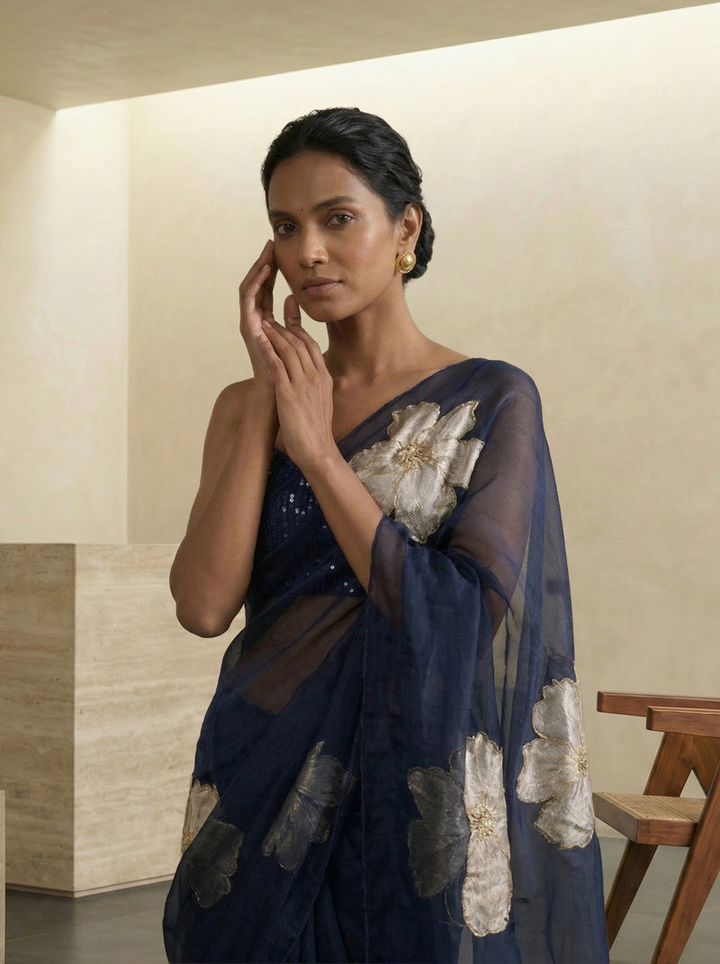 This exquisite organza saree combines timeless grace with modern design sensibilities. Draped in navy blue with ornate gold floral motifs, it captures the essence of traditional Indian craftsmanship. The organza fabric's natural fluidity creates an elegant silhouette while maintaining breathability, ideal for weddings, festivals, and special occasions. Each gold detail reflects meticulous artistry, making this designer piece a versatile investment for your festive collection. A perfect blend of heritage and contemporary style.