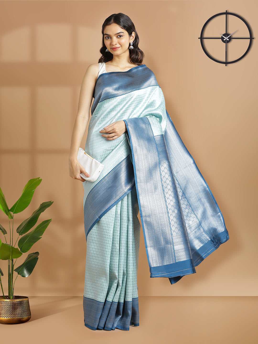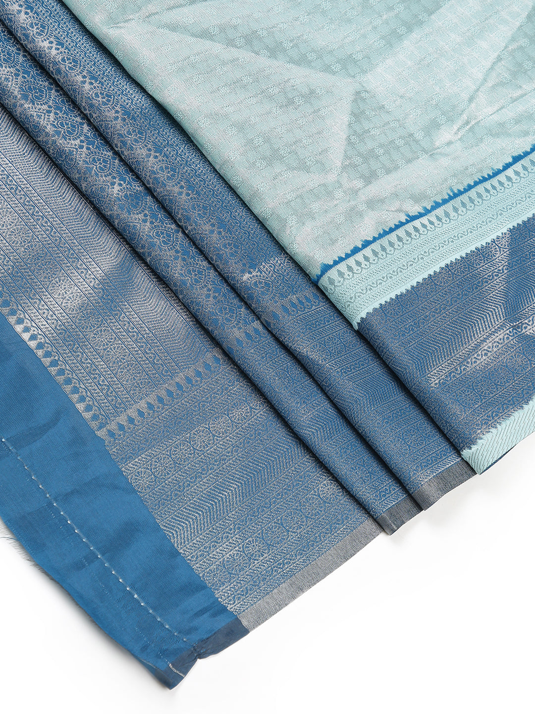 Timeless and elegant, this pale blue art silk saree is embellished with detailed silver temple motifs throughout the body. The exquisite craftsmanship makes it perfect for formal and festive wear.