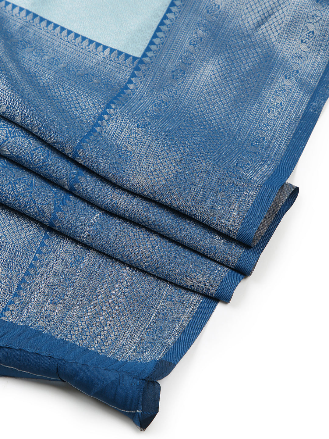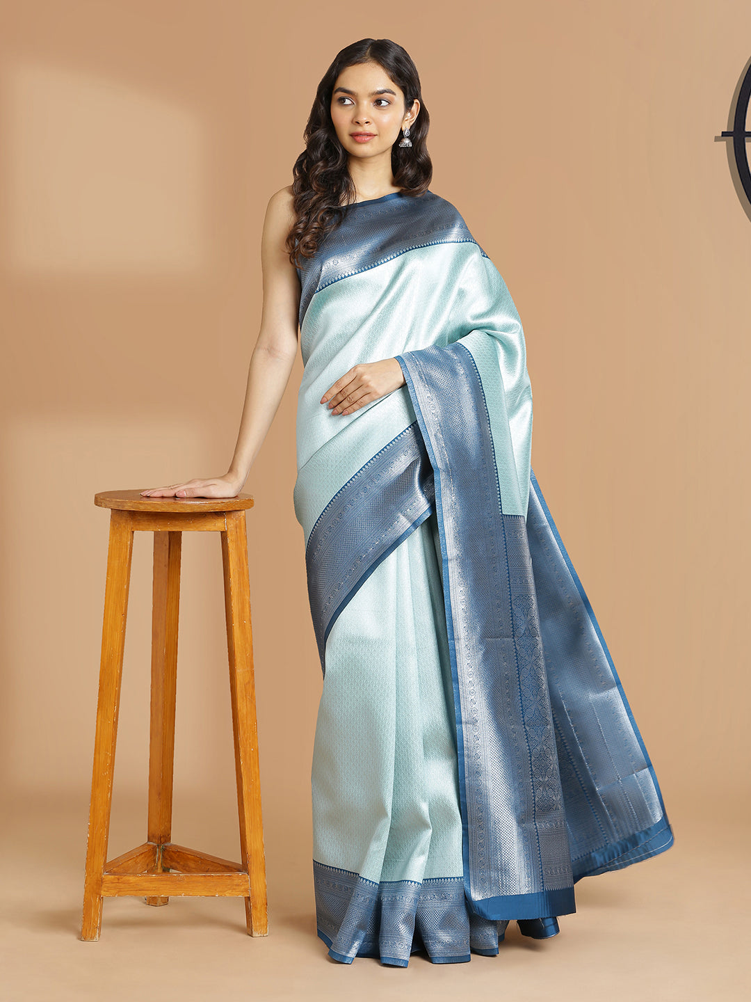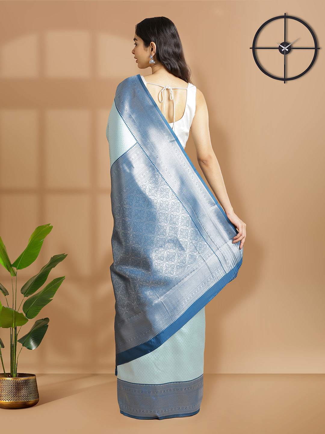 Pale Blue Color Silver Woven Designed Art Silk Saree With Peacock Blue Border