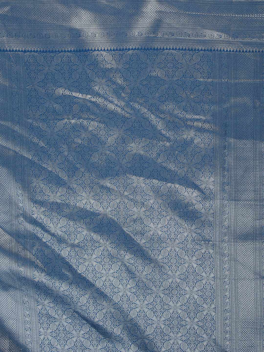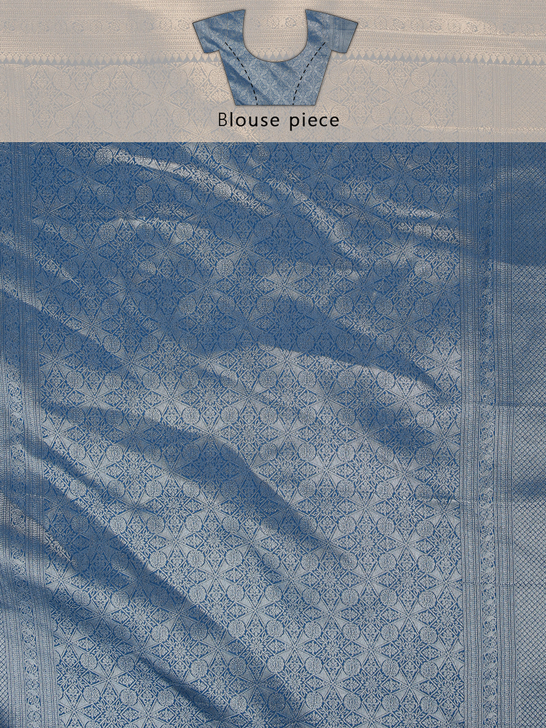 This pale blue art silk saree features delicate silver woven designs paired with a rich peacock blue border, creating a striking look ideal for weddings and celebrations.