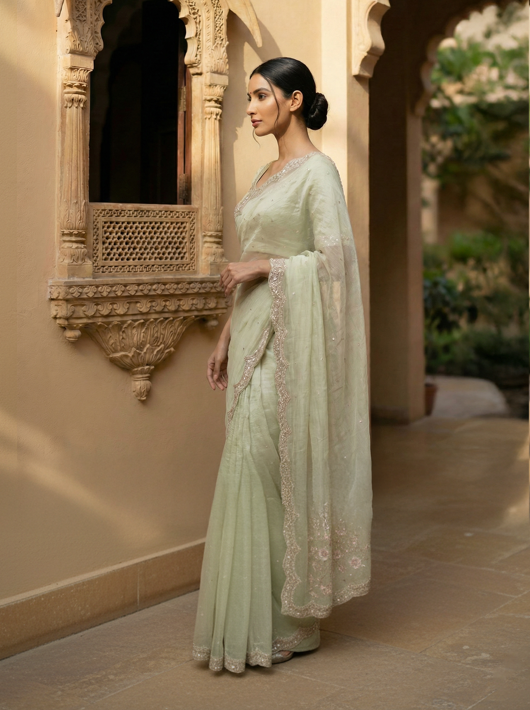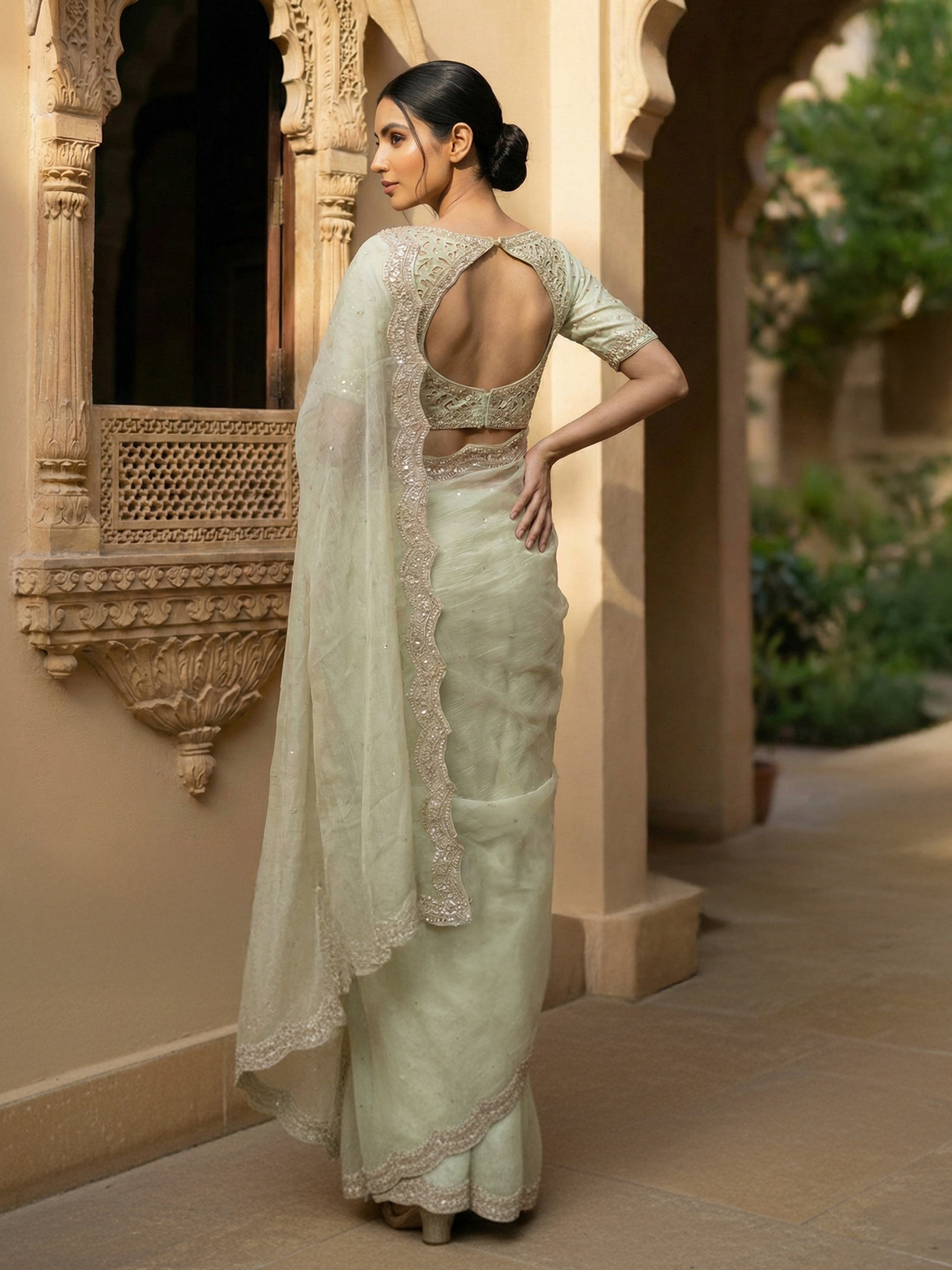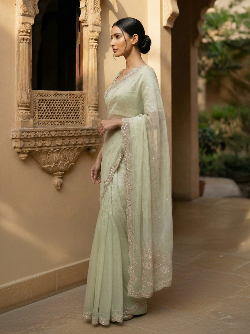 Pale Green Designer Organza Saree with Bead Work & Scalloped Embellished Border