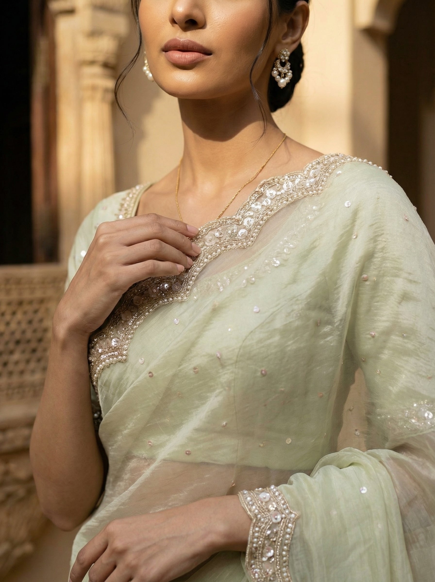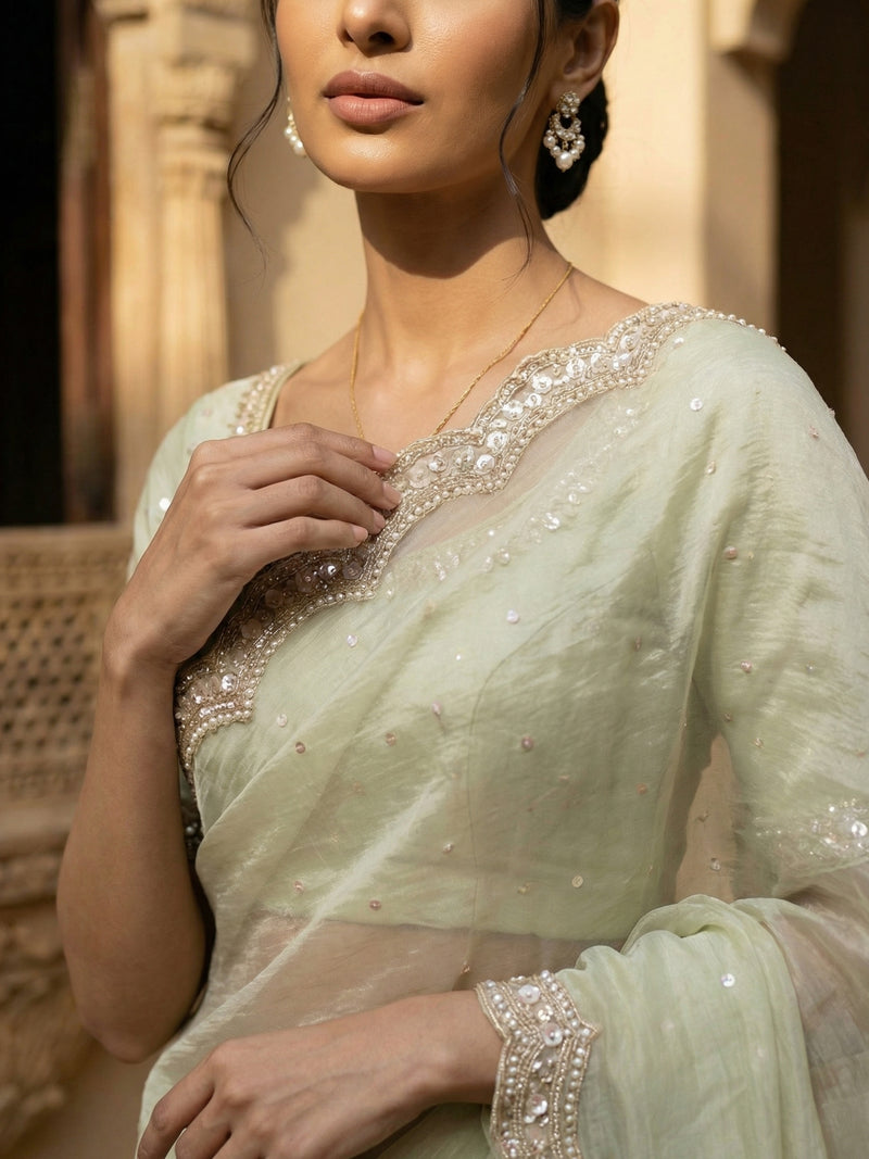Paired with a matching pale green blouse featuring coordinated bead and embellished detailing on the neckline and sleeves, this saree is perfect for receptions, engagements, festive occasions, and elegant celebrations.
