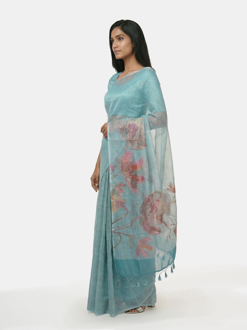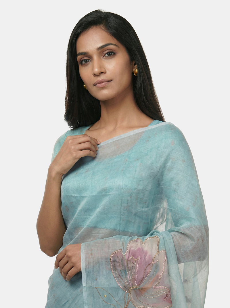 Organza Party Wear Pastel Blue Saree with Artistic Digital Design